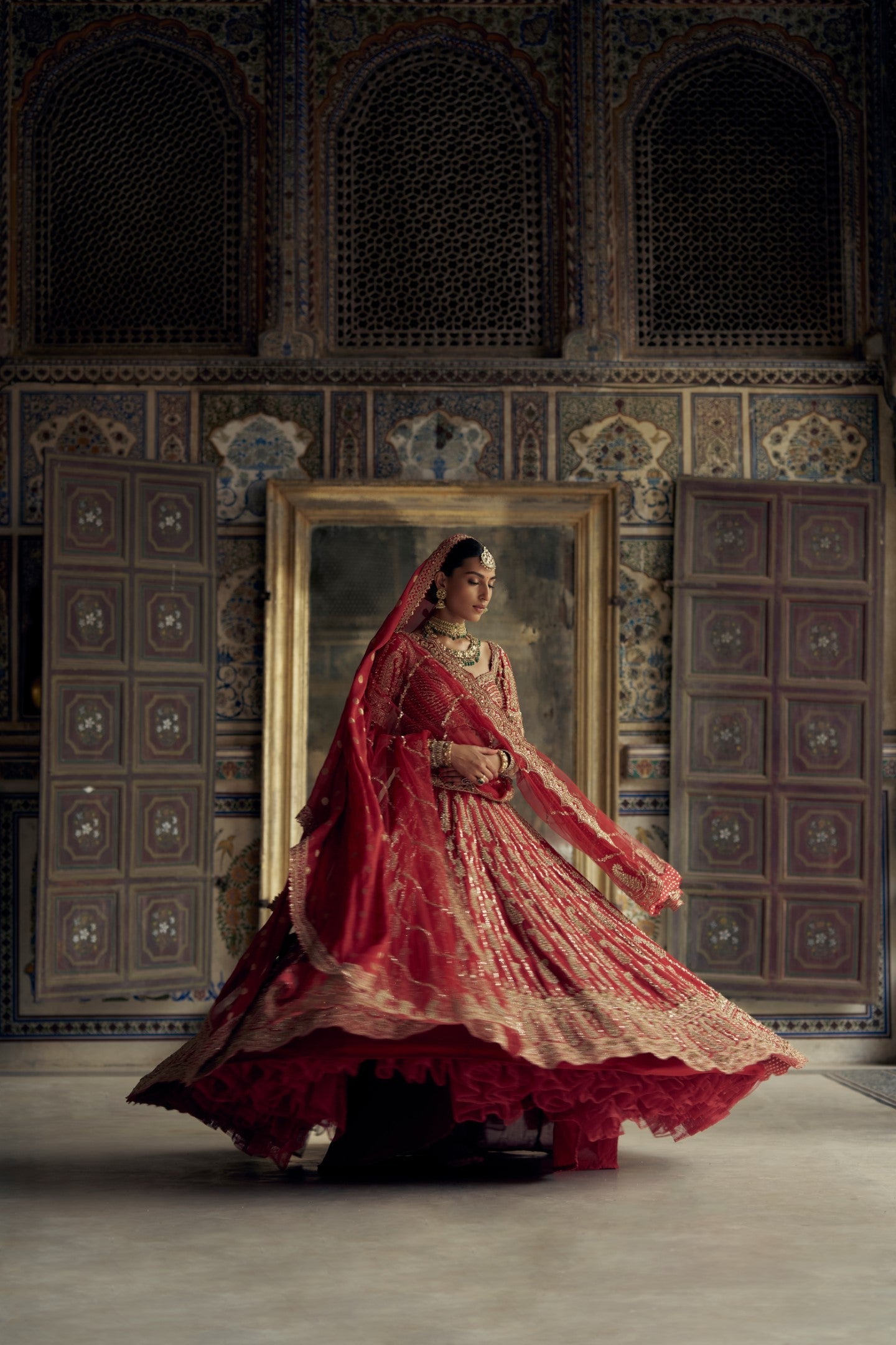 Deep red raw silk lehenga choli set with a tulle dupatta embroidered in antique kasab, Doridabka, beadwork and sequins. It comes with an optional worked second dupatta and belt which can be ordered separately.