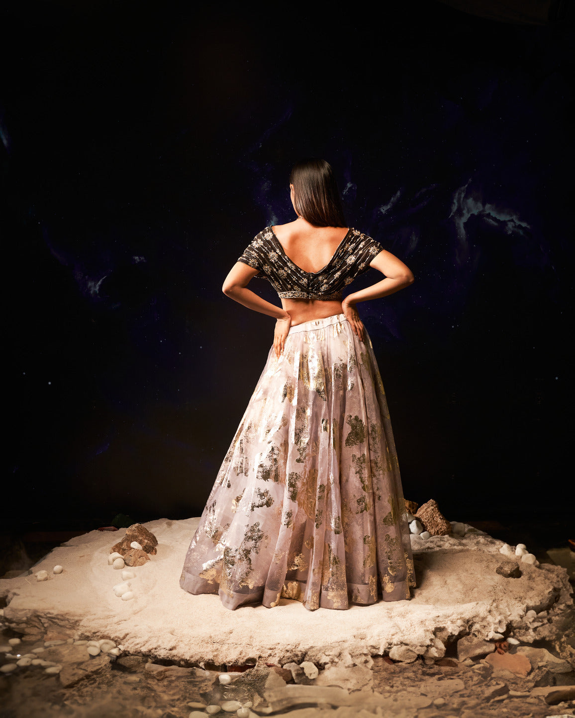 Dejouer- Plunge Neck Hand Embroidered Lilac Foil Print Lehenga Set