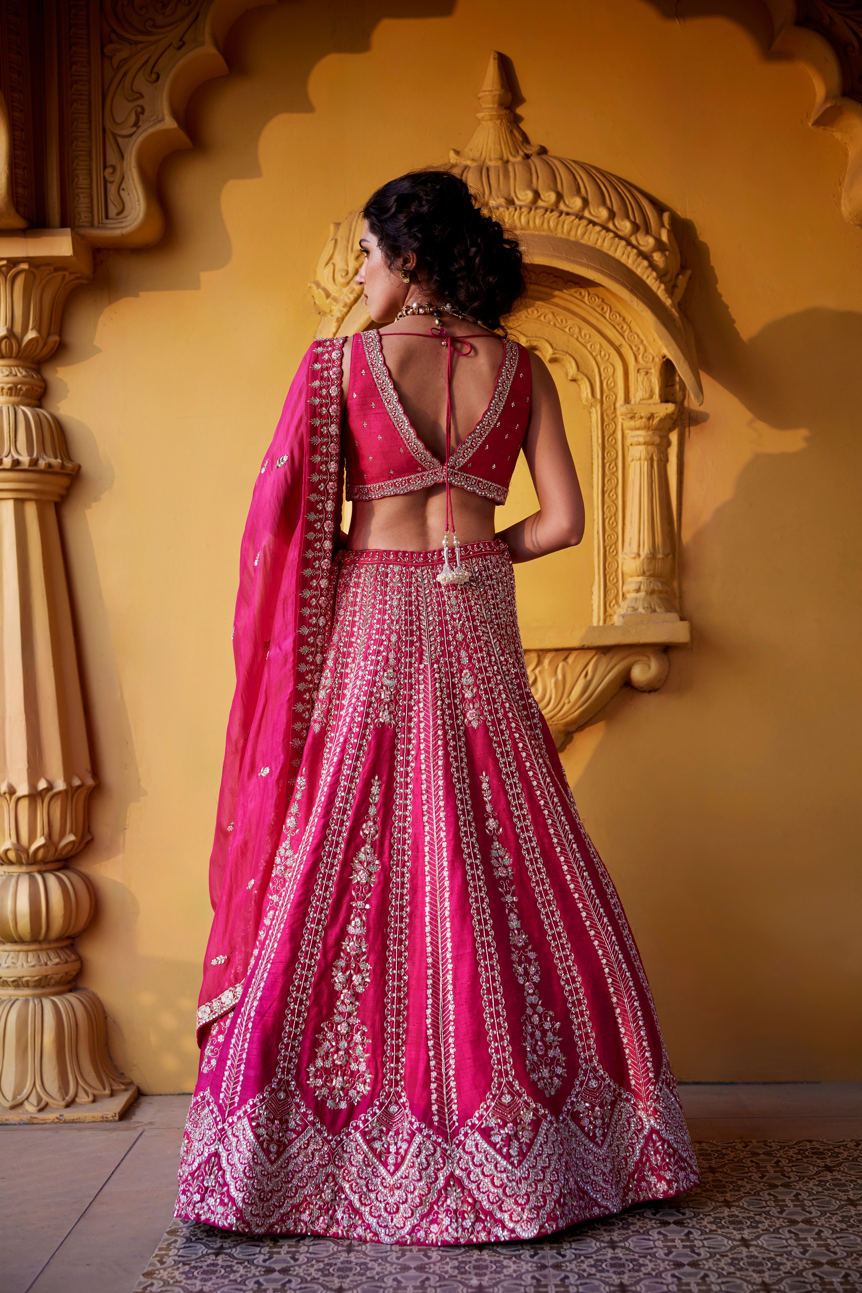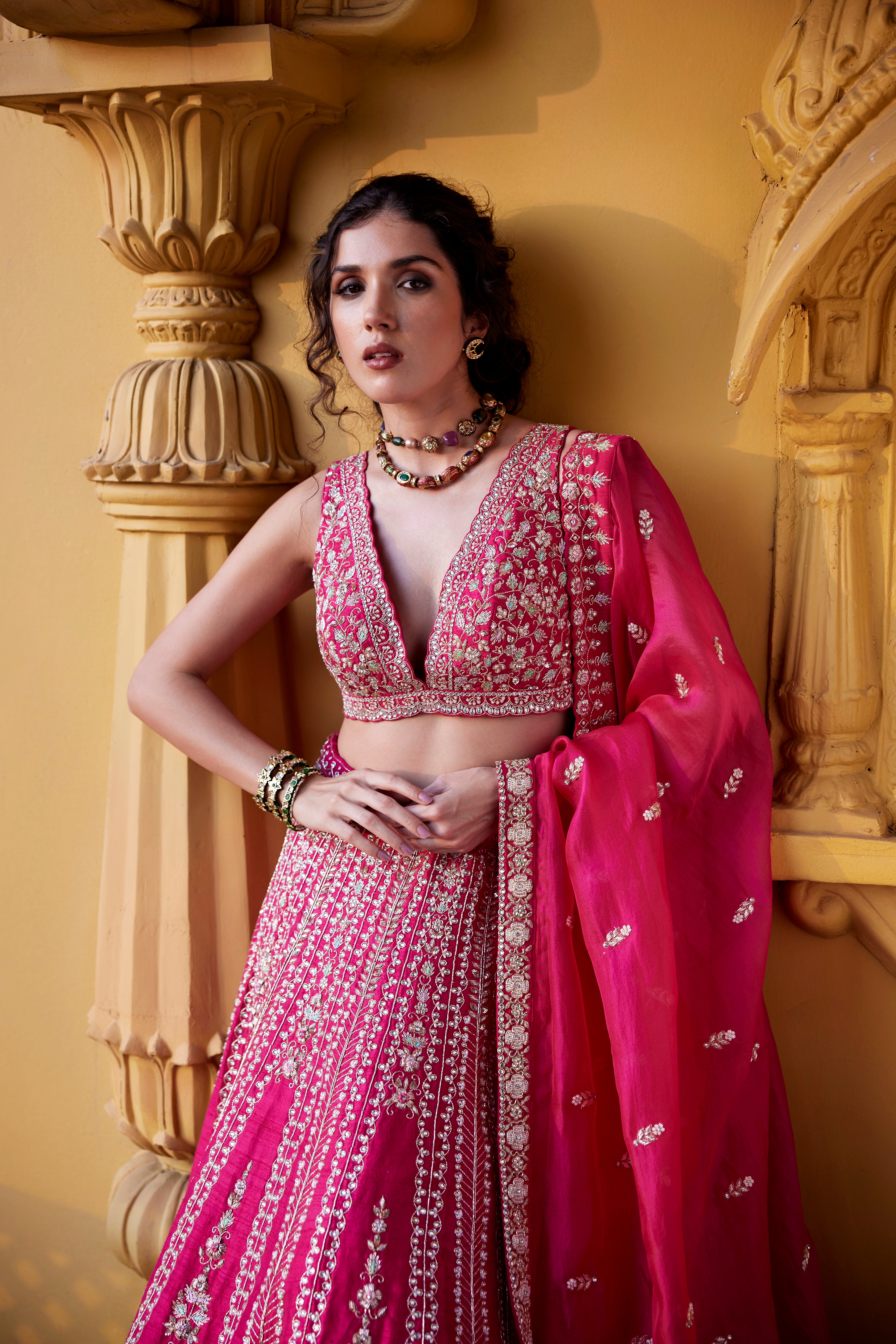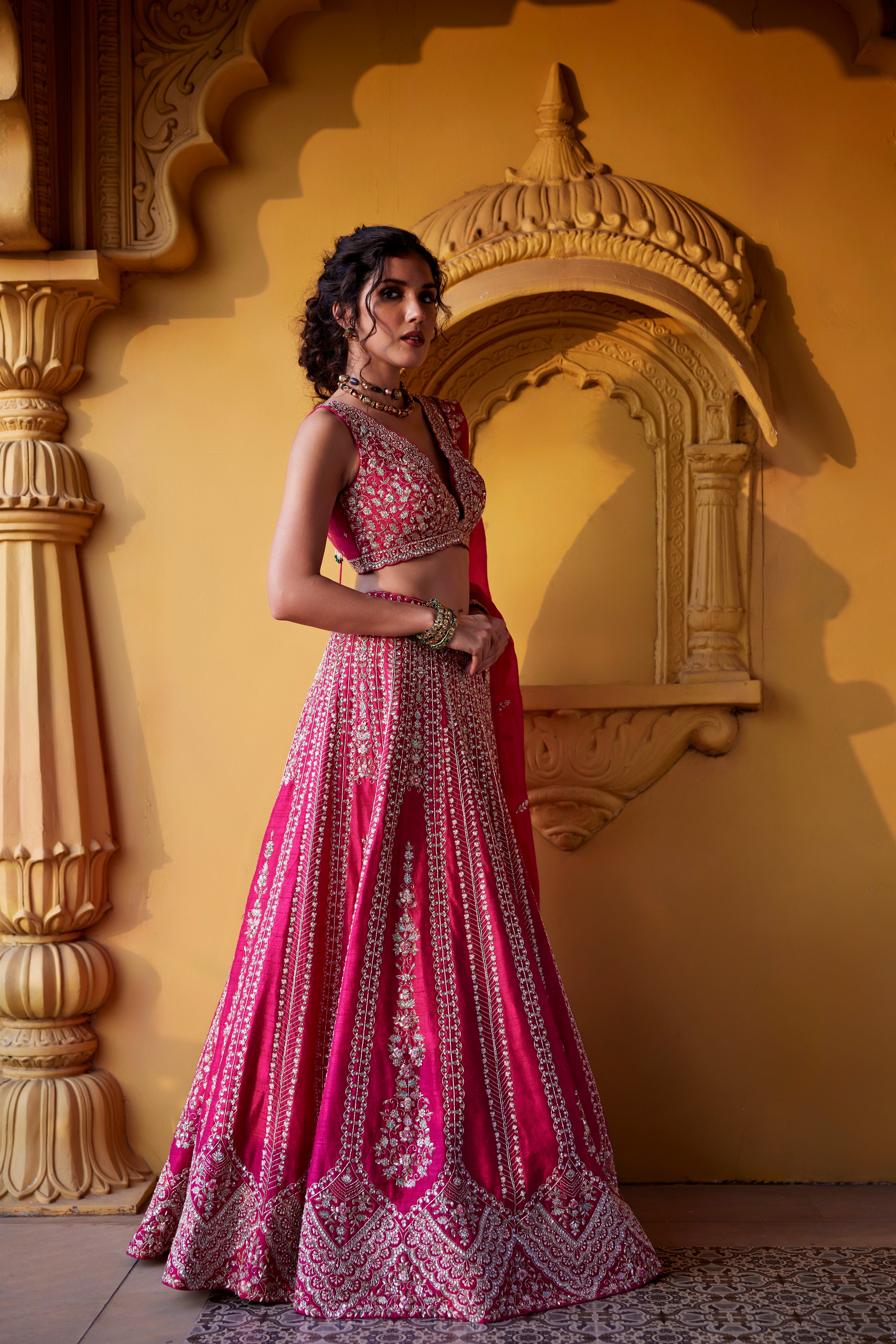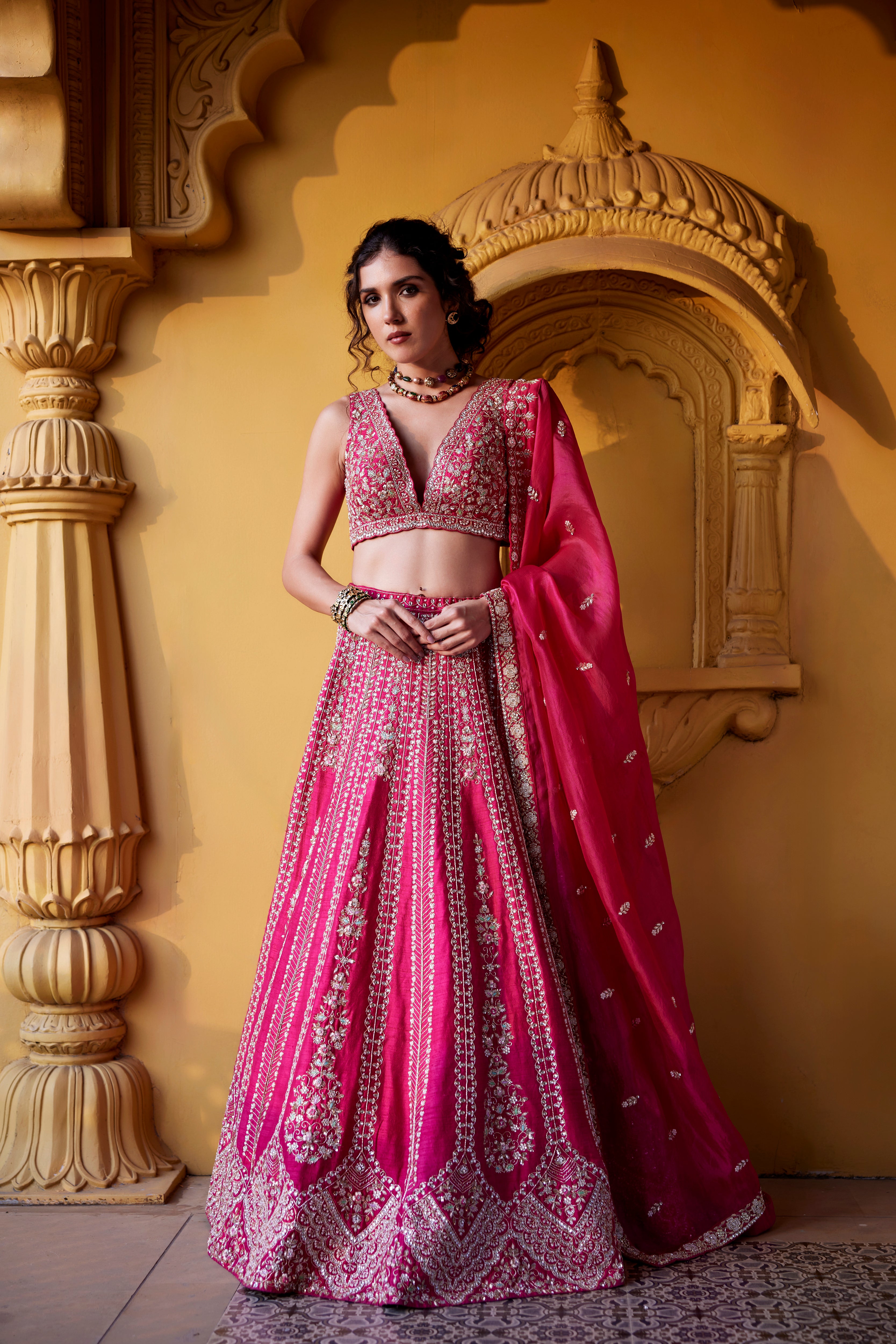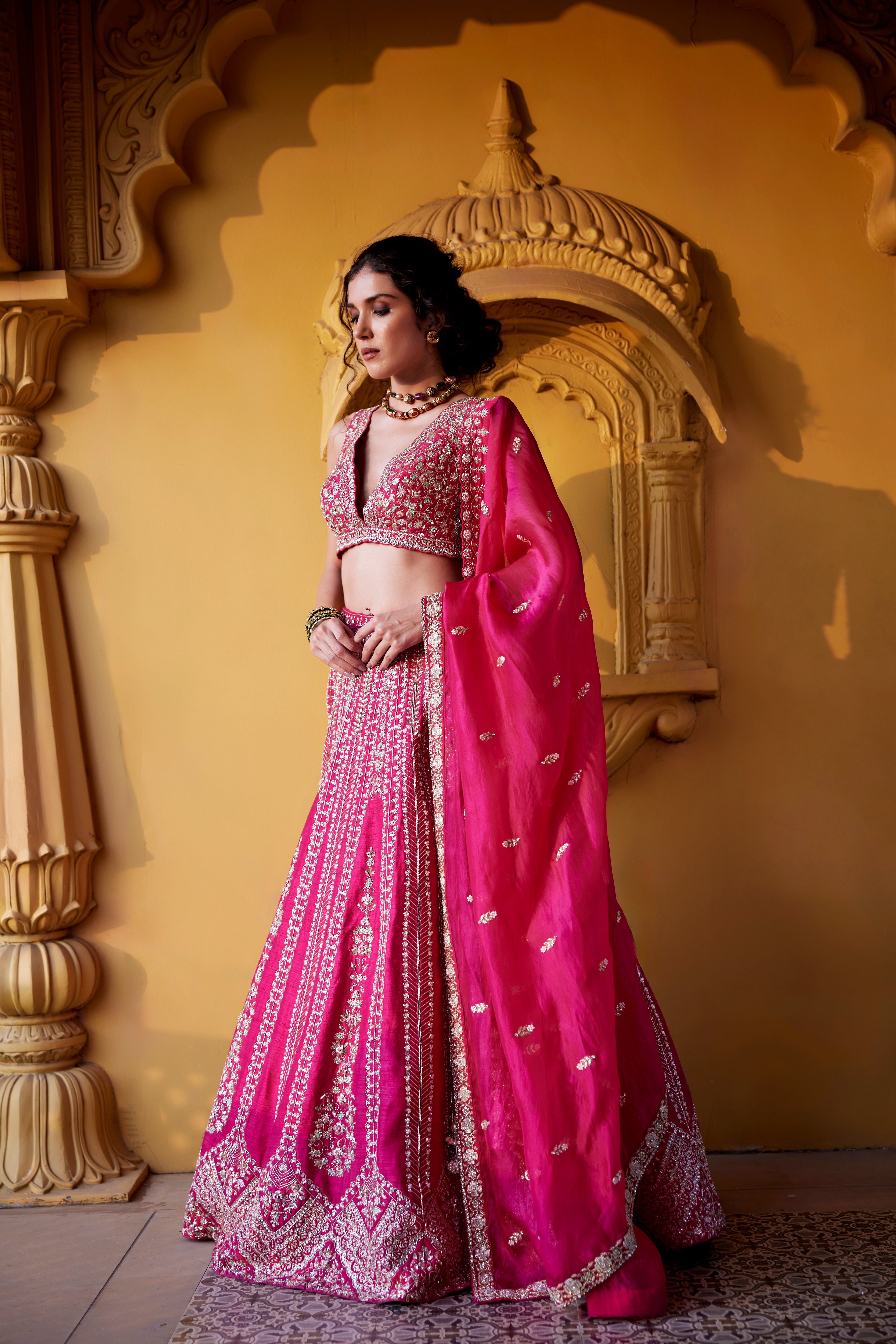 Pink raw silk flared skirt with intricate zardozi, kundan, glass beads and resham embroidery paired with deep v neckline raw silk embroidered blouse and organza dupatta with embroidered borders and zardozi and pearl buttis.