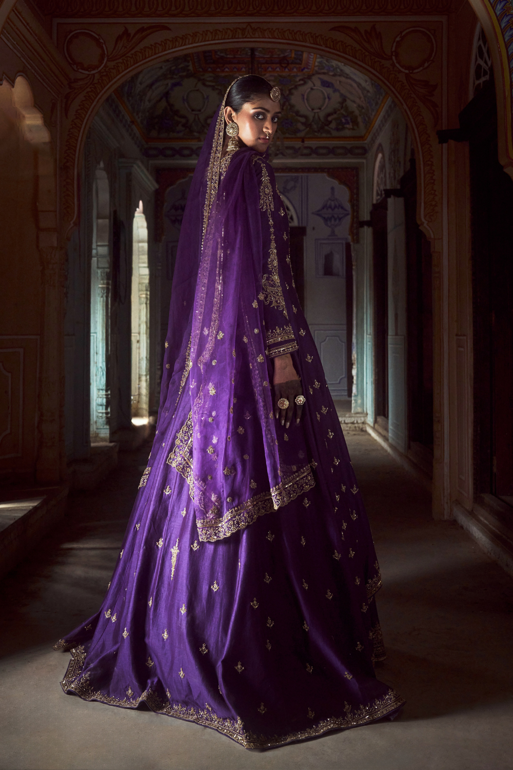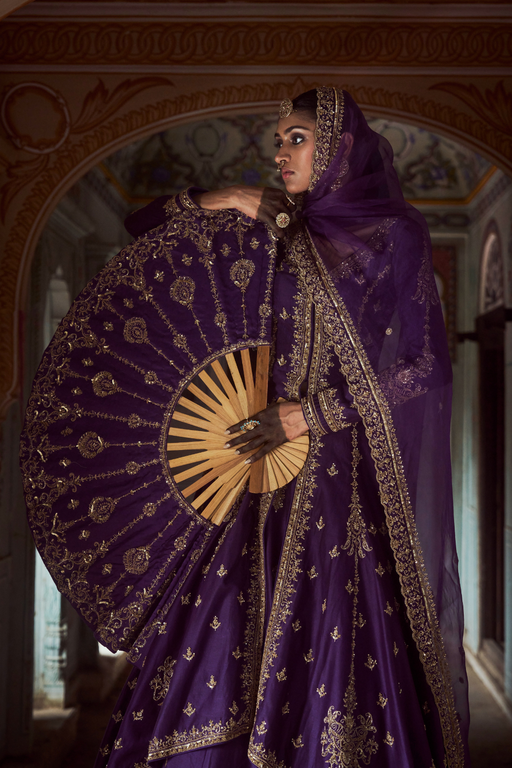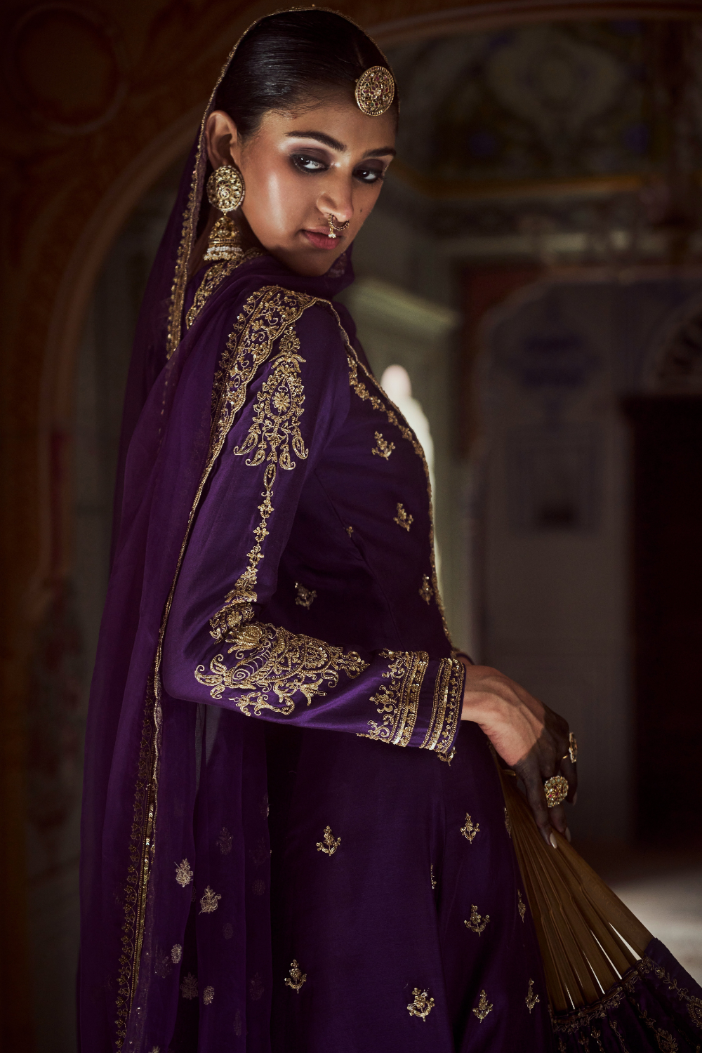 Featuring a purple chanderi silk jacket set paired with a skirt and organza base dupatta with antique gold dori and embellished hand embroidery.
