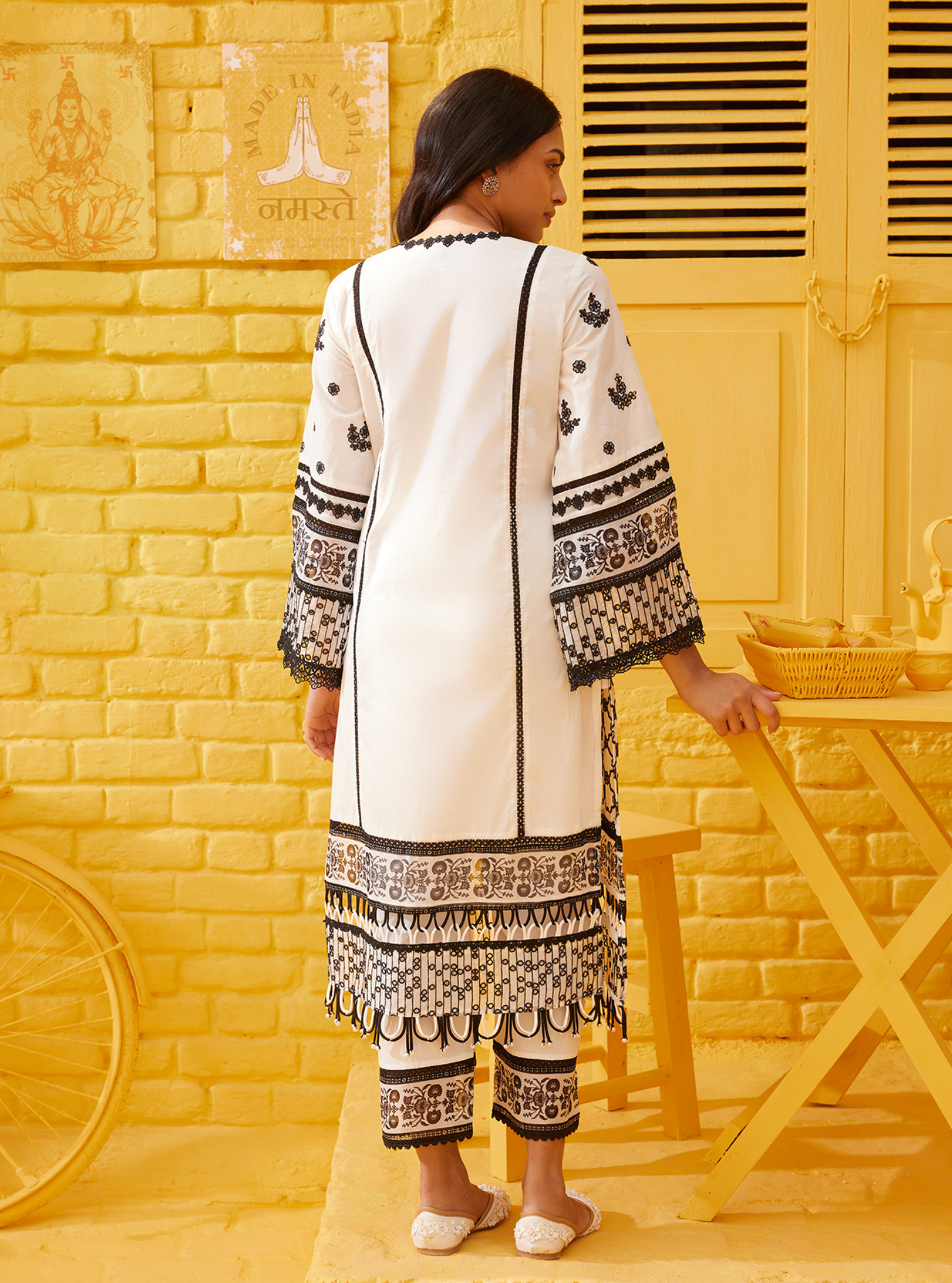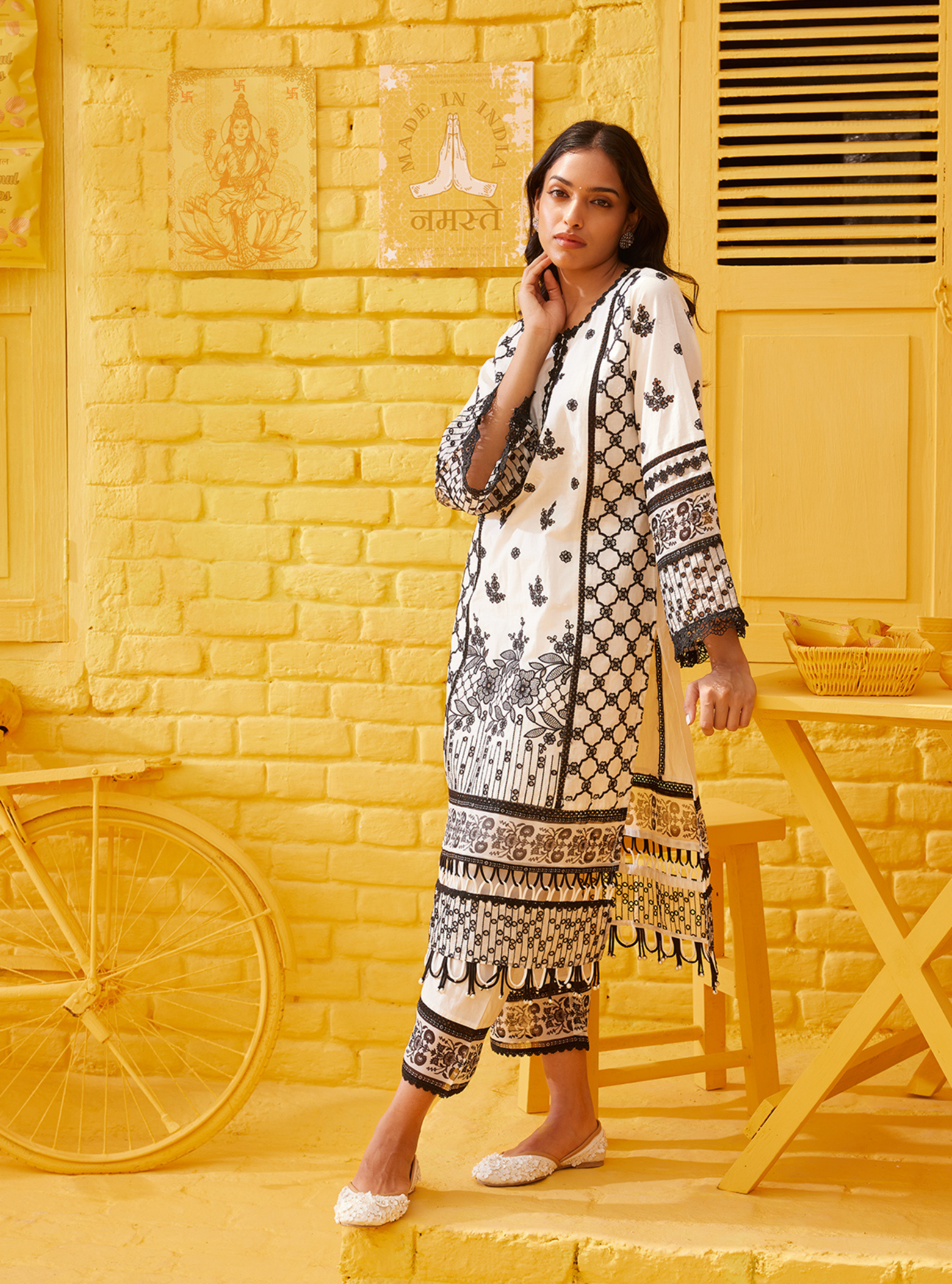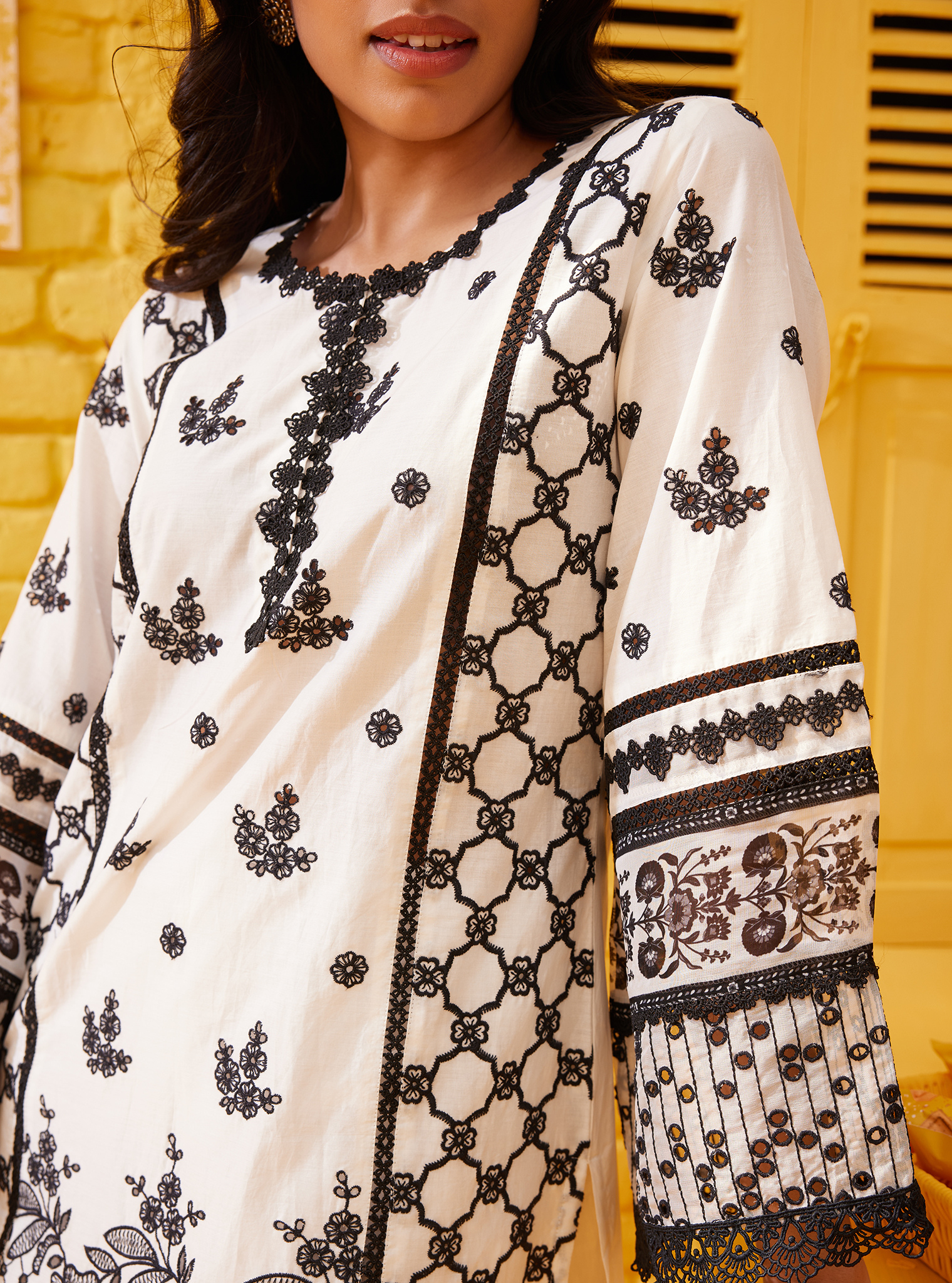 Contact Us For CustomizationThis captivating kurta set is a masterpiece of intricate patterns and ethereal charm. The ensemble features a serene white base adorned with various black motifs, ranging from delicate floral designs to bold geometric patterns. The kurta has a relaxed yet sophisticated silhouette, accentuated by flowing sleeves and a gracefully rounded neckline, and the hemline is adorned with lace and pearl detailing.