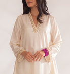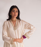 An A-line kurta set in Ivory, paired with straight pants embellished with intricate antique gold zardozi embroidery.