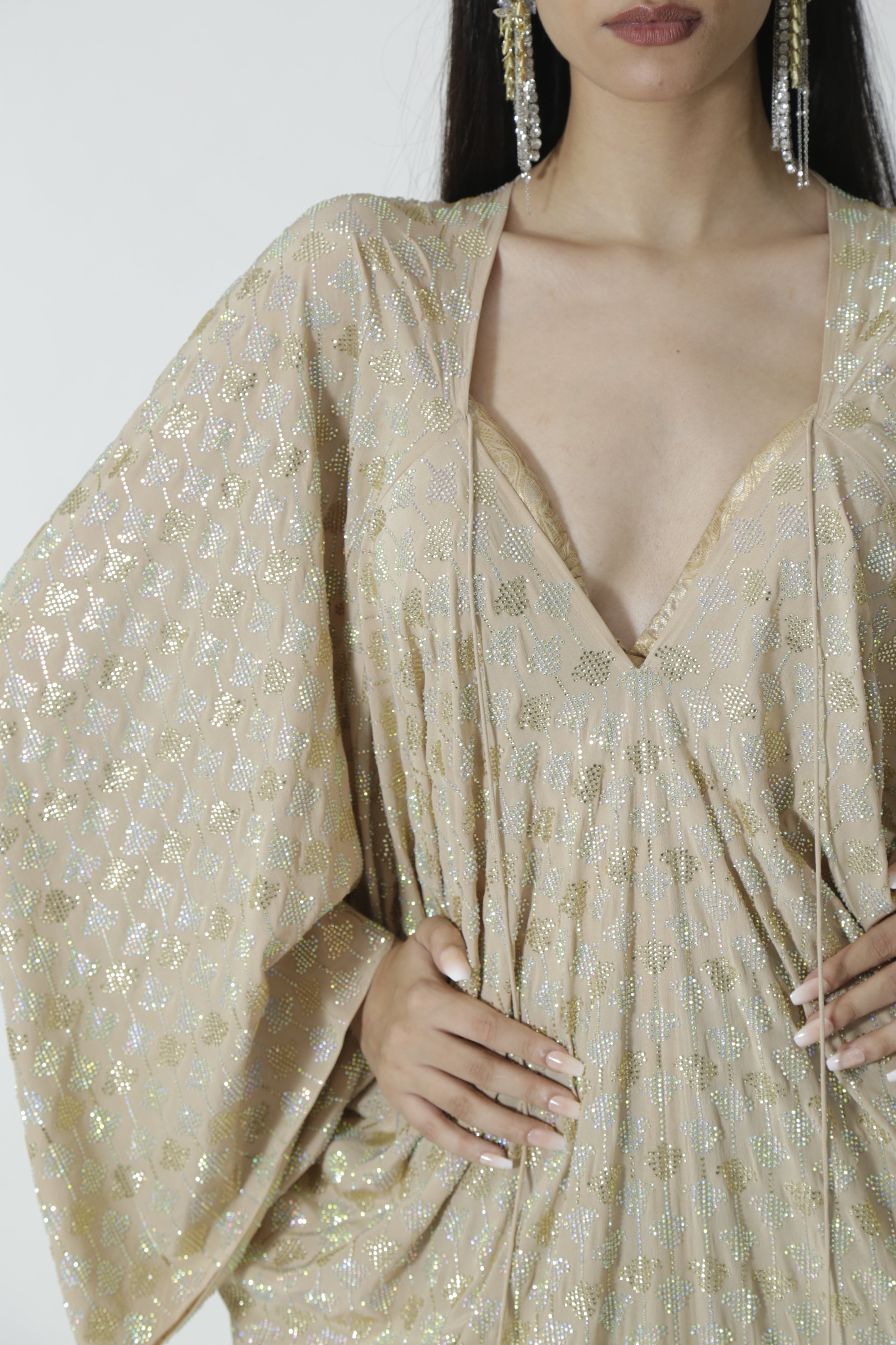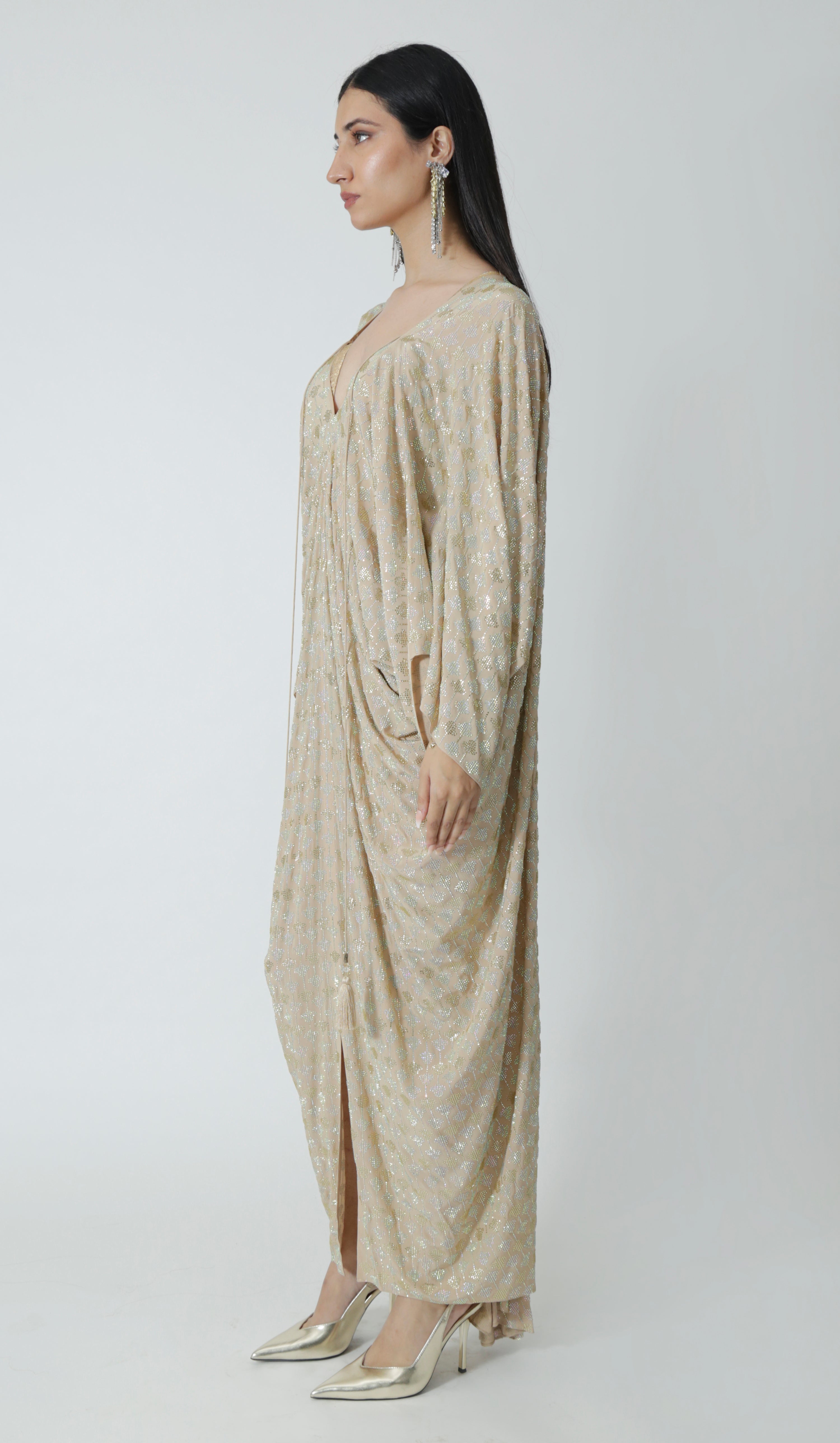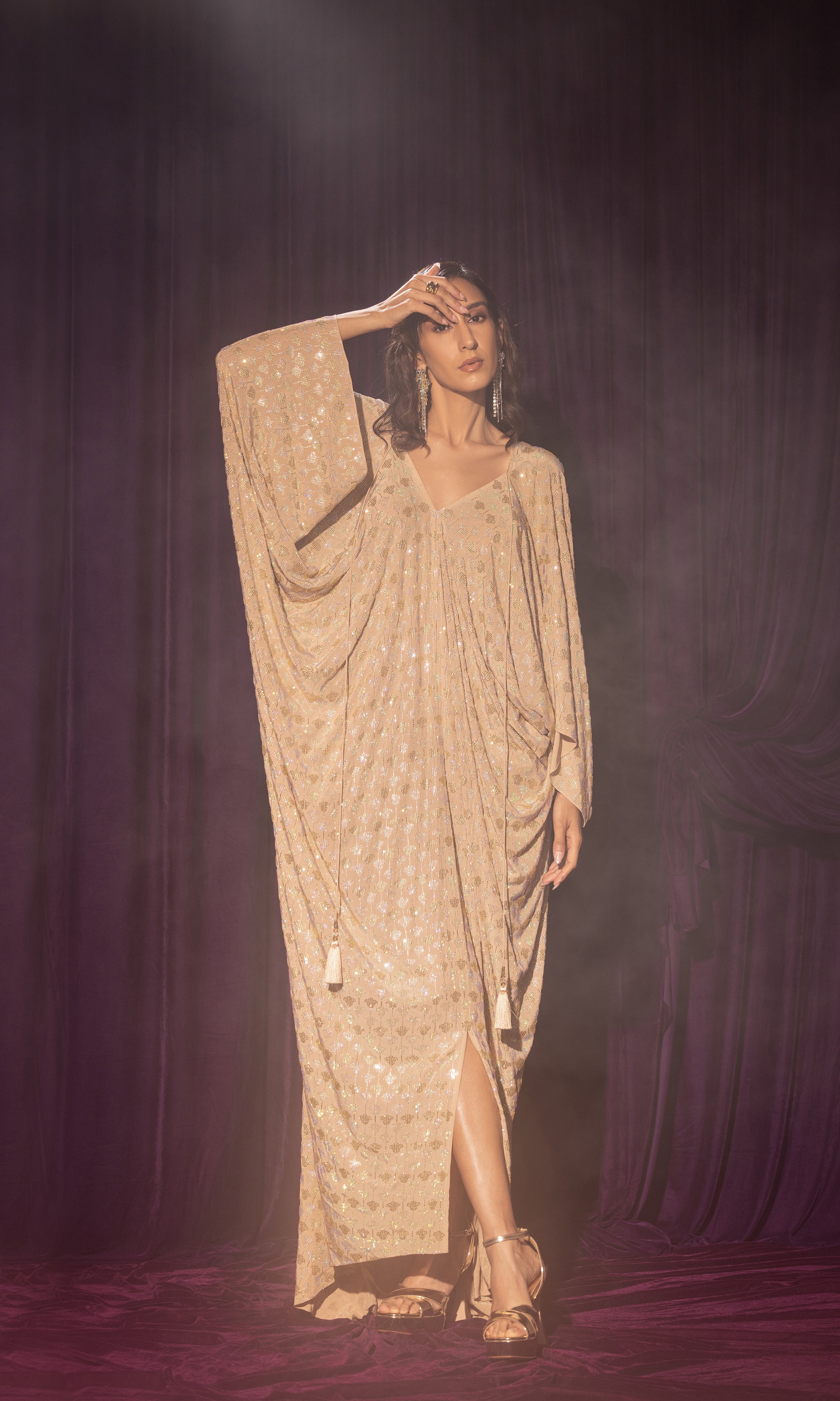 A Beige Gold silk crepe kaftan encrusted with sparkling rhinestones and tassels.