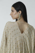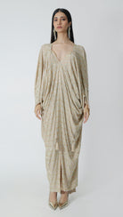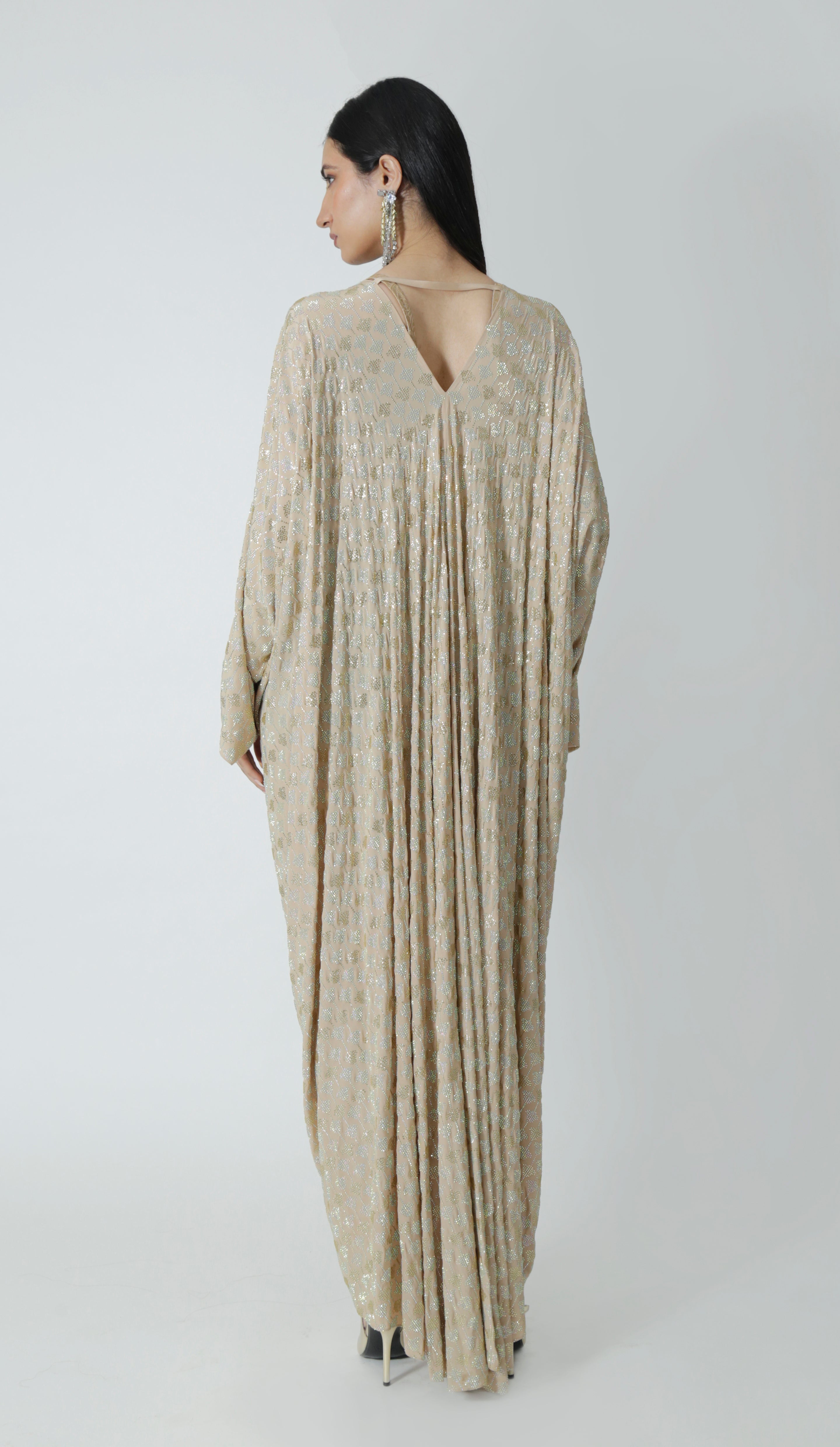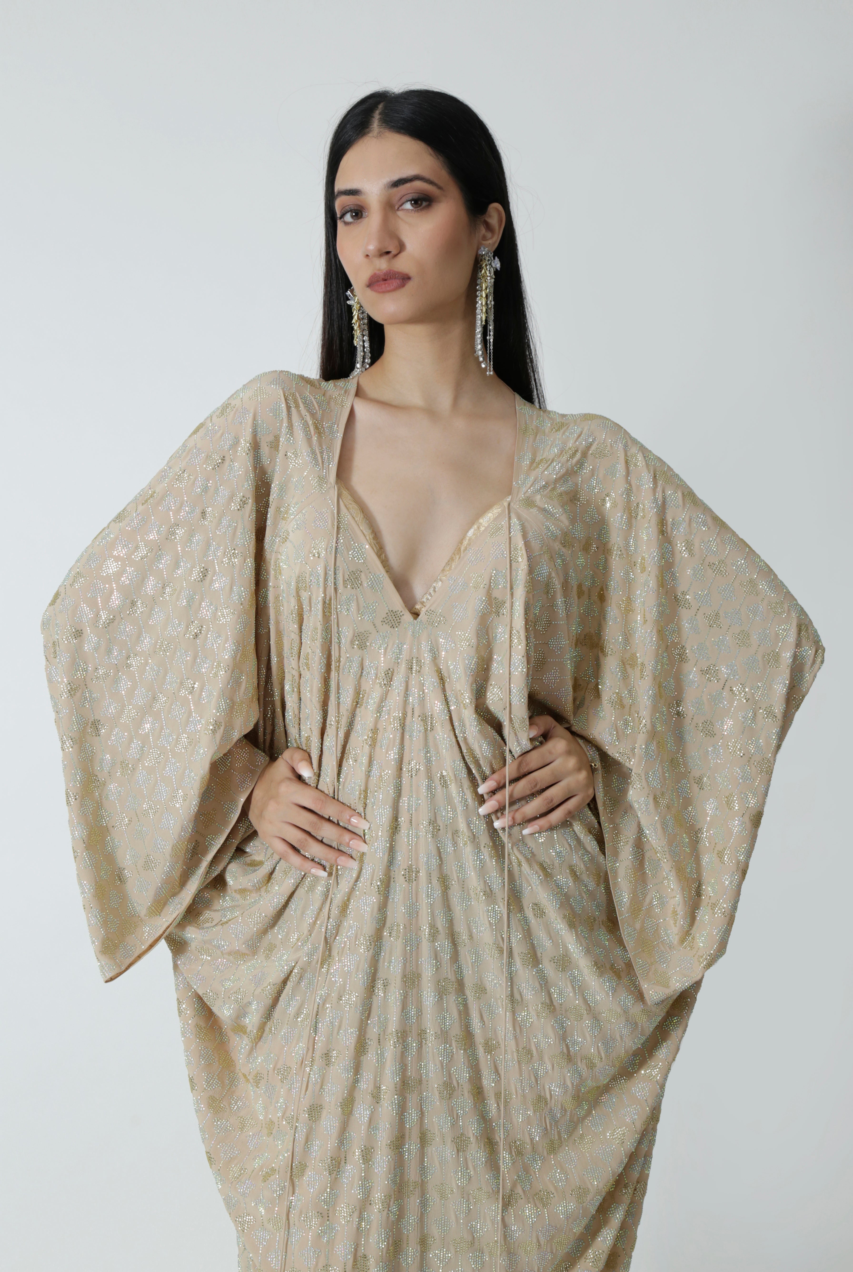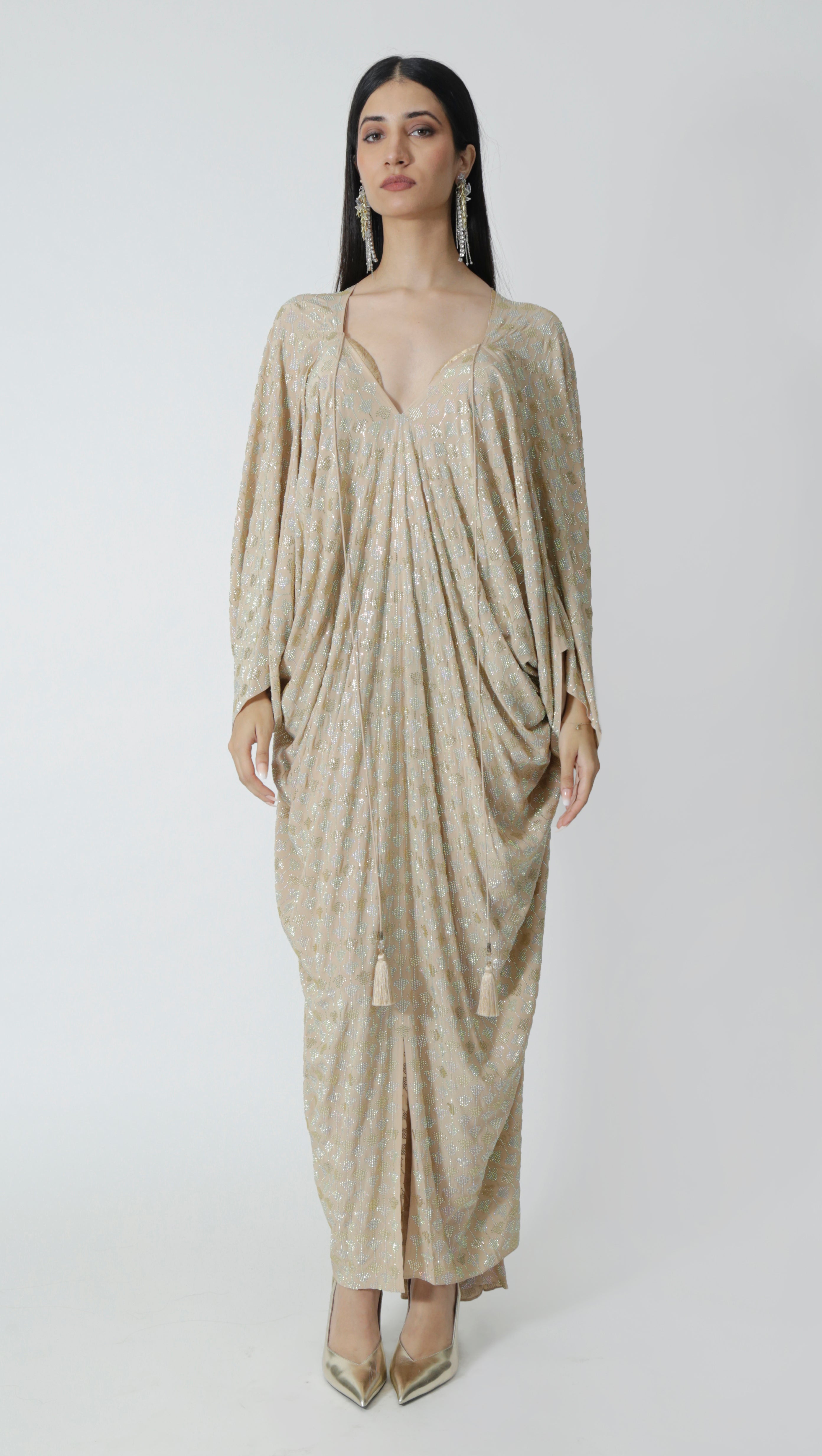 A Beige Gold silk crepe kaftan encrusted with sparkling rhinestones and tassels.