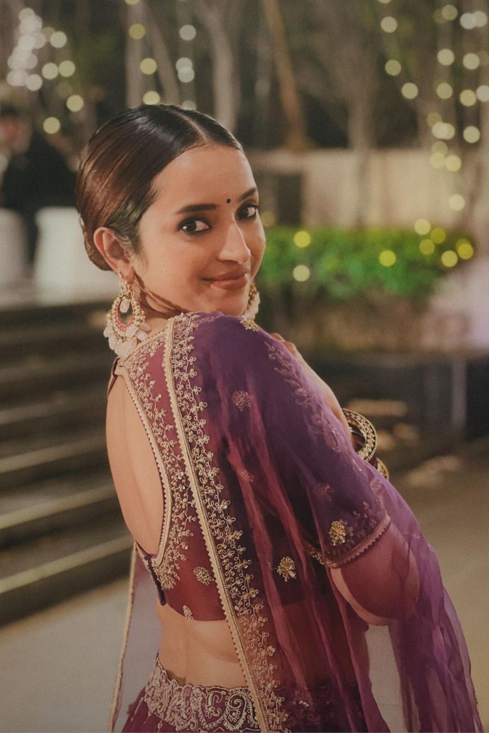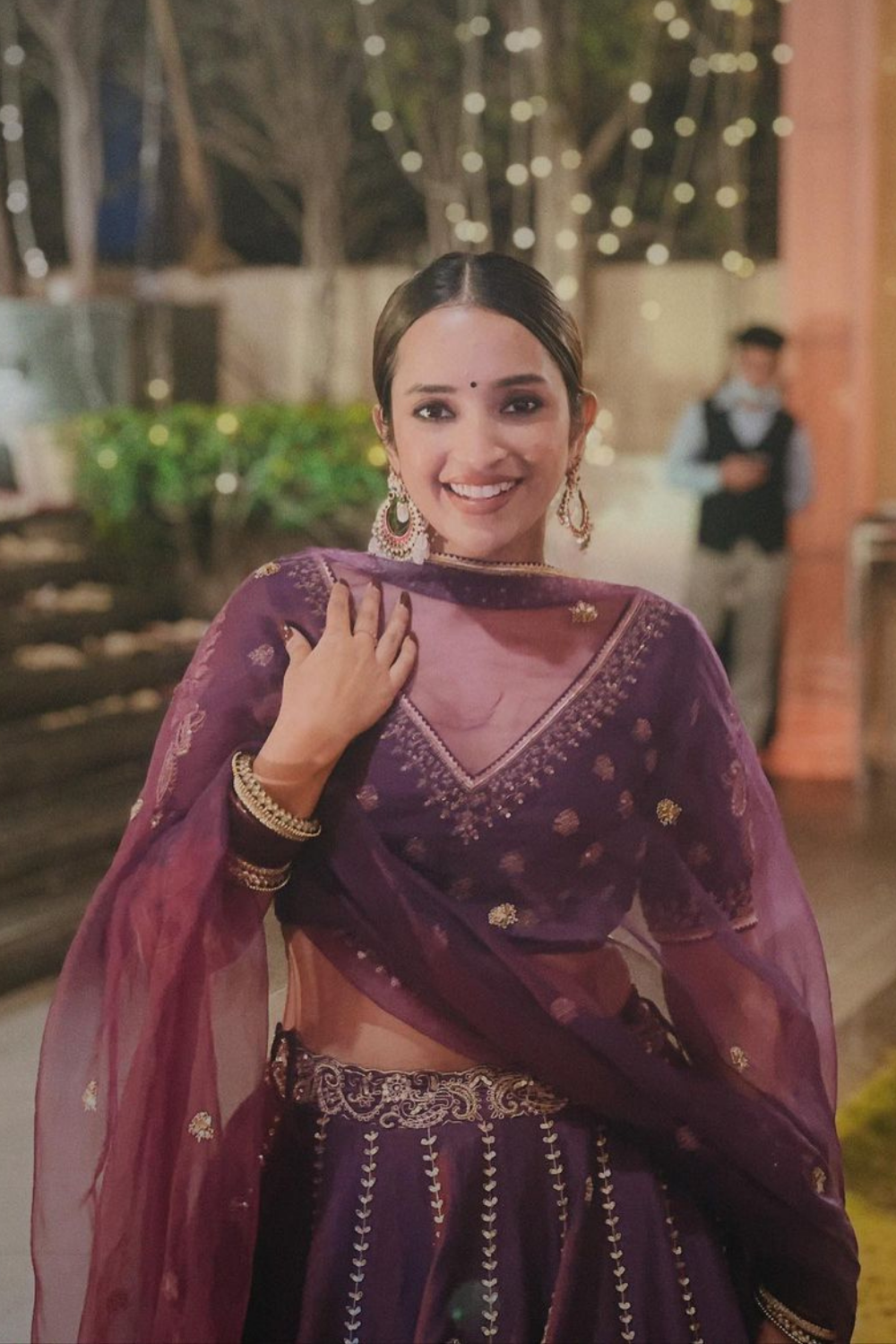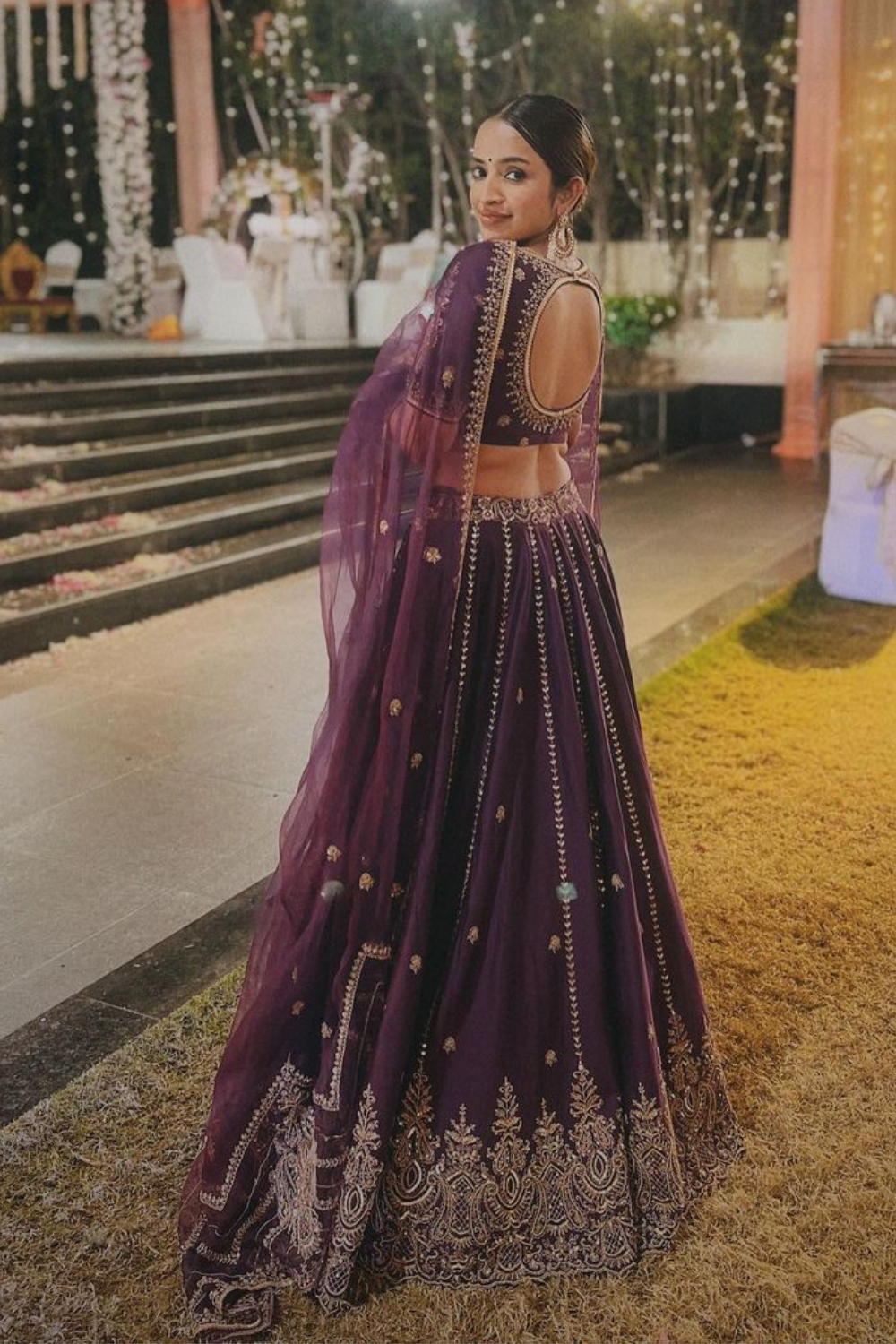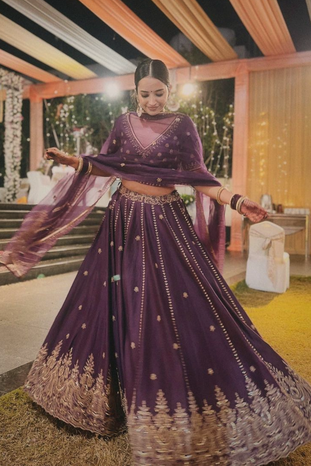 Featuring a midnight purple Chiniya silk lehenga set paired with an organza dupatta with gold dori and aari embroidery
