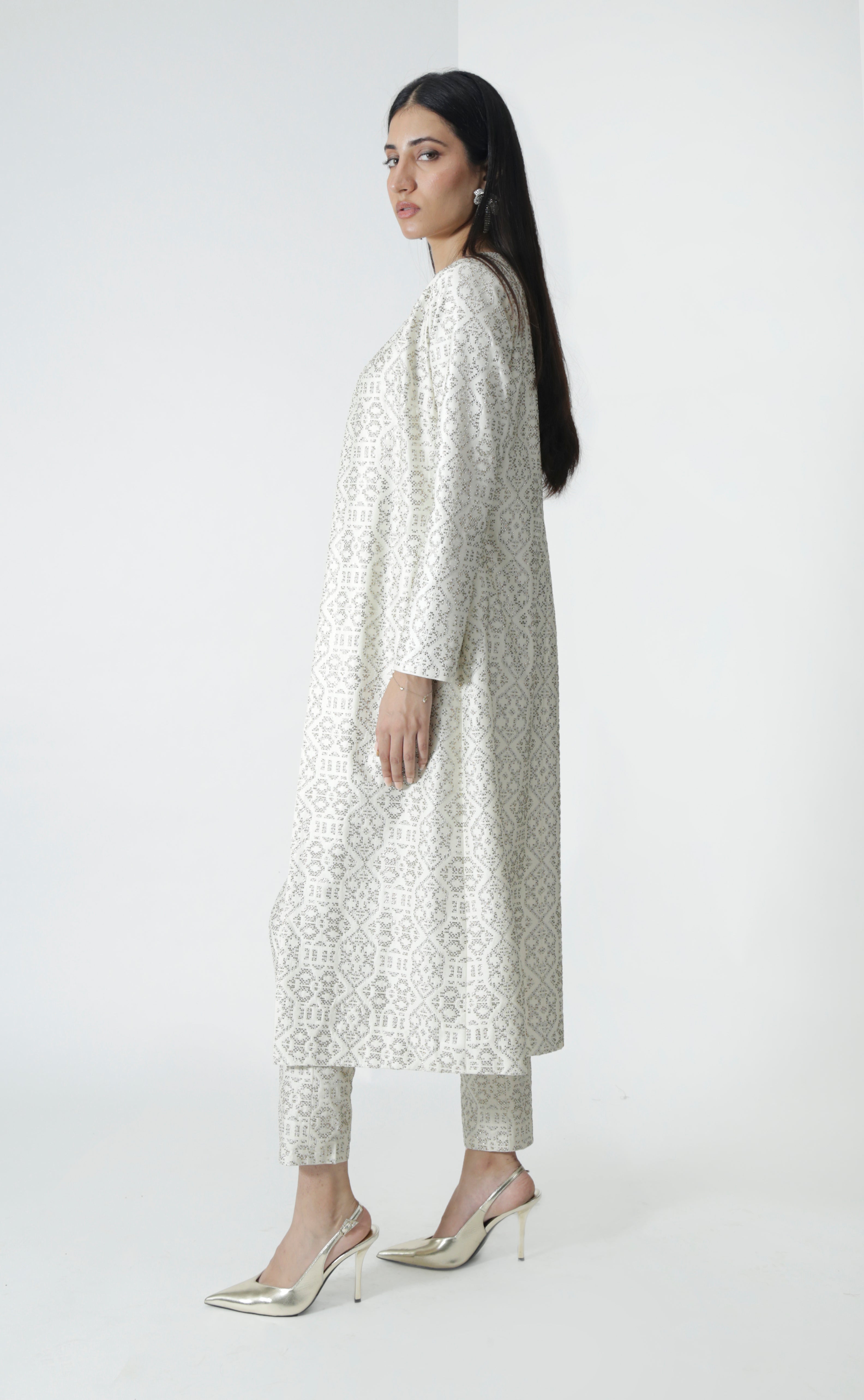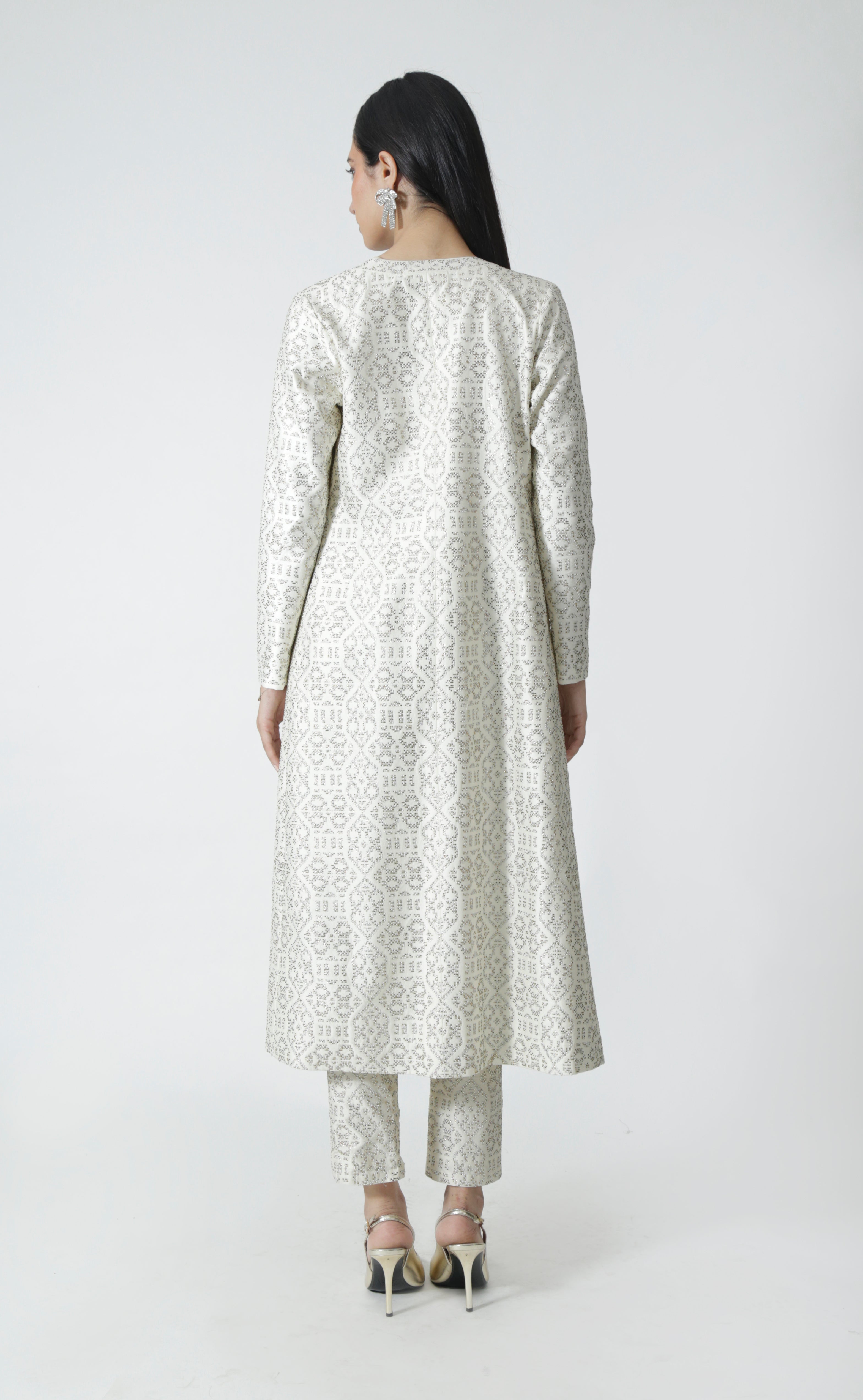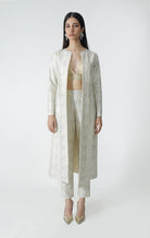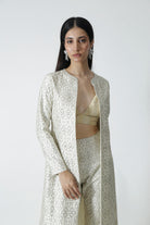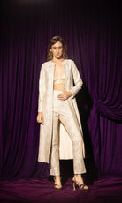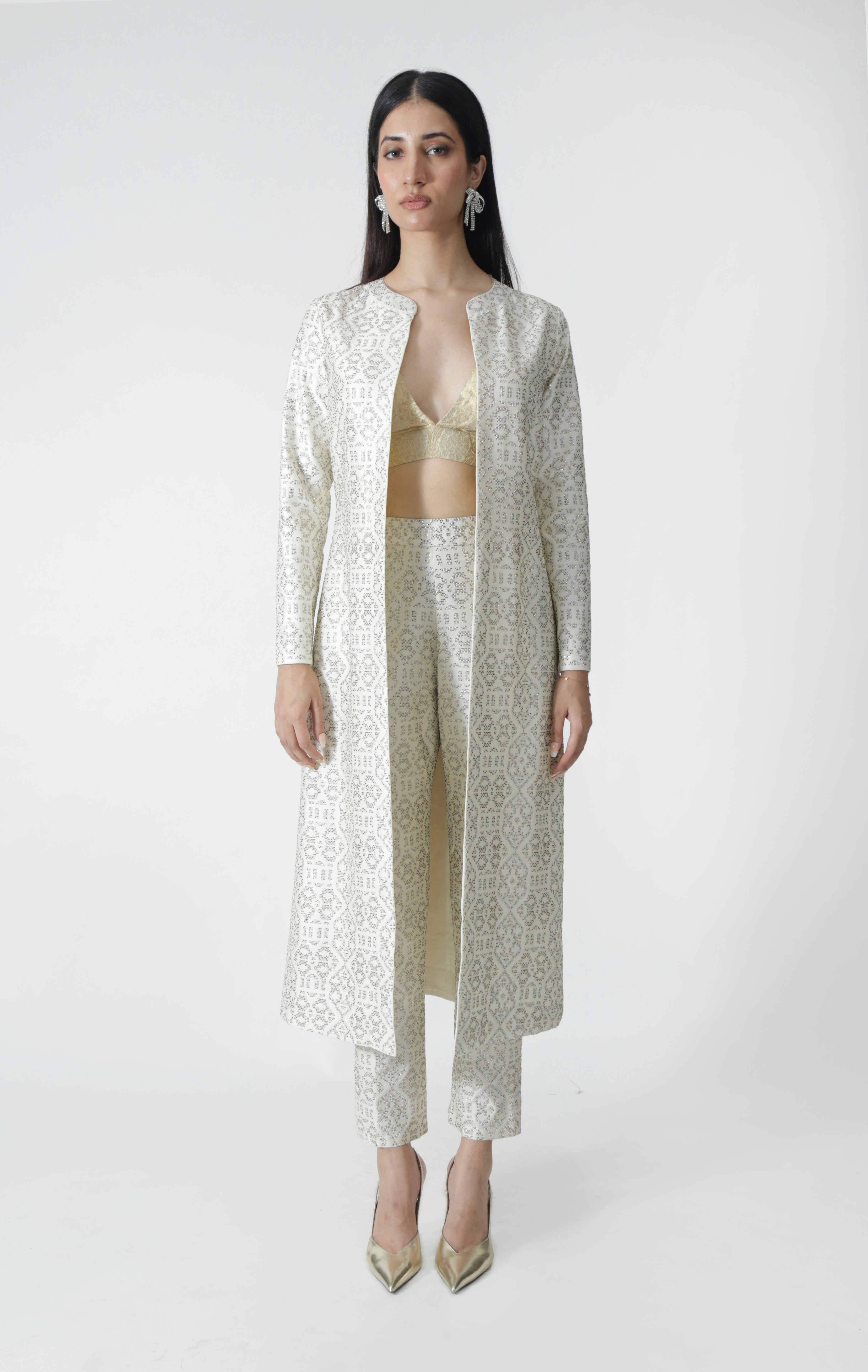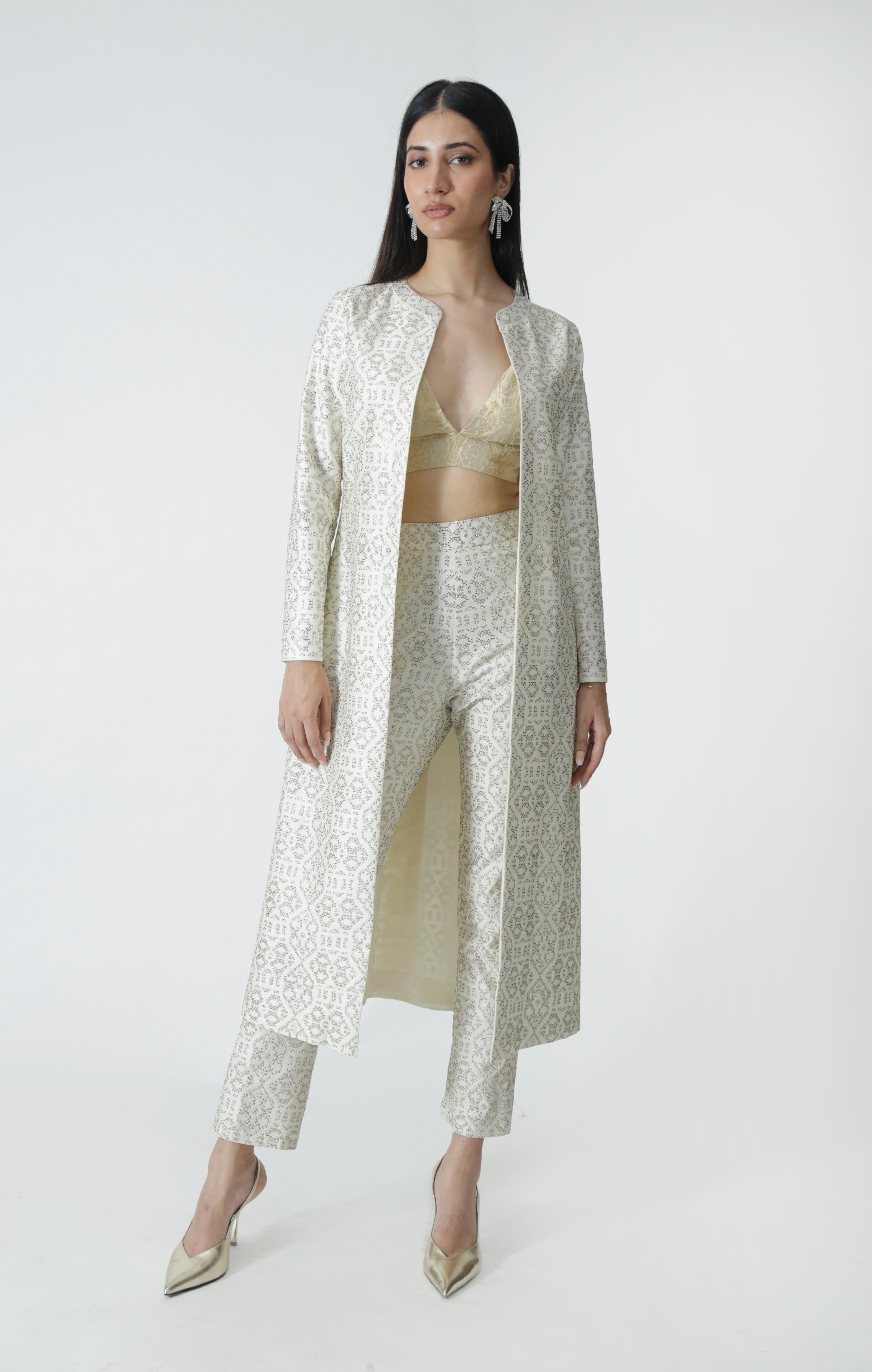 An Ivory chanderi rhinestones encrusted jacket and pants, paired with exquisite brocade bralette.
