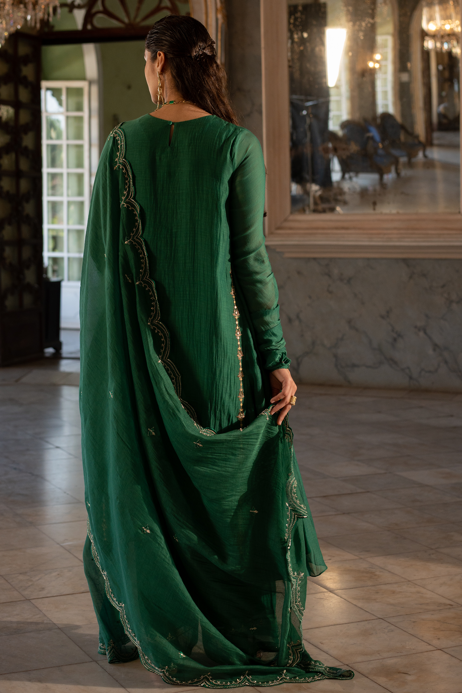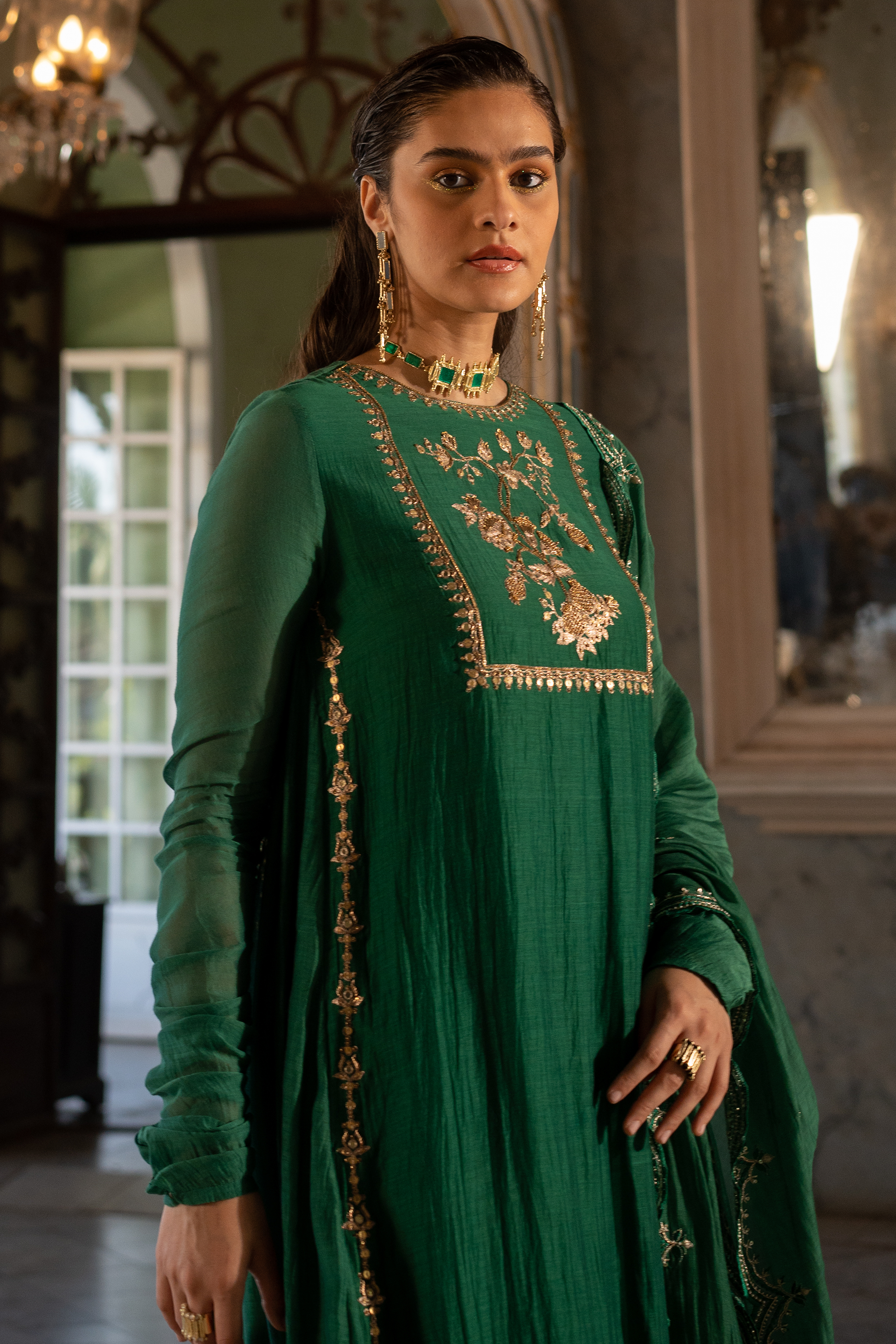 Featuring an emerald green malai chanderi kurta pant set paired with a scallop detailed dupatta. Yoke is highlighted with anar motifs using antique gold handwork.