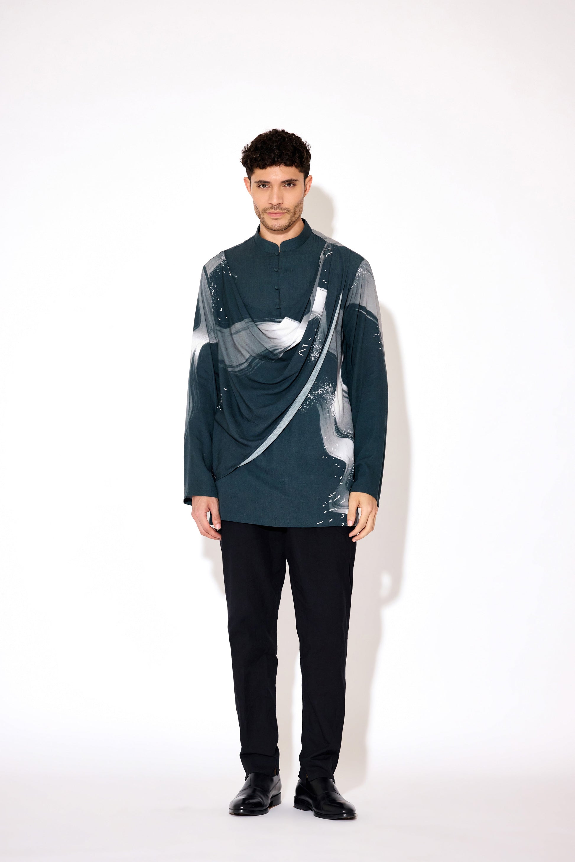 This men’s printed drape shirt features a distinctive cowl-draped panel at the front, combining contemporary design with a relaxed silhouette. Crafted to provide both style and comfort, its unique draping adds depth and movement, making it an ideal choice for those seeking a refined yet modern look. Perfect for elevating casual and semi-formal outfits with an expert touch.