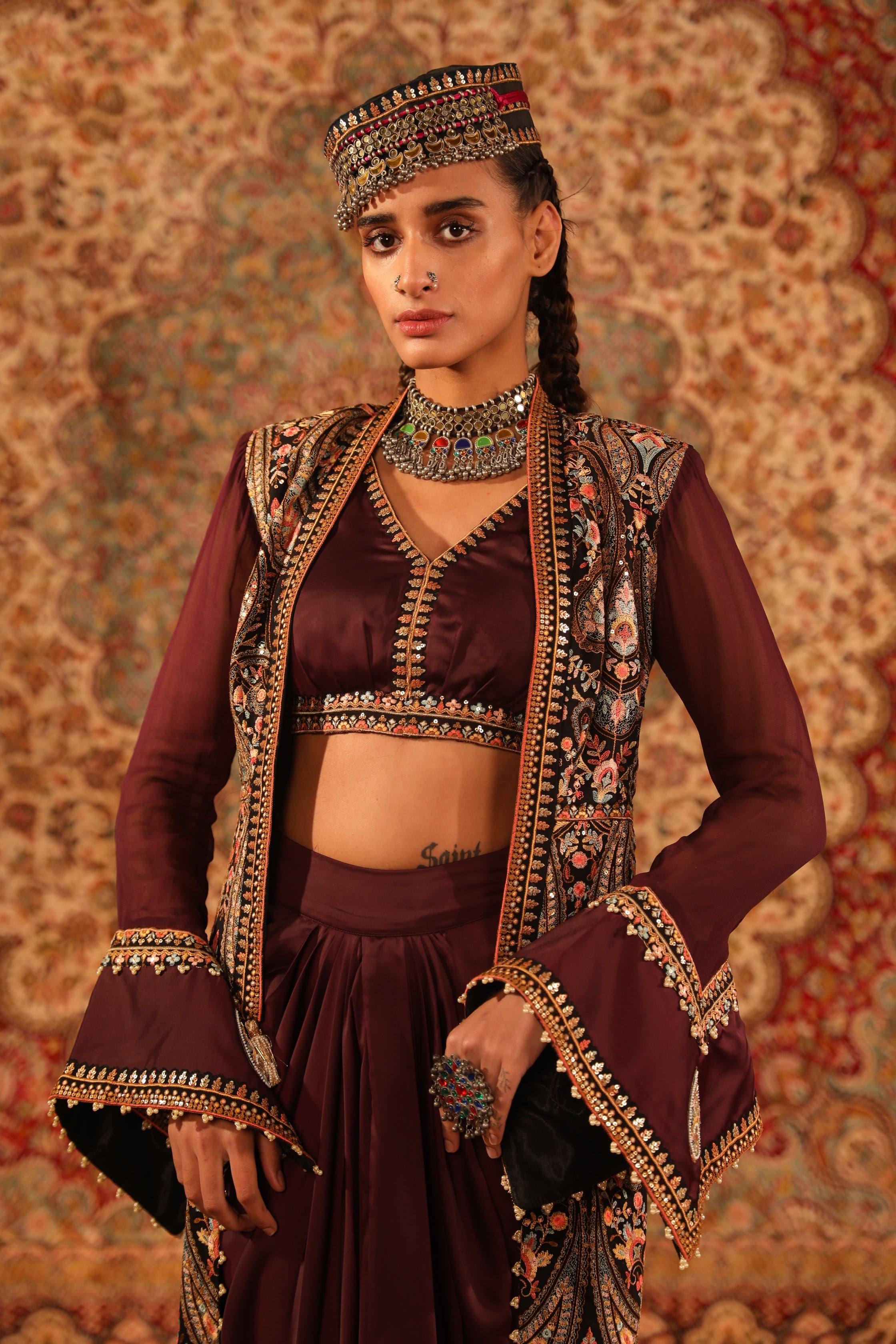 Jamawaar collection set with kashida embroidery features a V-neck blouse, a draped skirt and a full-sleeved, long jacket with triangular-cut panel towards the opening. The blouse has embroidery on neck line, waistline & CF, while the jacket has embroider applique across the body. The sleeves panel's edges also have embroidery on them. Tassels and small pearls border enhances the front body of the jacket and the sleeve hems.