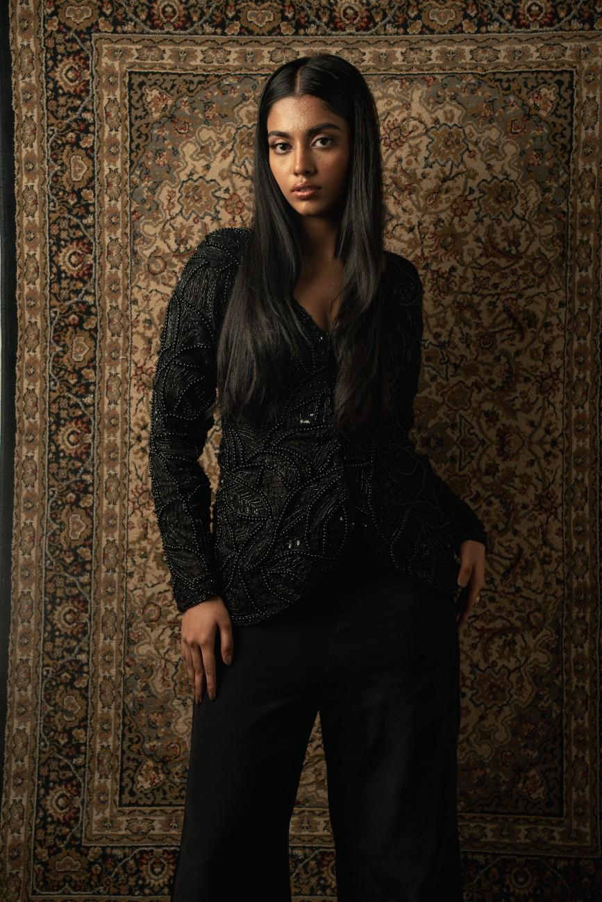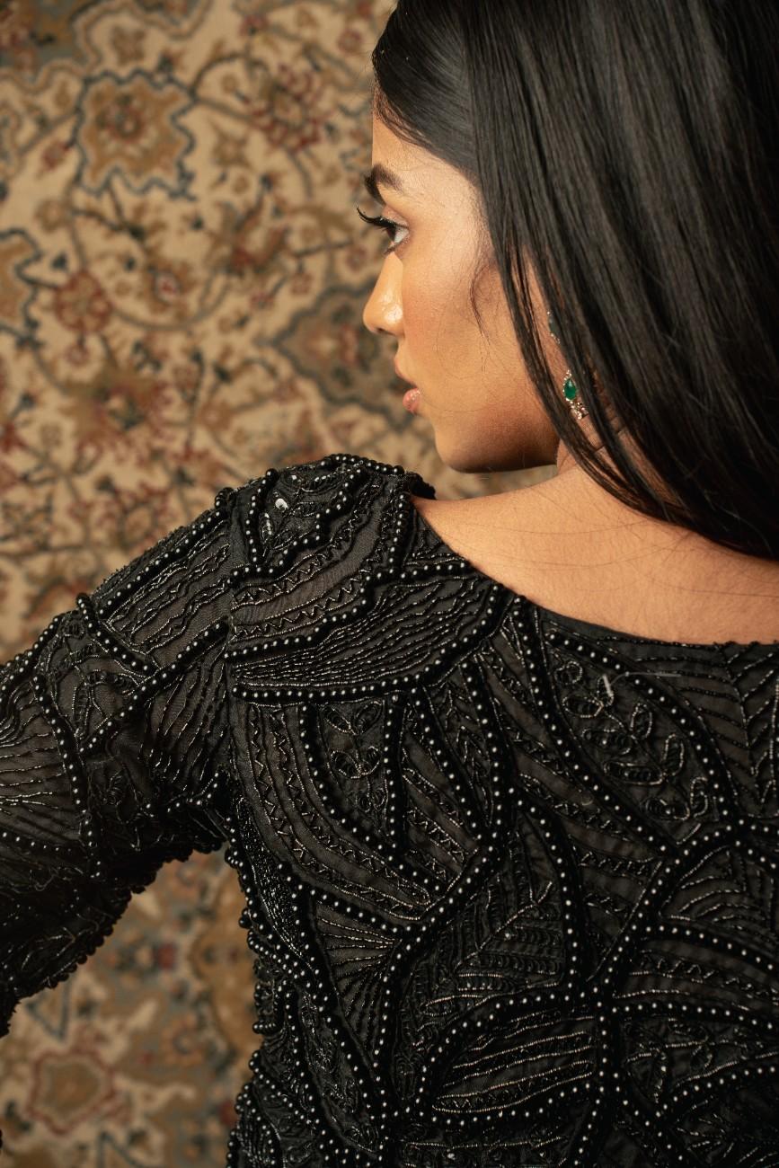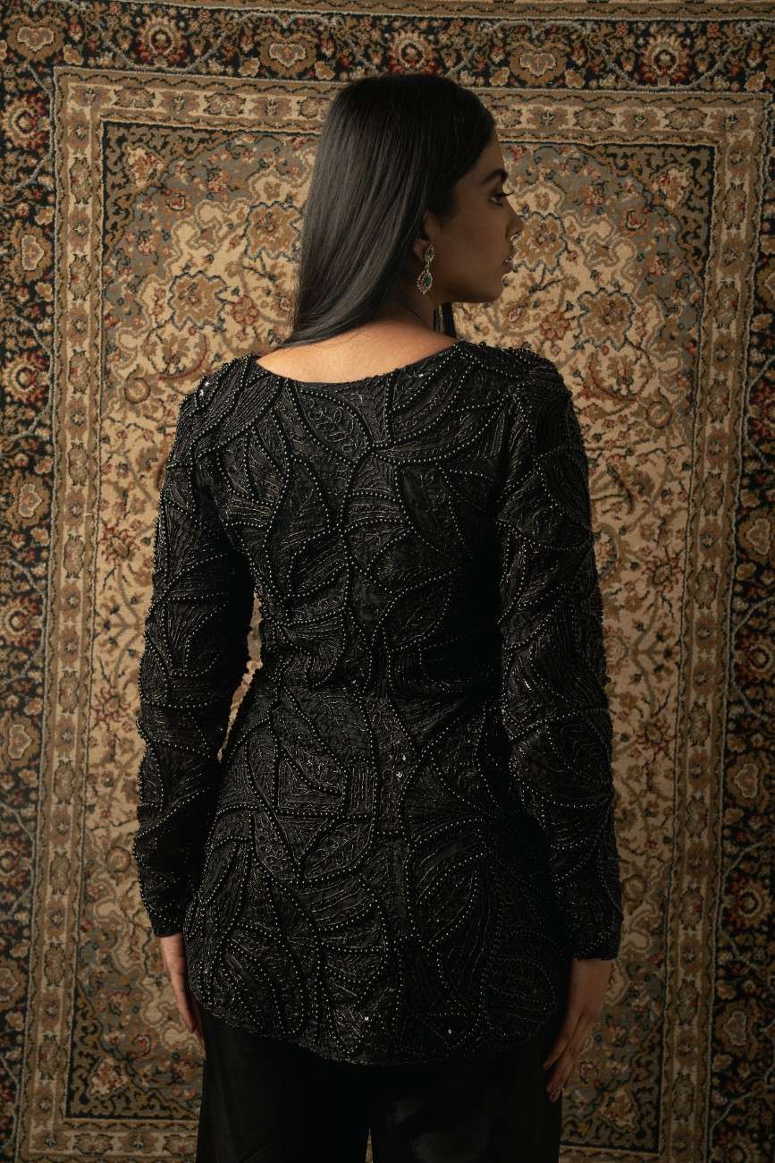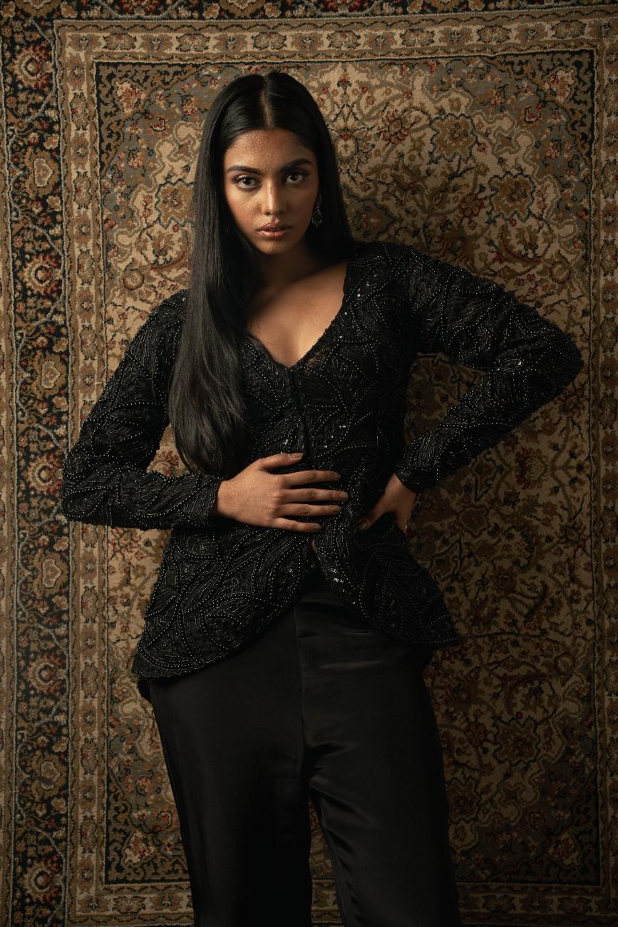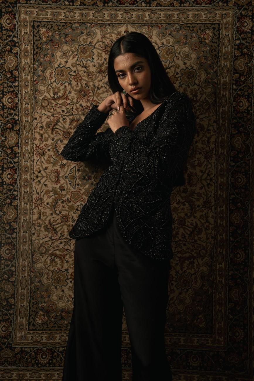 This decadent black pant set embodies unparalleled craftsmanship, showcasing meticulous attention to detail. The top, crafted from luxurious organza, features intricate bead embroidery that adds an element of sophistication and allure. Paired with silk pants adorned with beautiful embroidery, the ensemble exudes opulence and elegance. Each stitch is a testament to exquisite artistry, making this ensemble a standout choice for any special occasion or formal event.