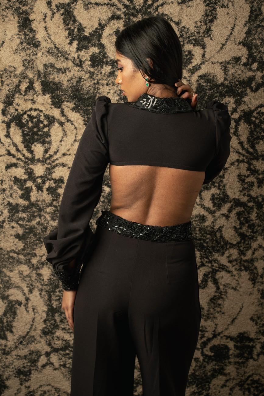 This sleek black jumpsuit is tailored to perfection, featuring a flattering cut that accentuates the waist elegantly. Its sophisticated design is elevated by oxidized embroidery adorning the neckline, adding a touch of understated glamour. Perfect for a professional event, this jumpsuit strikes the ideal balance between professionalism and style, ensuring you make a polished and confident impression wherever you go.