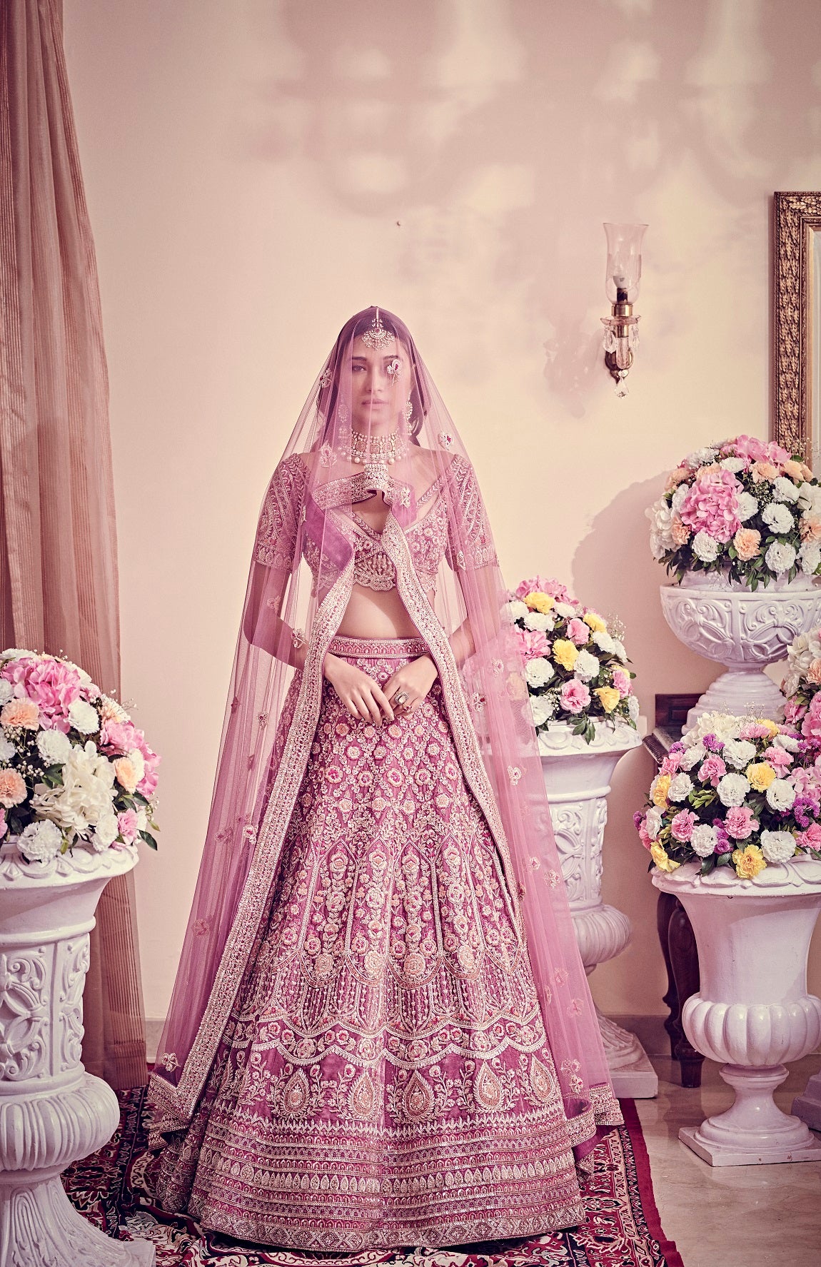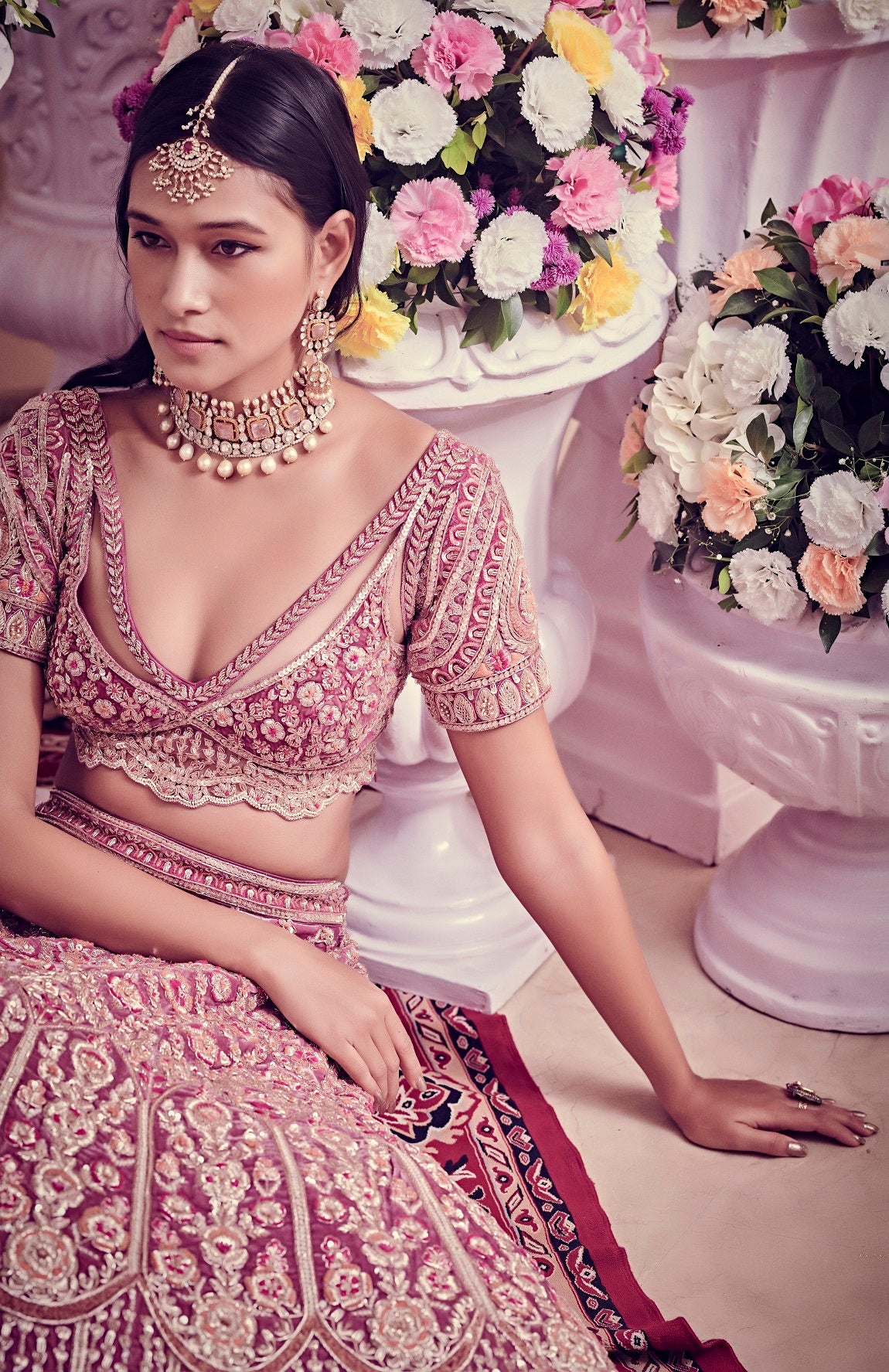 The lady aradhana wears a dull magenta lehenga intricately crafted using mukaish work, cut dana and resham embroidery & sequins on a velvet base, the ensemble is further accentuated with the strappy neckline blouse designed with a spread of scallop embroidery and koti sleeves giving it a unconventional yet regal appeal.