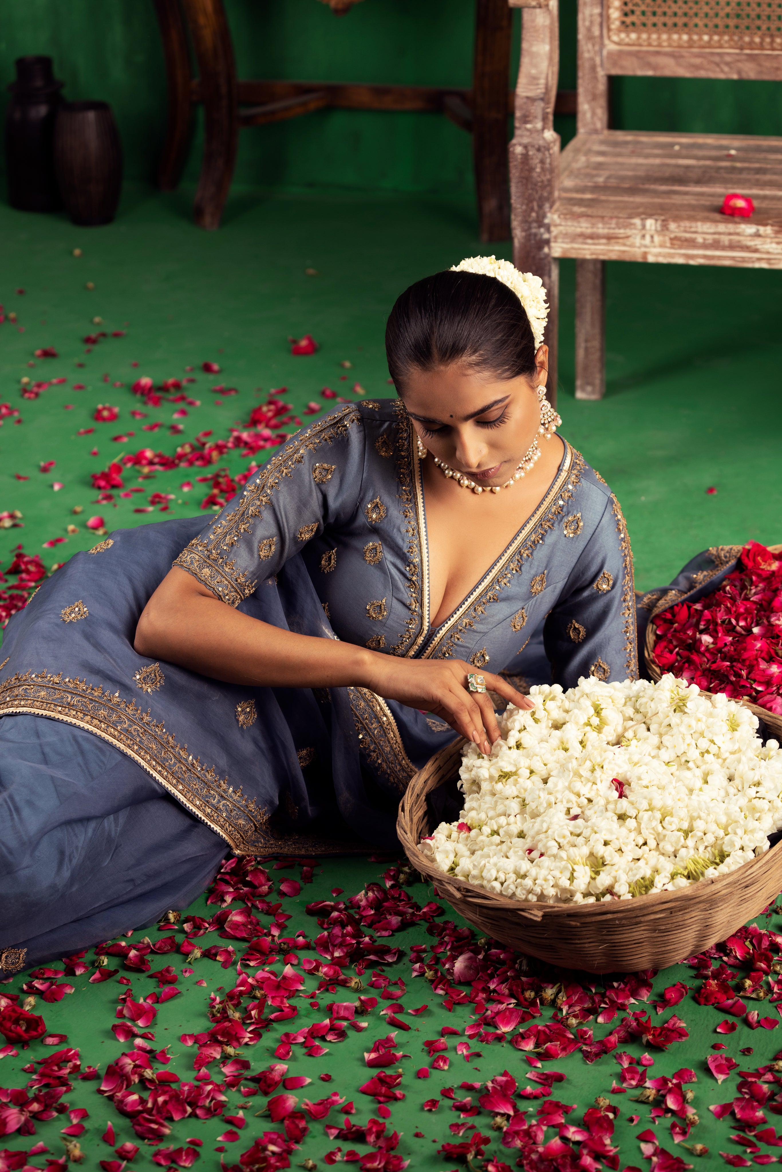 Featuring a dusty blue organza saree paired with chanderi base blouse with gold dori and aari embroidery on it.