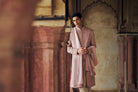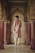 Dusty rose pink raw silk sherwani all over embroidered in tonal dori work highlighted with beads and crystals. it is accompanied with an ivory monga tussar kurta and churidar. it comes with an optional worked belt and stole along with matching jutis which can be ordered separately.