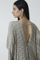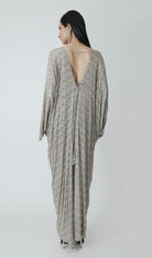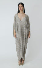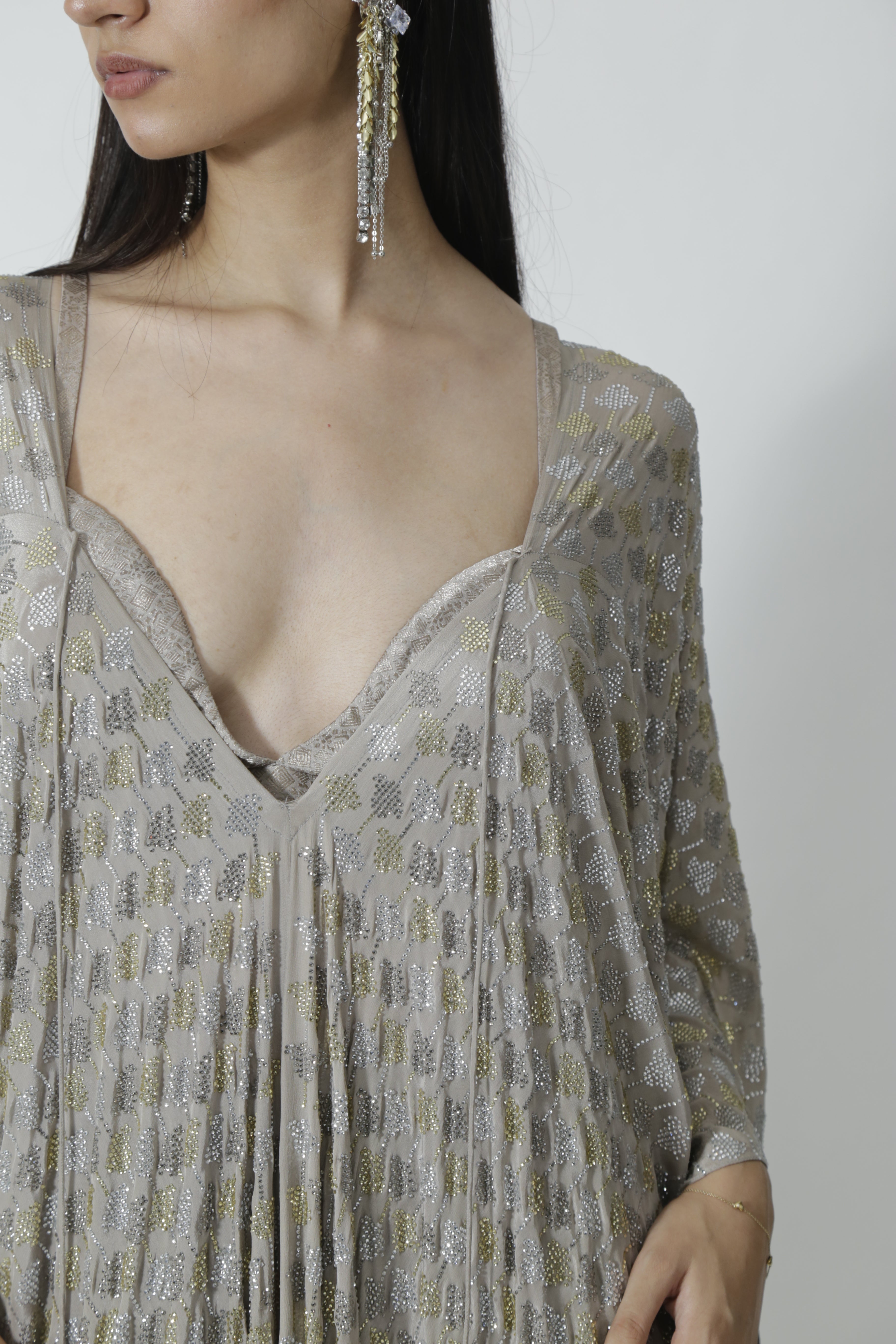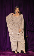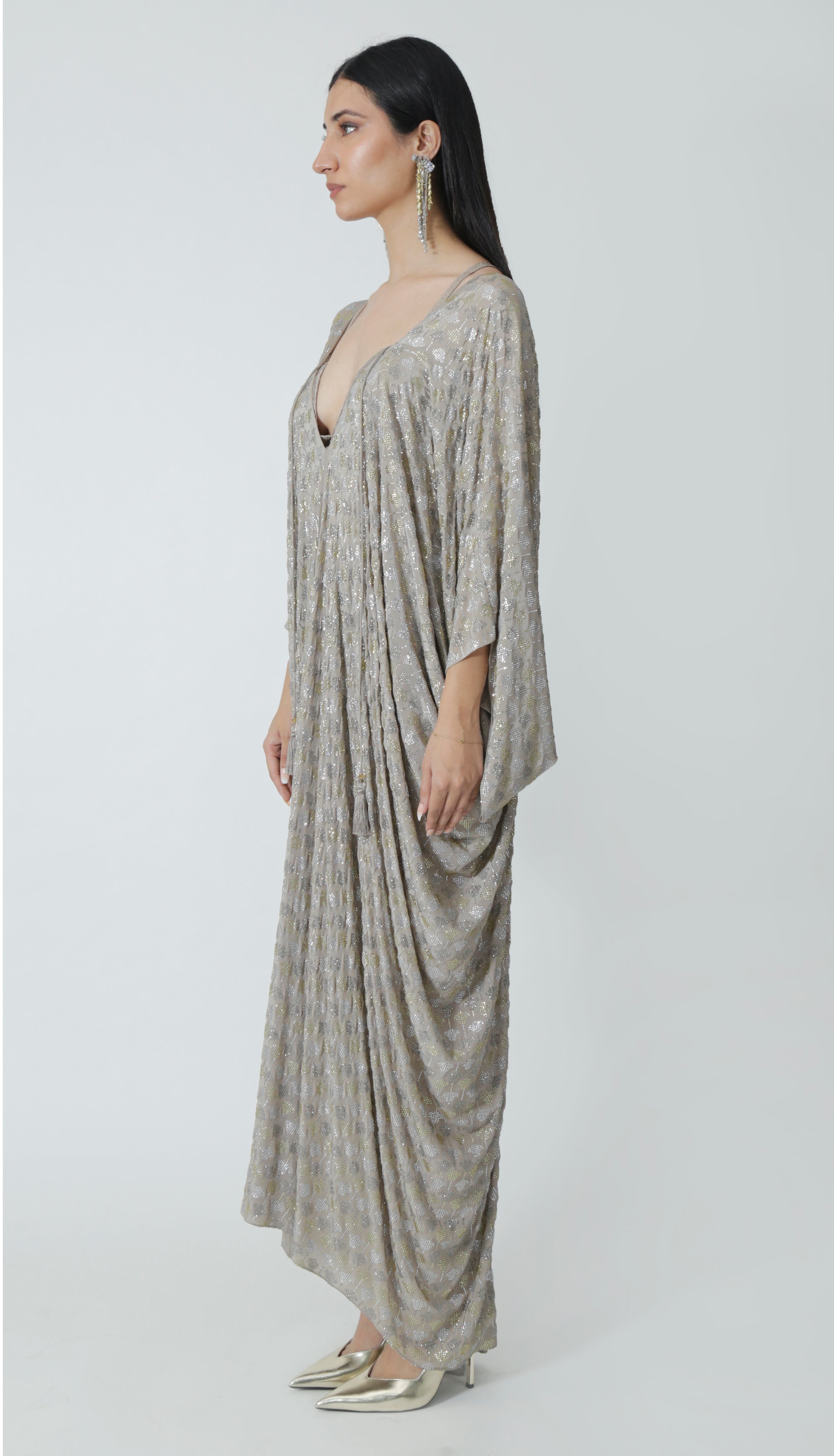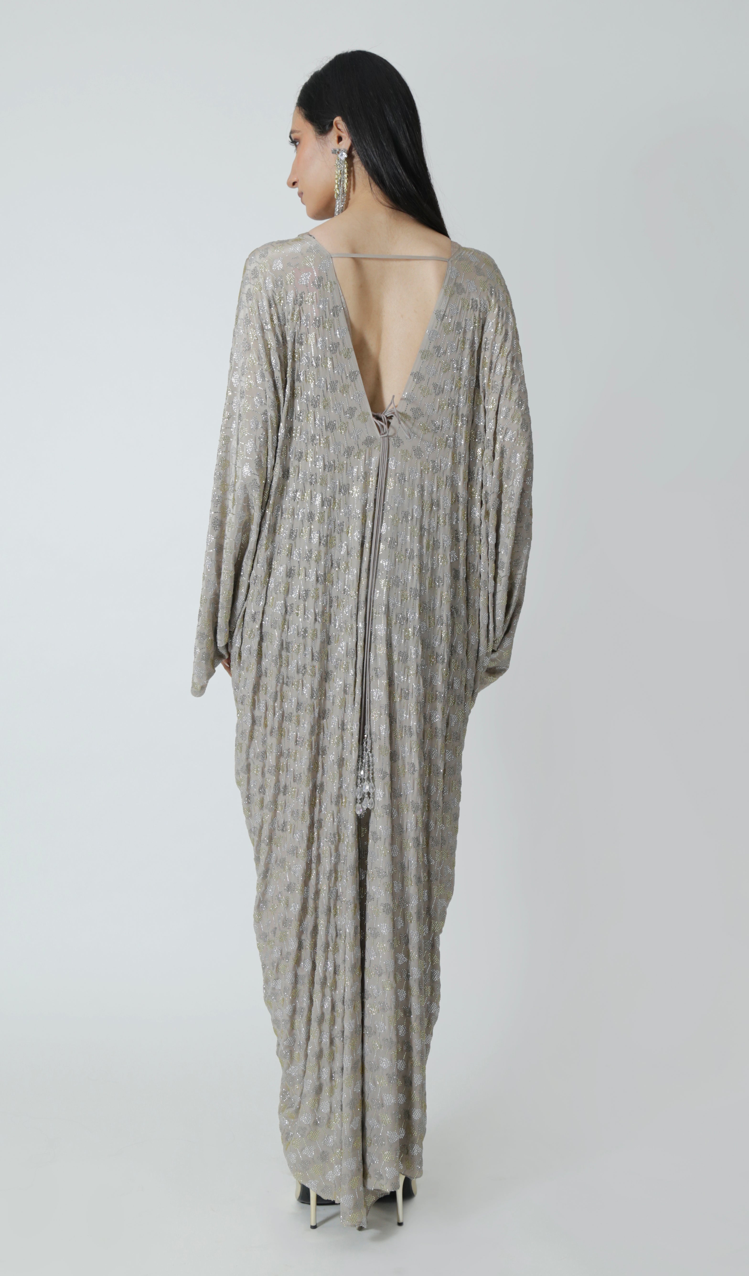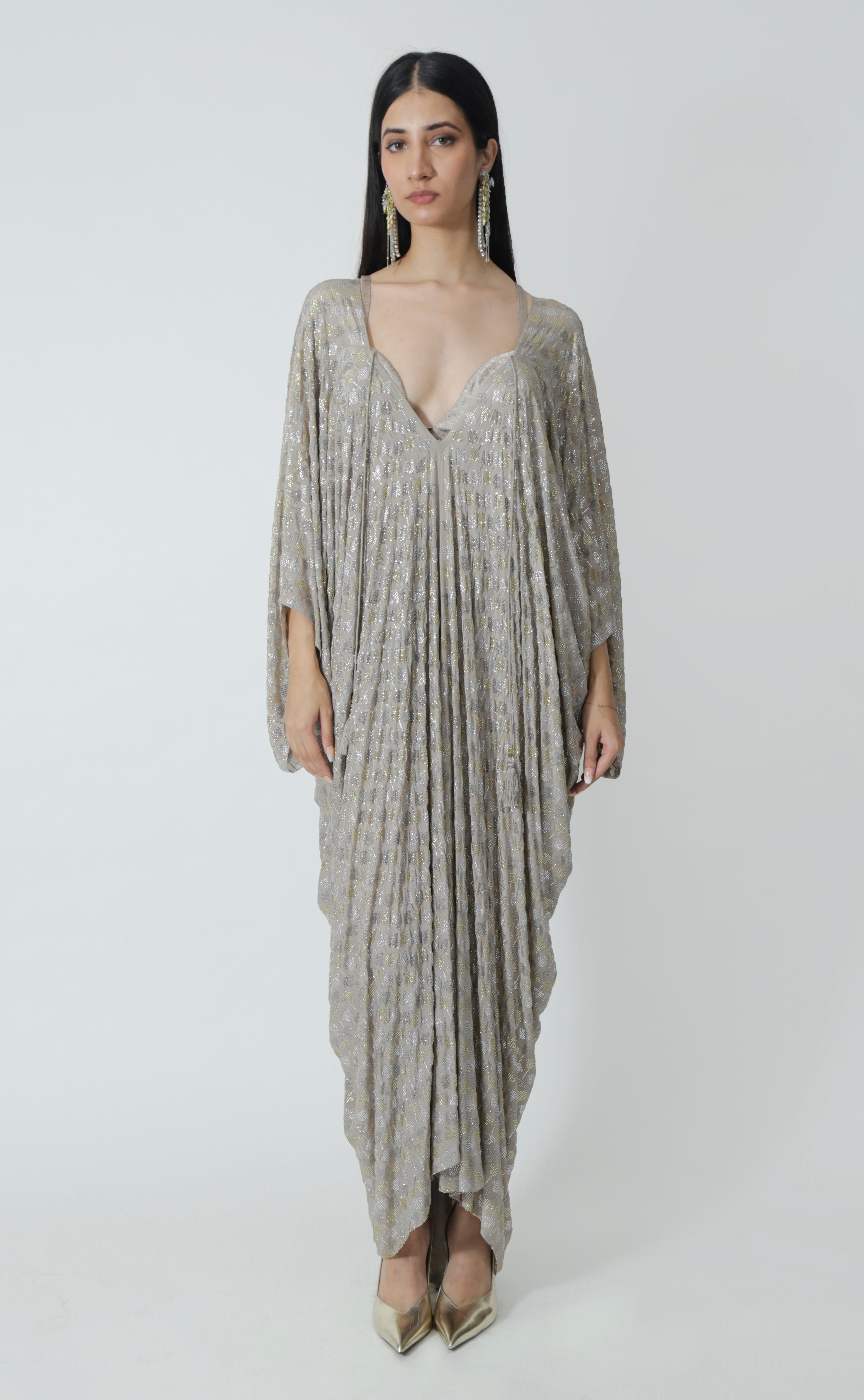 A Silver Grey silk crepe kaftan encrusted with sparkling rhinestones and tassels.