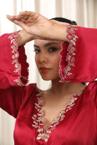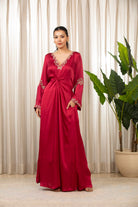 This garment features a kaftan front knot draped design, distinguished by cutwork detailing along the neckline and sleeves.Intricate zari and dori work, complemented by subtle hand embellishments. A functional dori at the back allows for waist adjustments, ensuring a tailored fit.