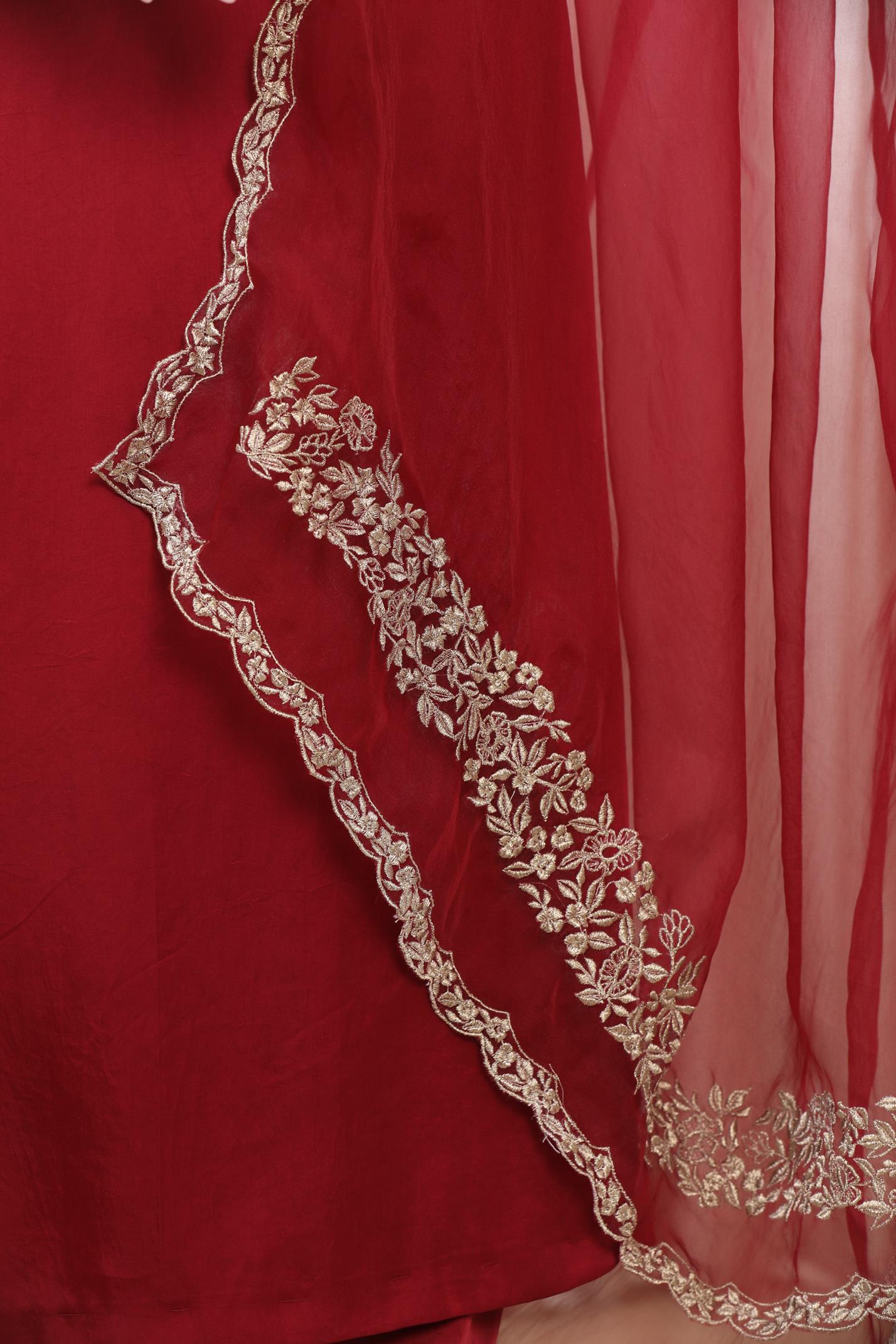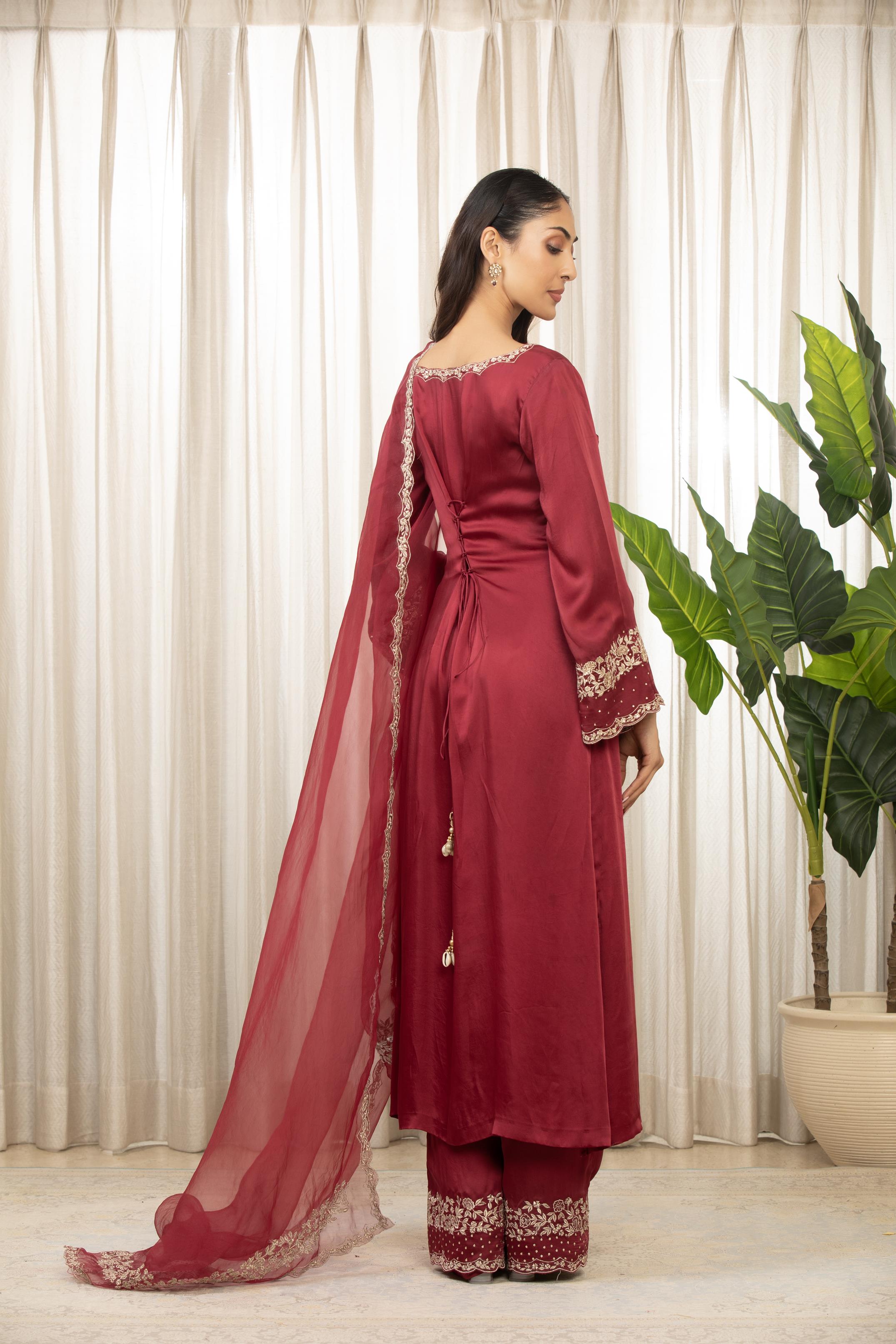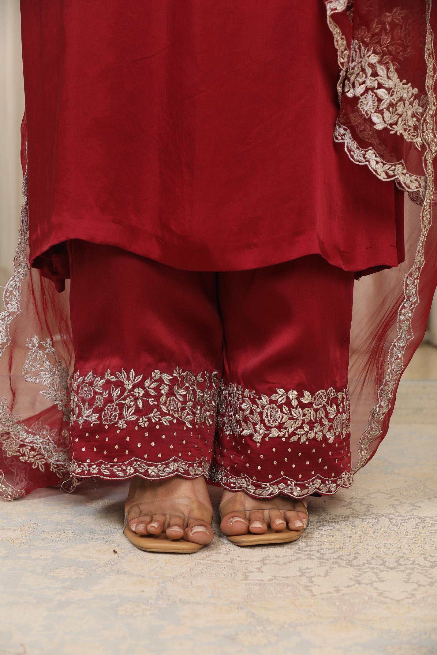 This garment features a kurta which is adorned with delicate cutwork embroidery on neck line,sleeves and pants further embellished with handwork. It is paired with cutwork embroidered organza dupatta.