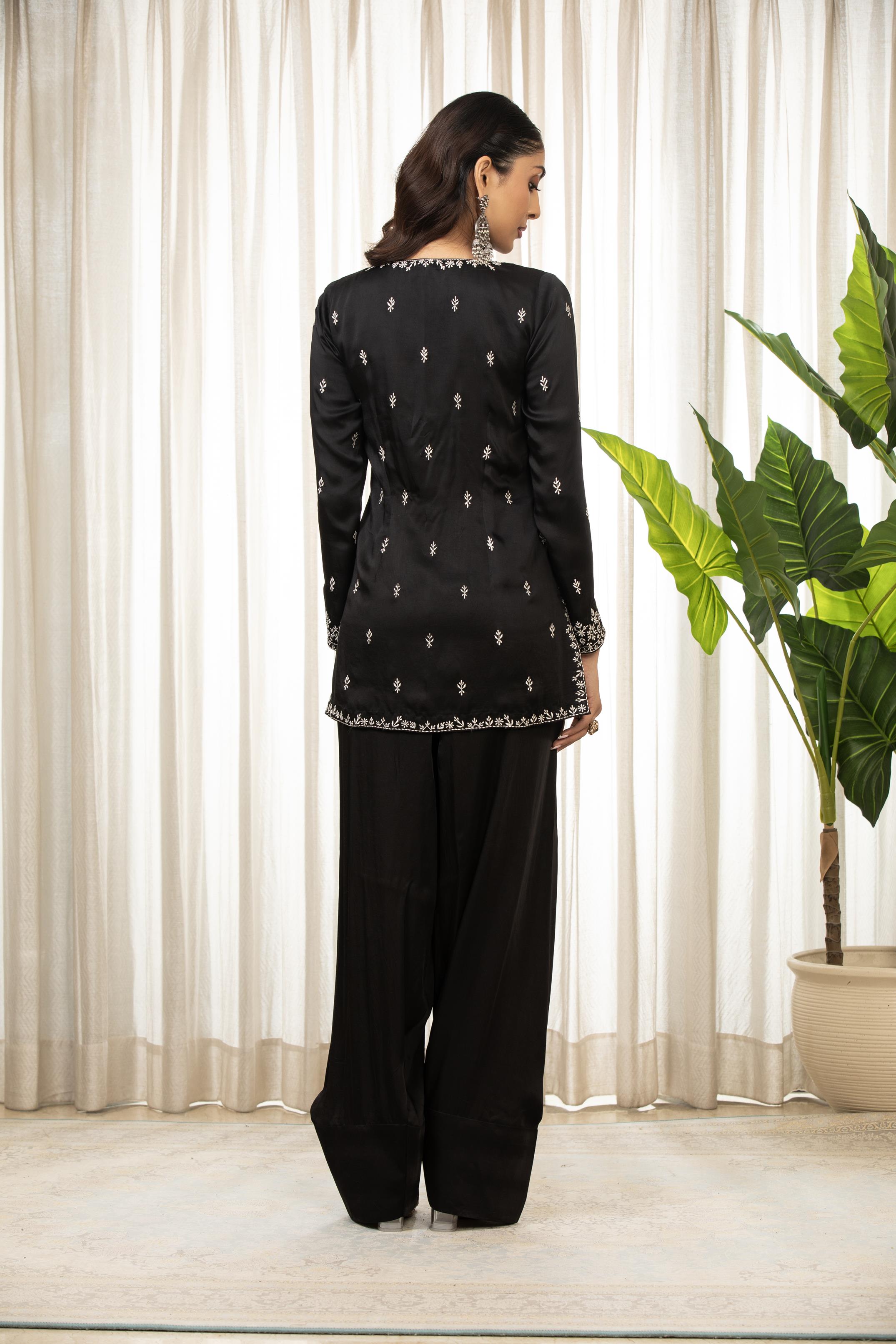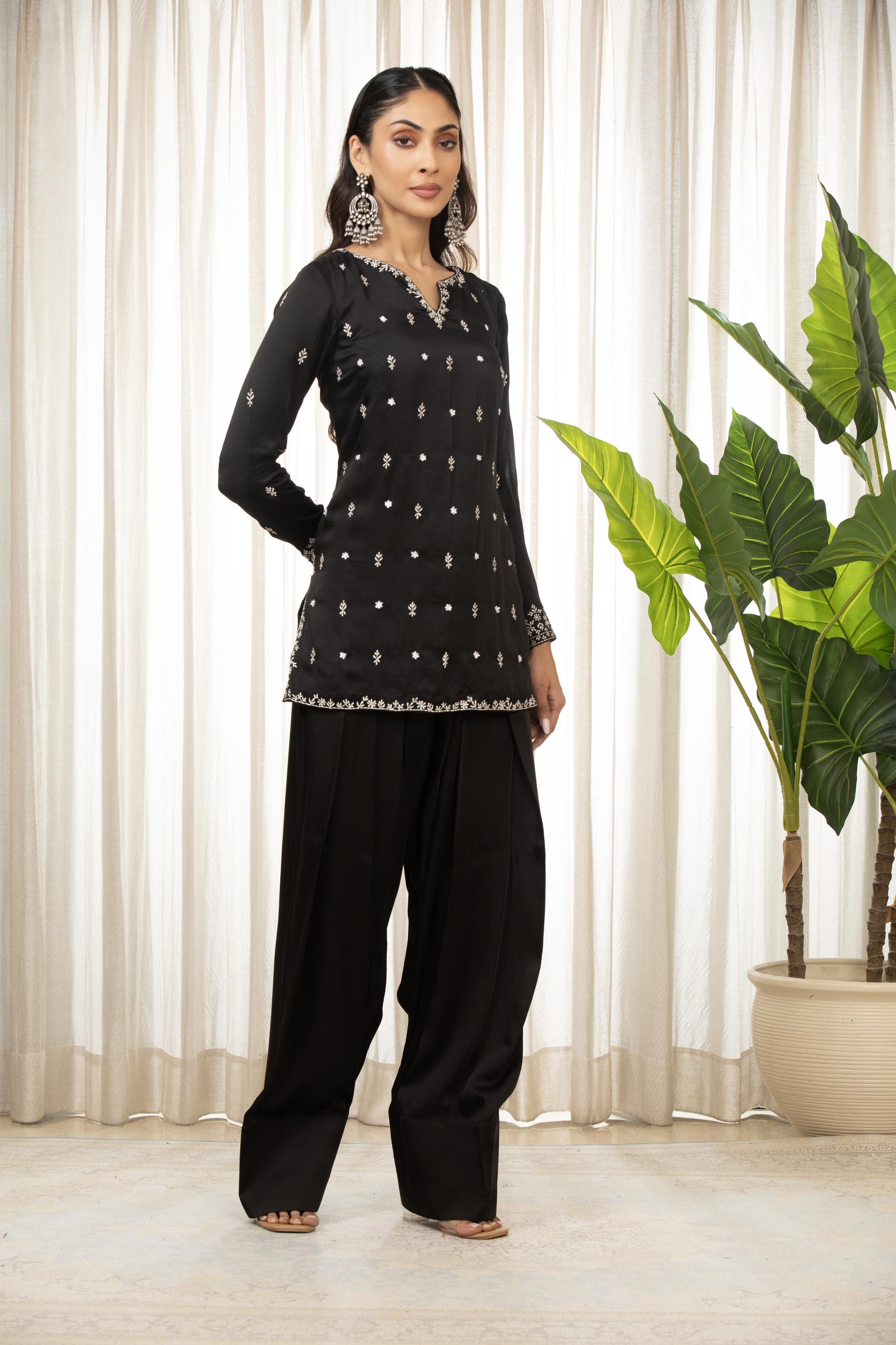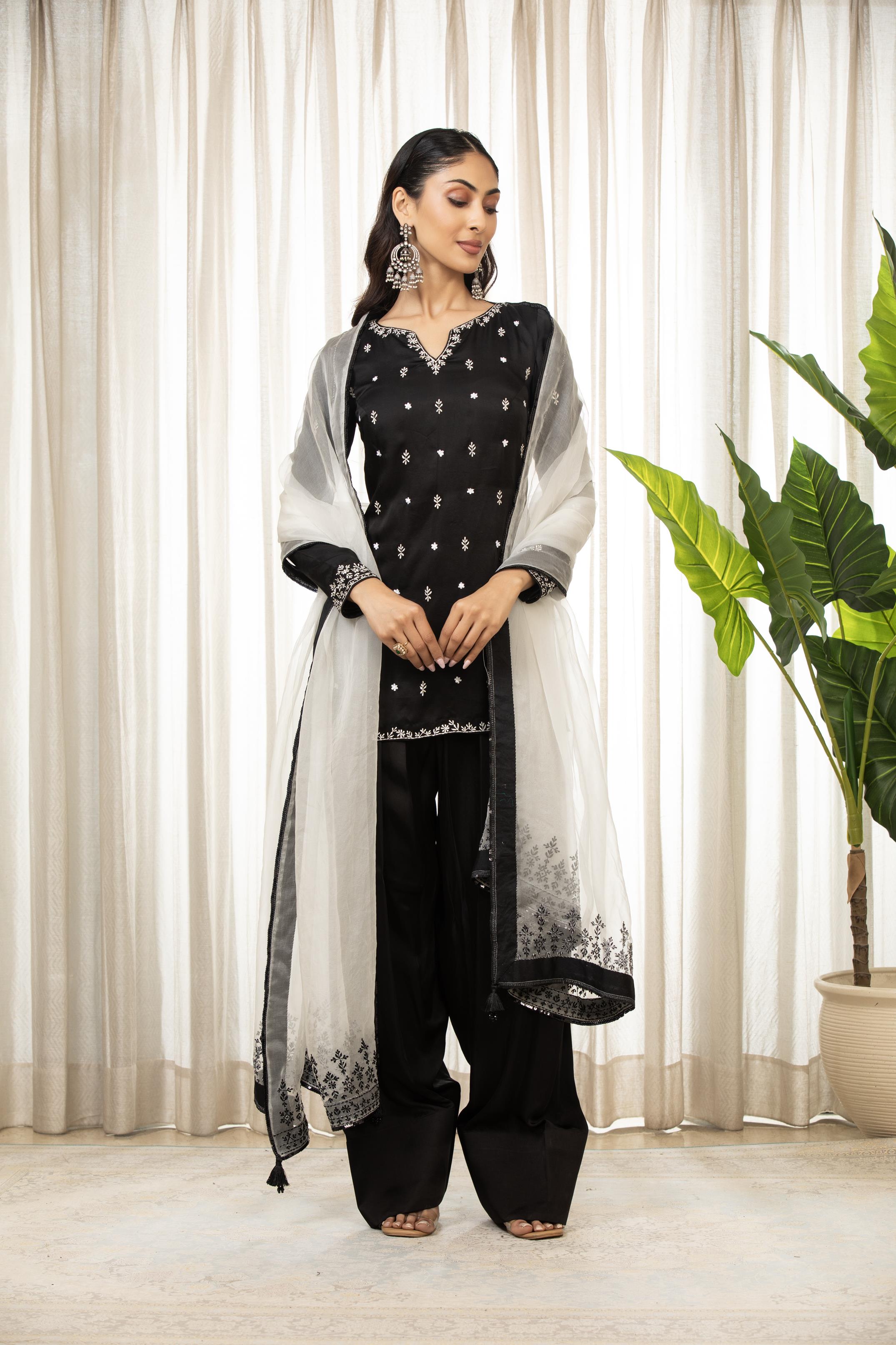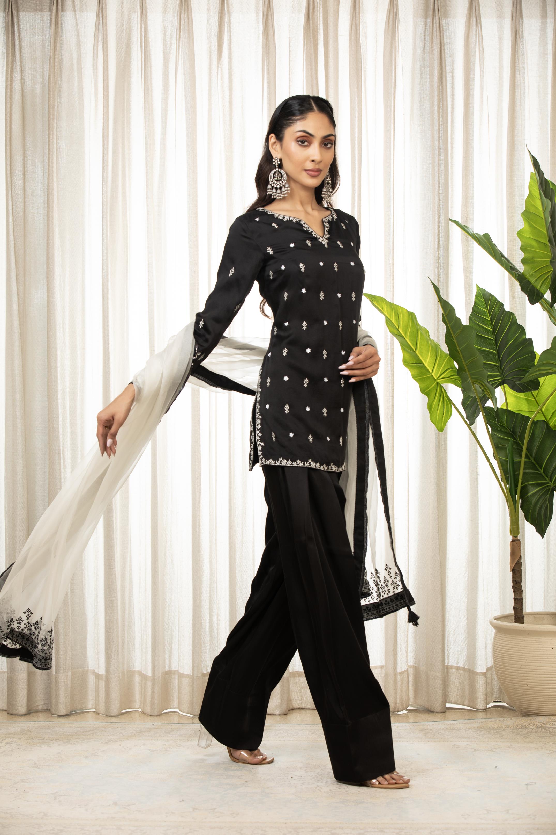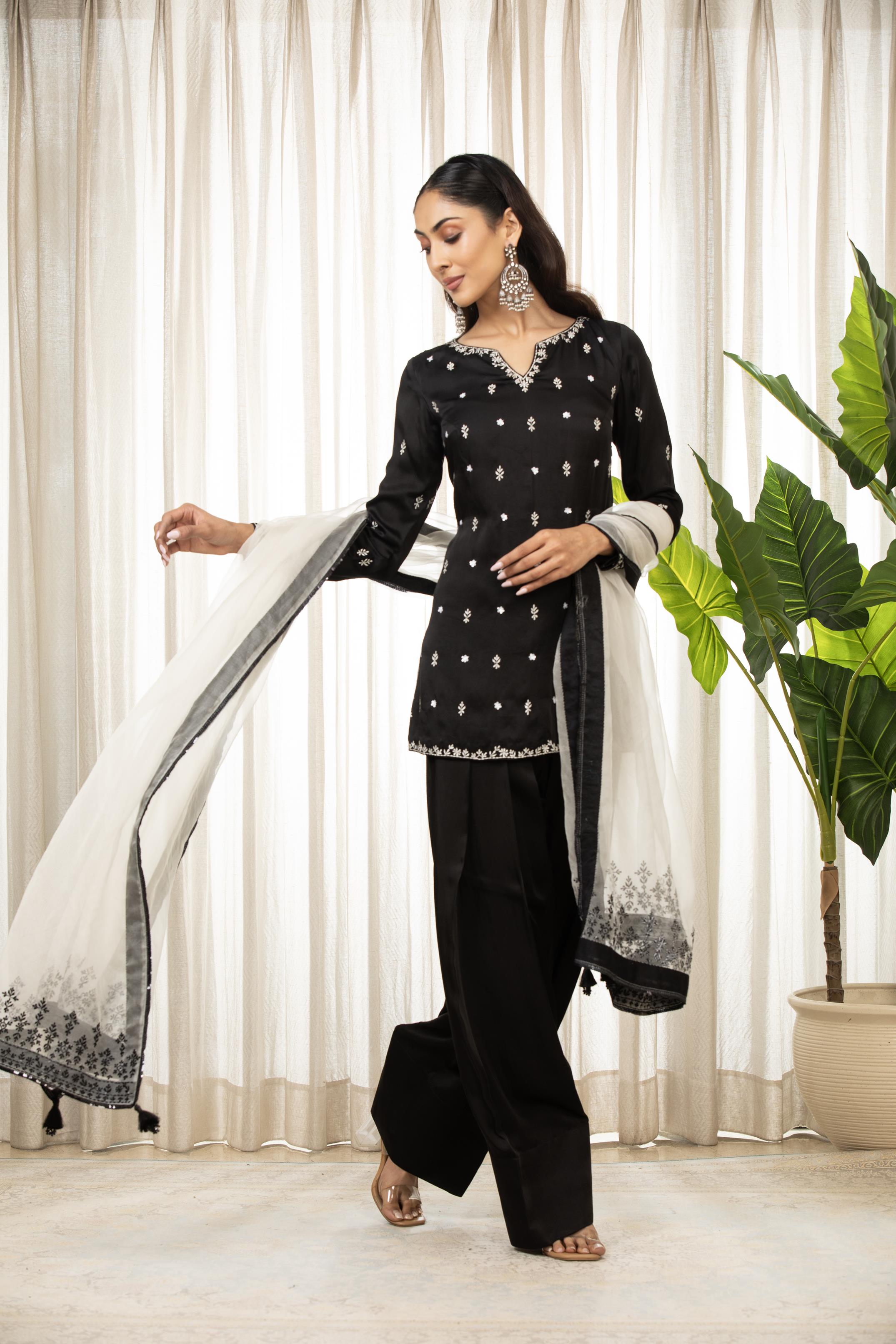 It consists of Bemberg pure satin kurta distinguished by it delicate embroidery. It is paired with organza dupatta and complimentary salwaar.