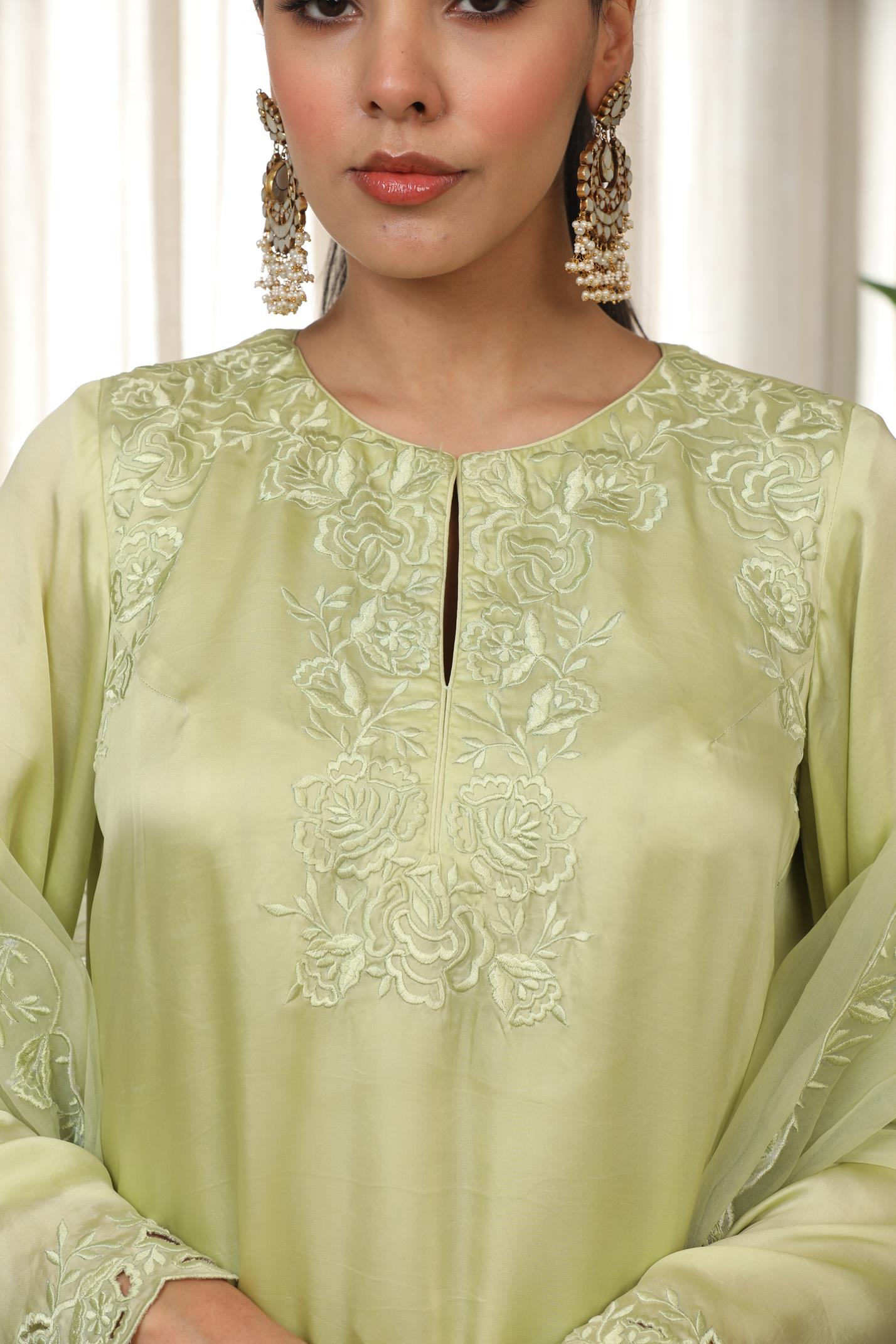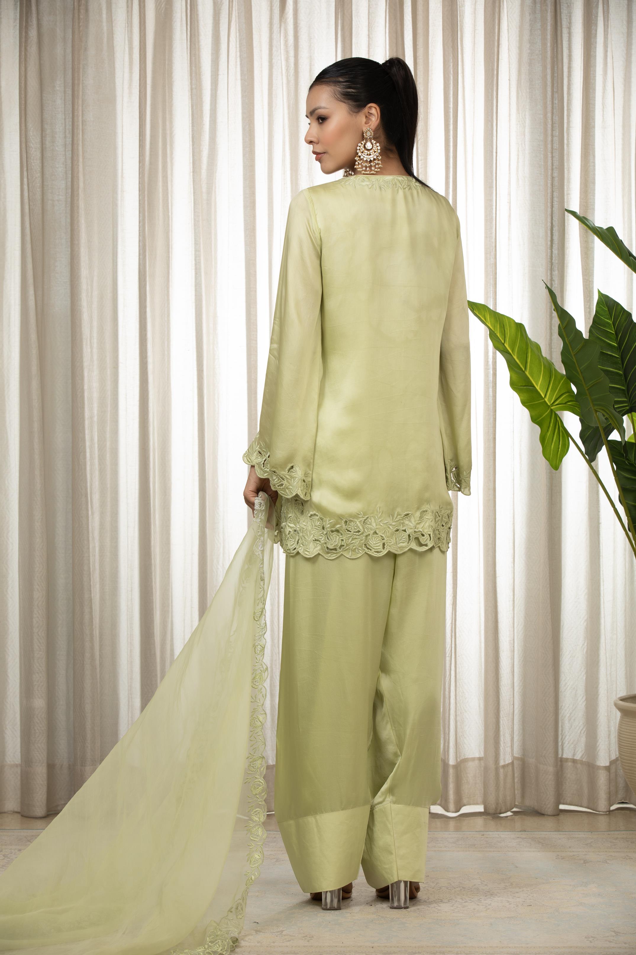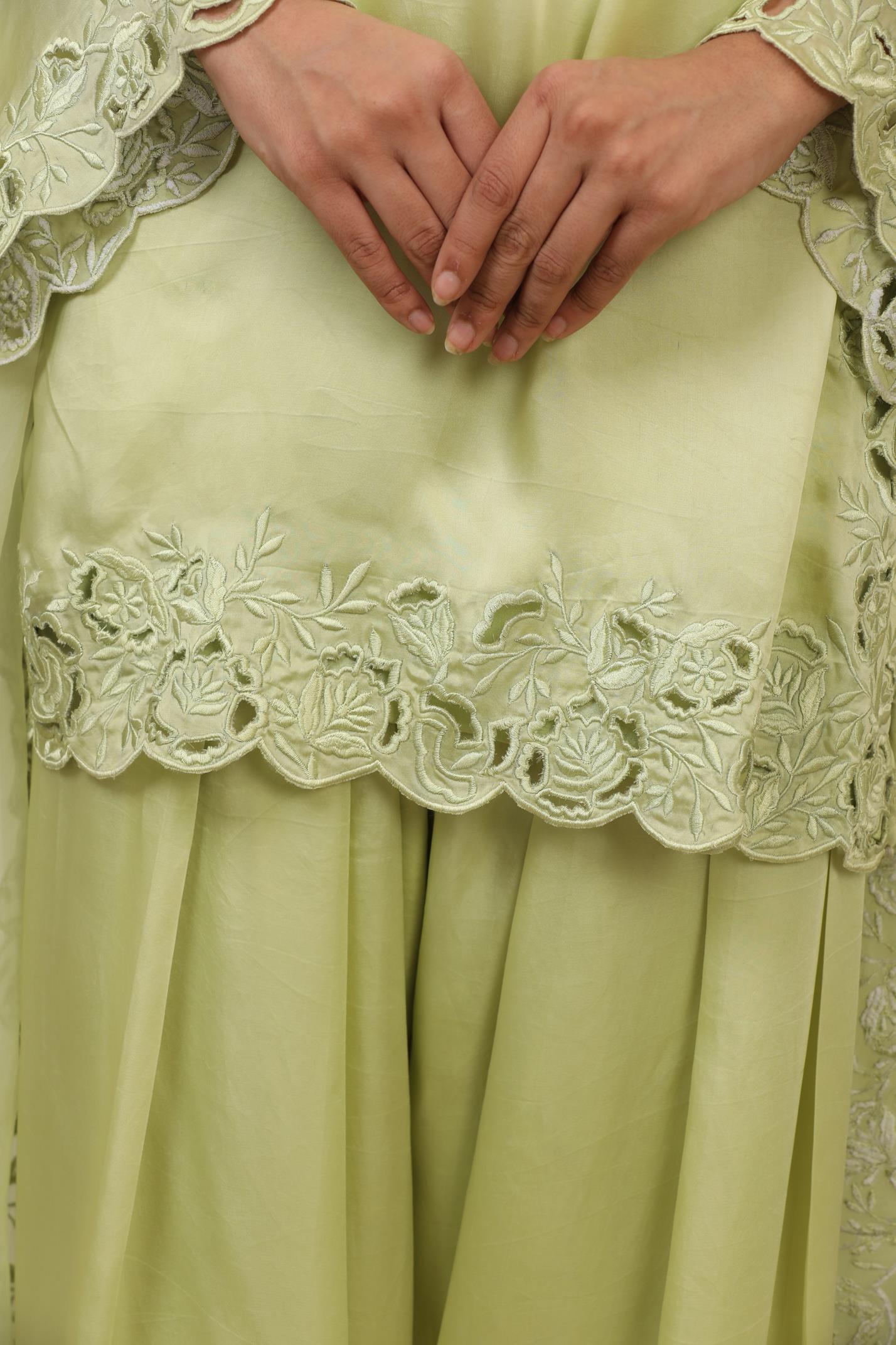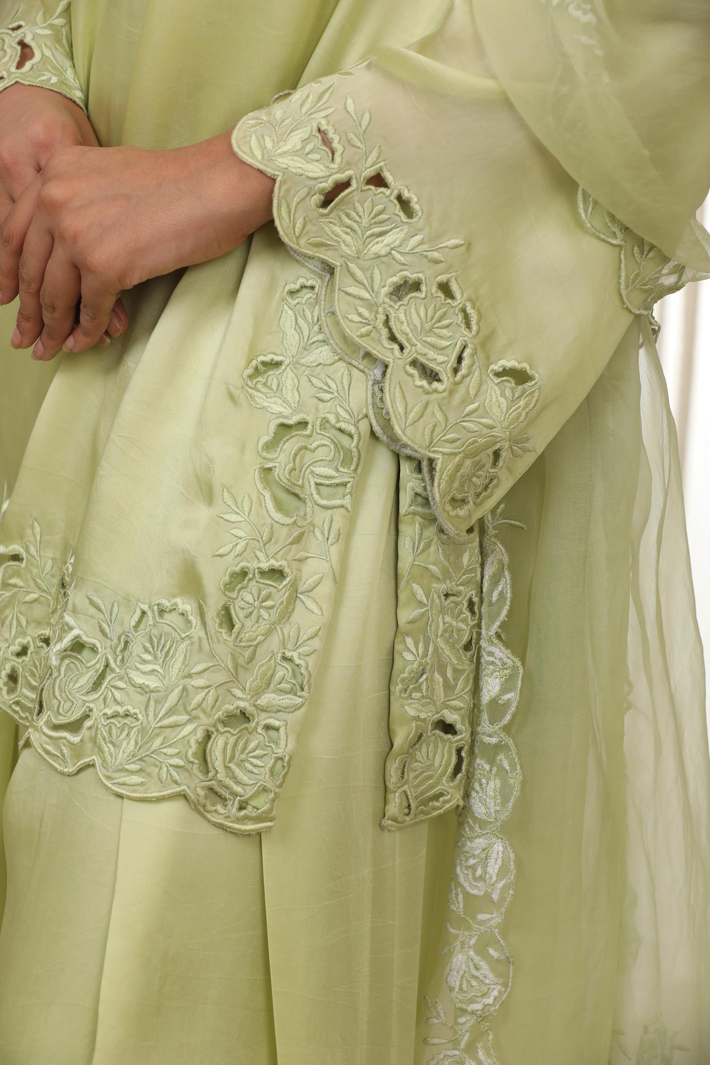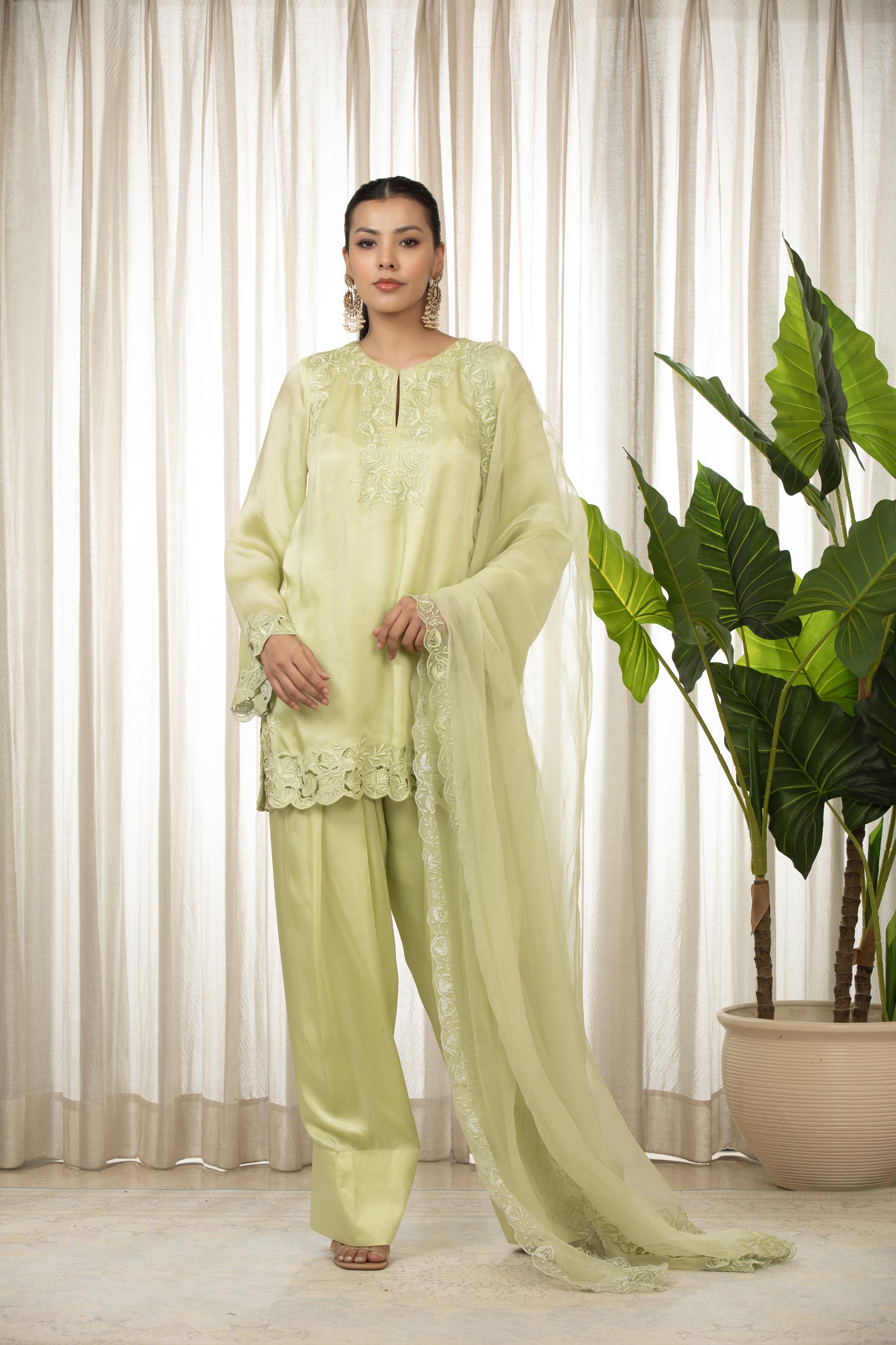 It consists of Bemberg pure satin kurta distinguished by it delicate cutwork embroidery. It is paired with organza cutwork dupatta and complimentary salwaar.