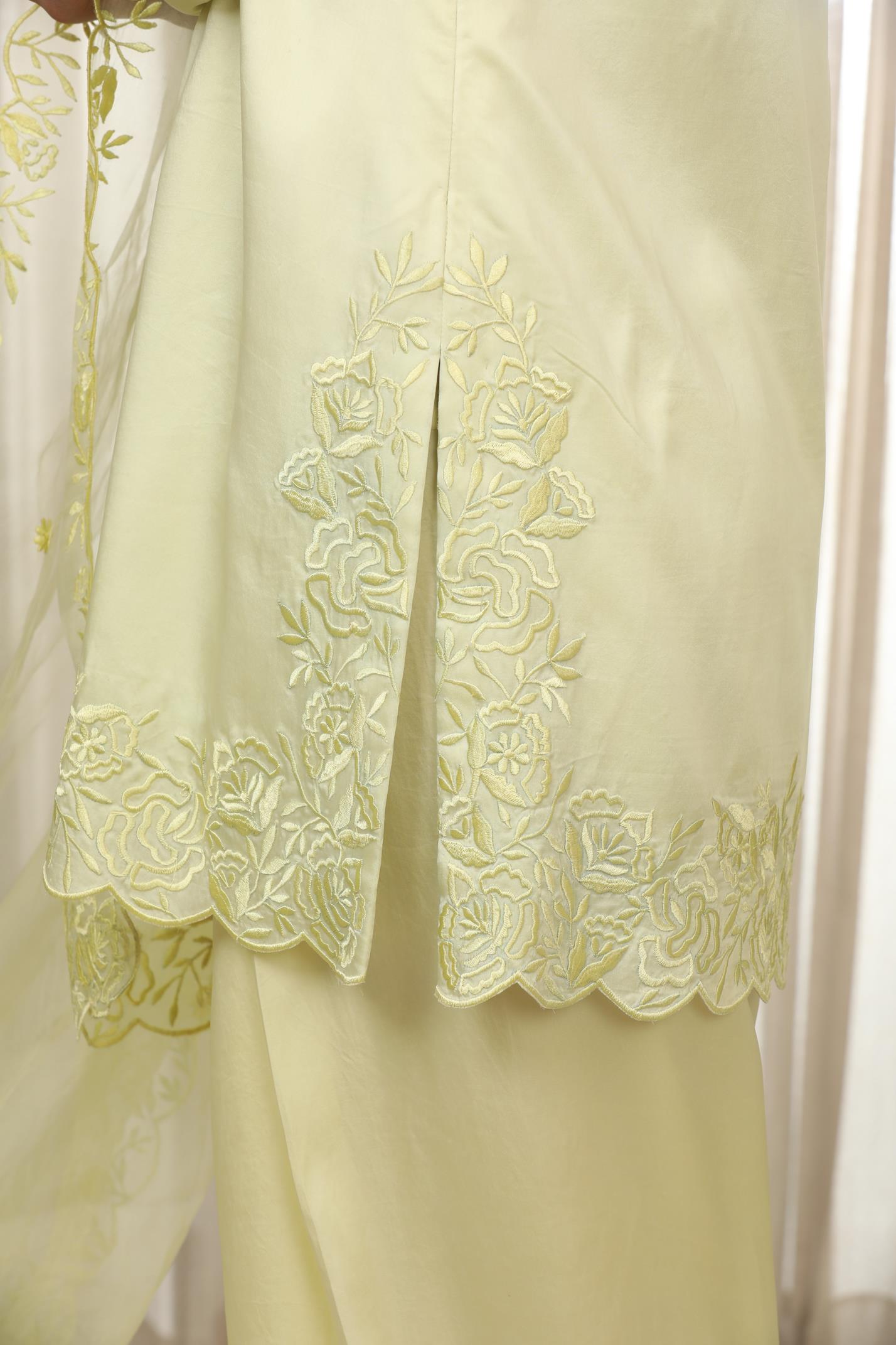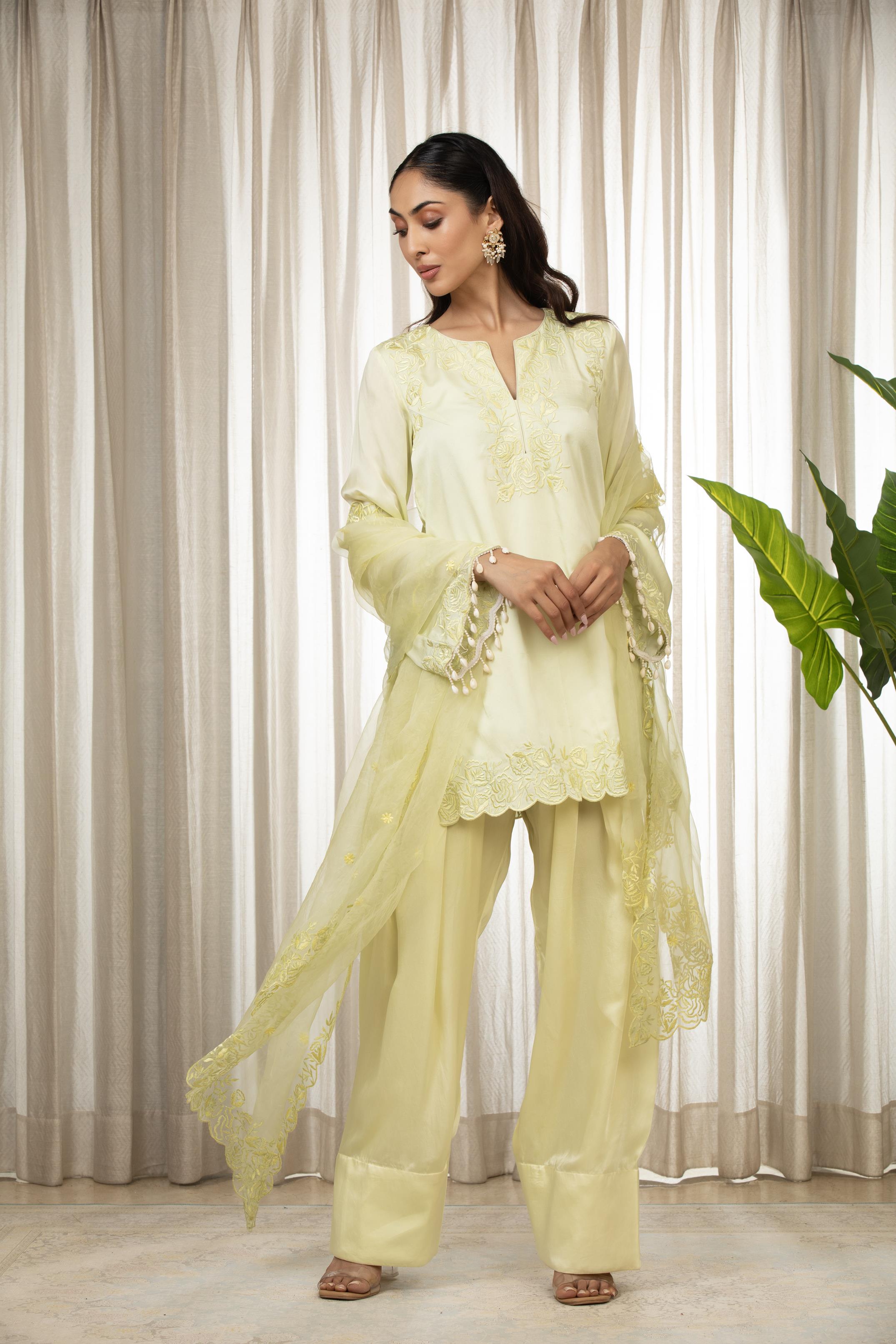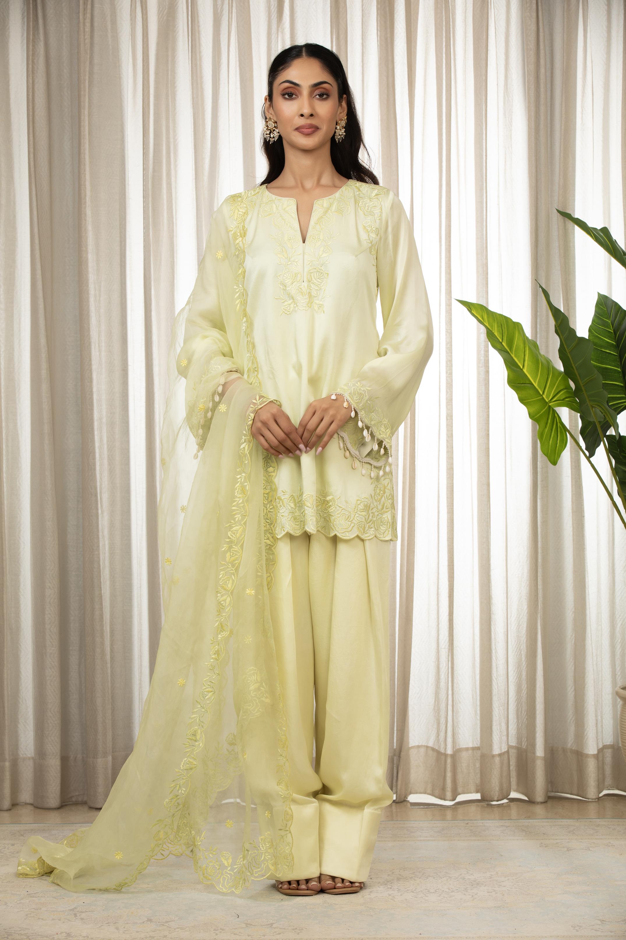 It consists of Bemberg pure satin kurta distinguished by it delicate cutwork embroidery. It is paired with organza cutwork dupatta and complimentary salwaar.