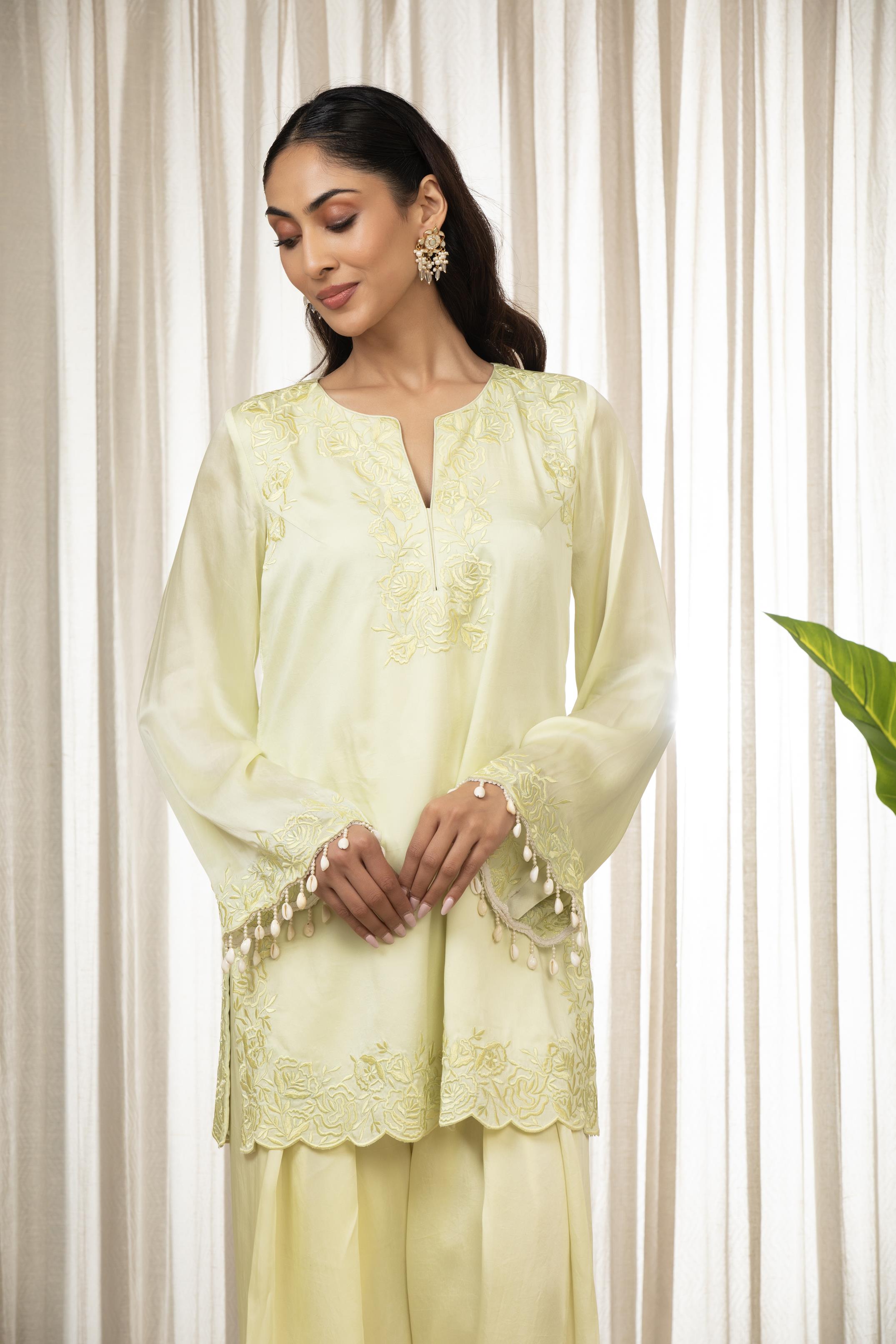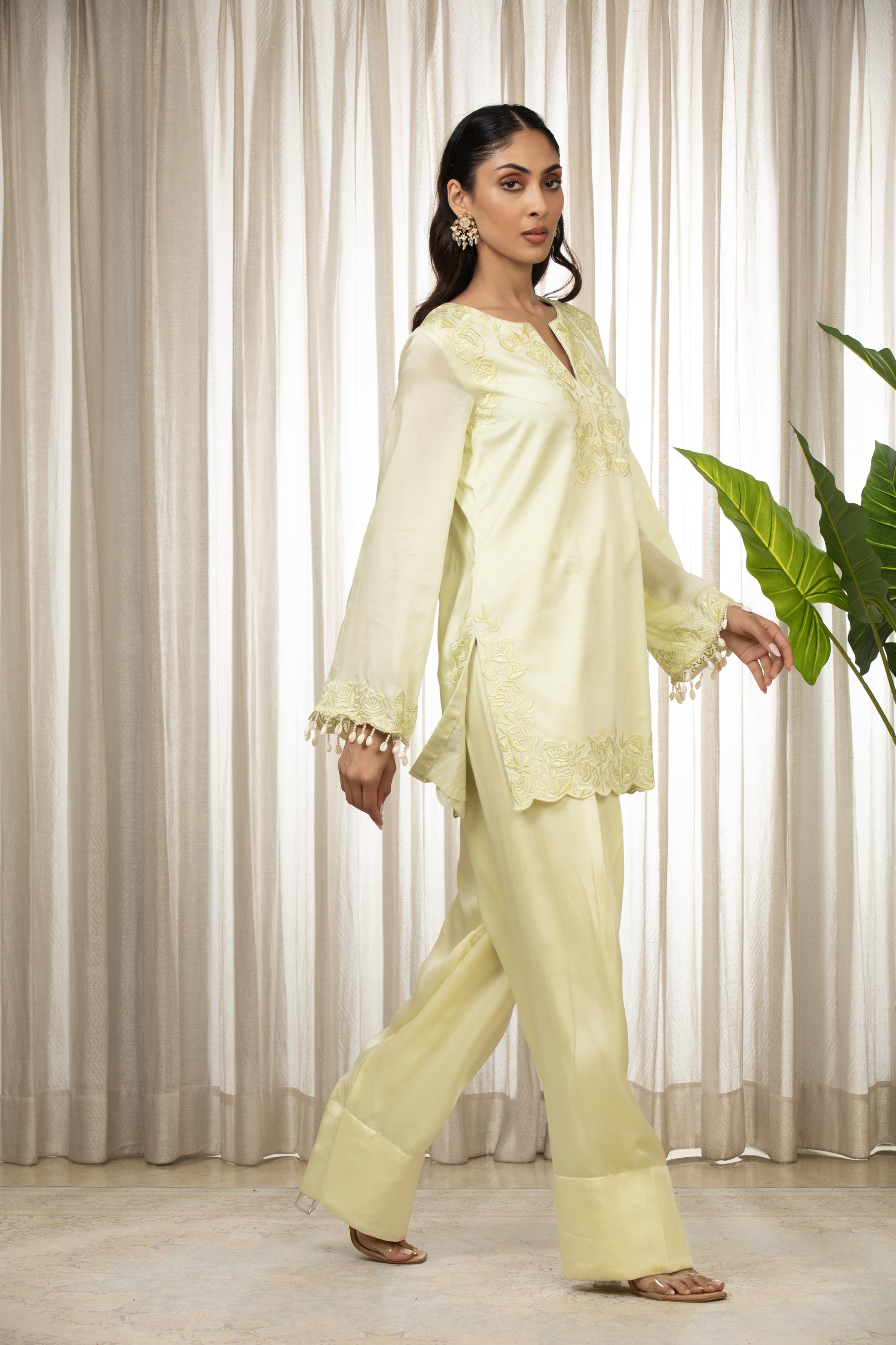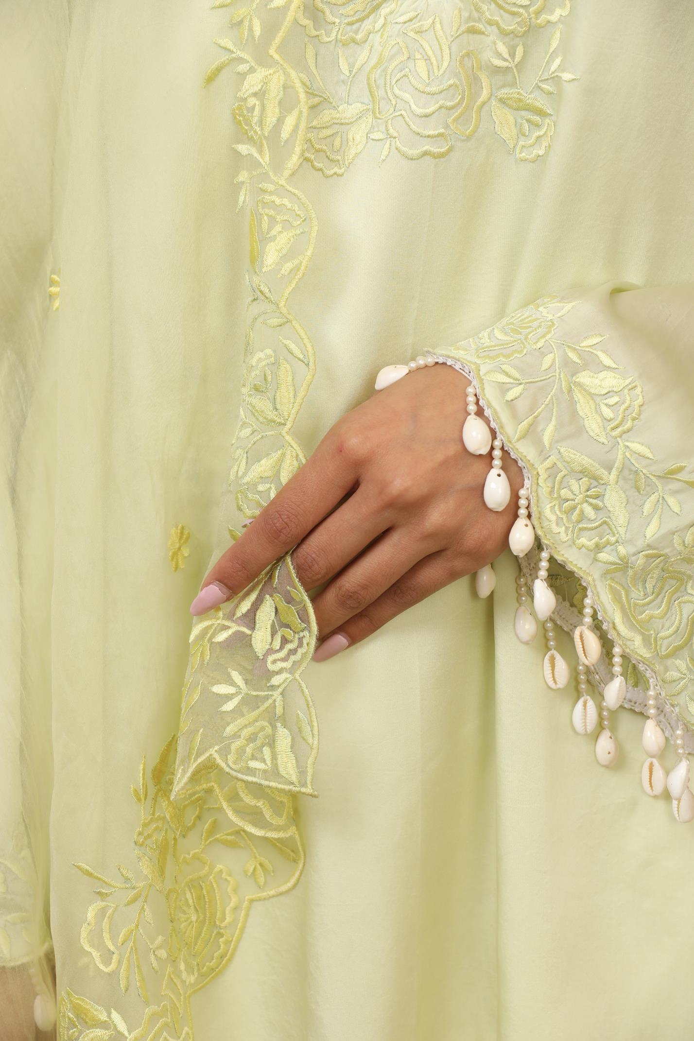 It consists of Bemberg pure satin kurta distinguished by it delicate cutwork embroidery. It is paired with organza cutwork dupatta and complimentary salwaar.