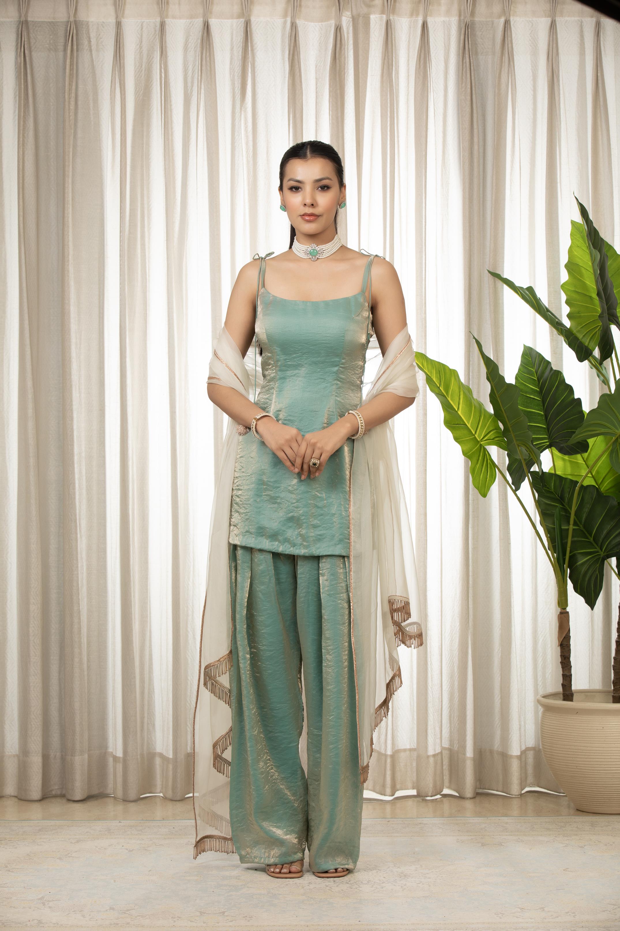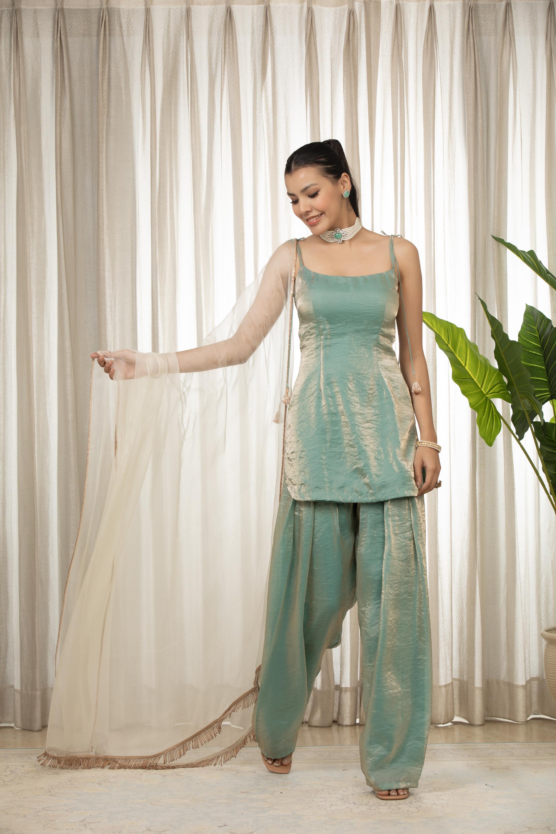It contains dori embellished kurta .It is paired with salwaar and organza dupatta adorned with lace at both corners.