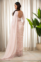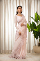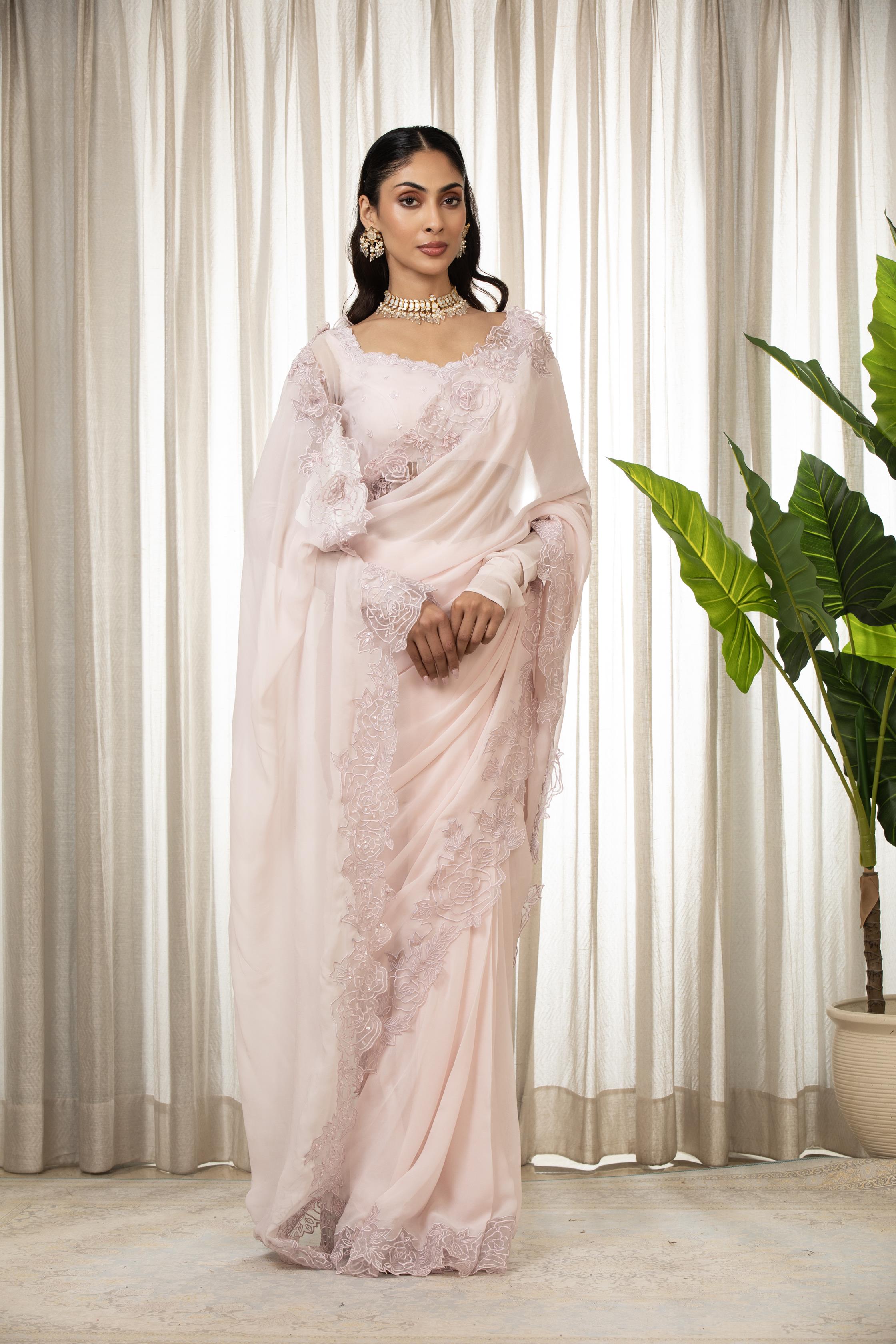 It consists georgette saree with detailed organza cutwork all over embellished with 3D cutwork and Handwork.It is Paired with georgette blouse with chudidaar sleeves and Peticoat.