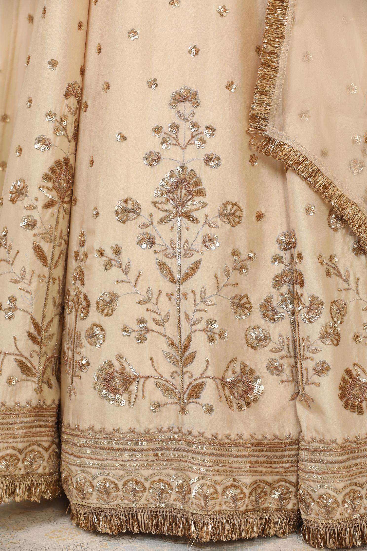 Featuring a Cream Lehenga in pure silk base with gota patti,dabka nakshi sequence and cutdana embellishment. It is paired with handwork blouse and an organza dupatta.