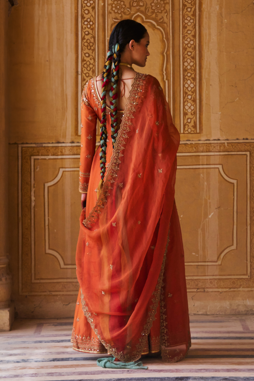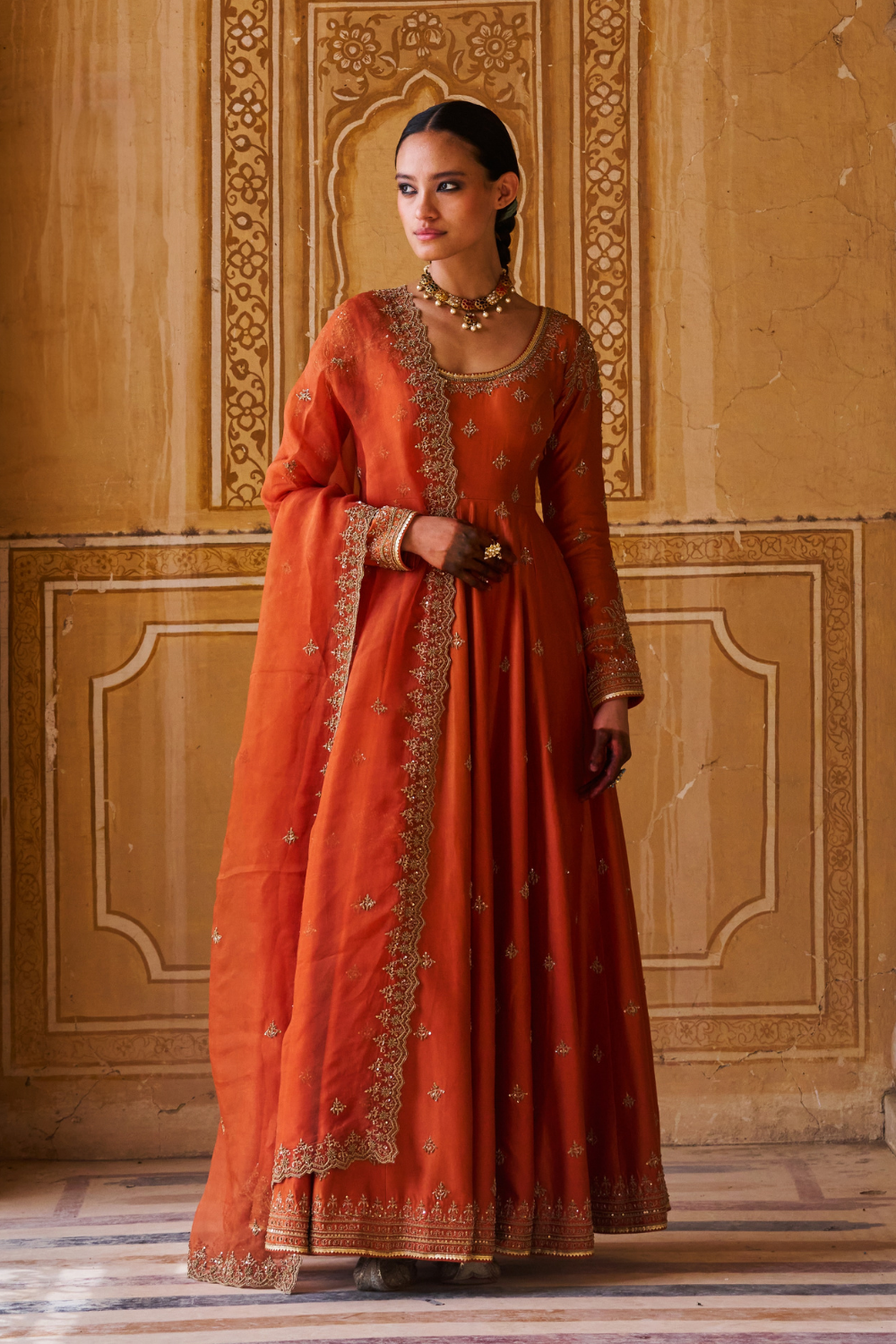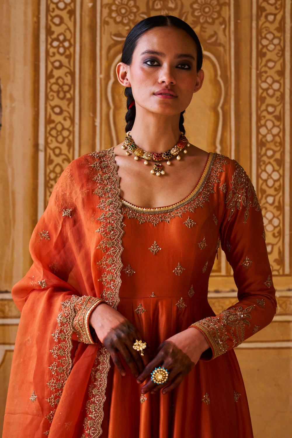 Featuring a rust chanderi silk anarkali set paired with an organza base dupatta with antique gold dori and embellished hand embroidery.