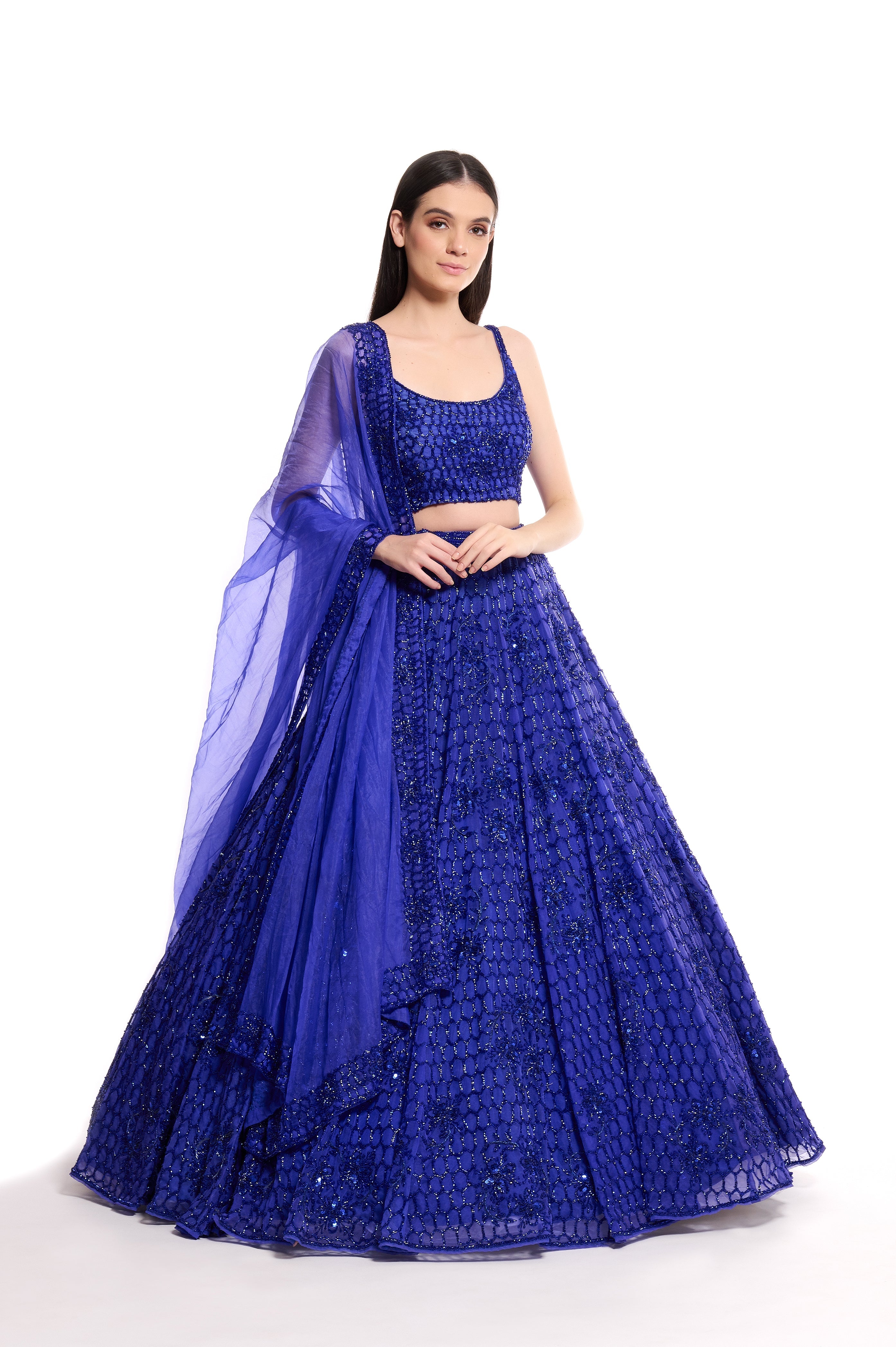 Fully hand embroidered lehenga set done on organza fabric with cutdana, sequin, crystal detailing . This graceful lehenga set is paired with crystal, sequin and cutdana detailed dupatta on all four sides.