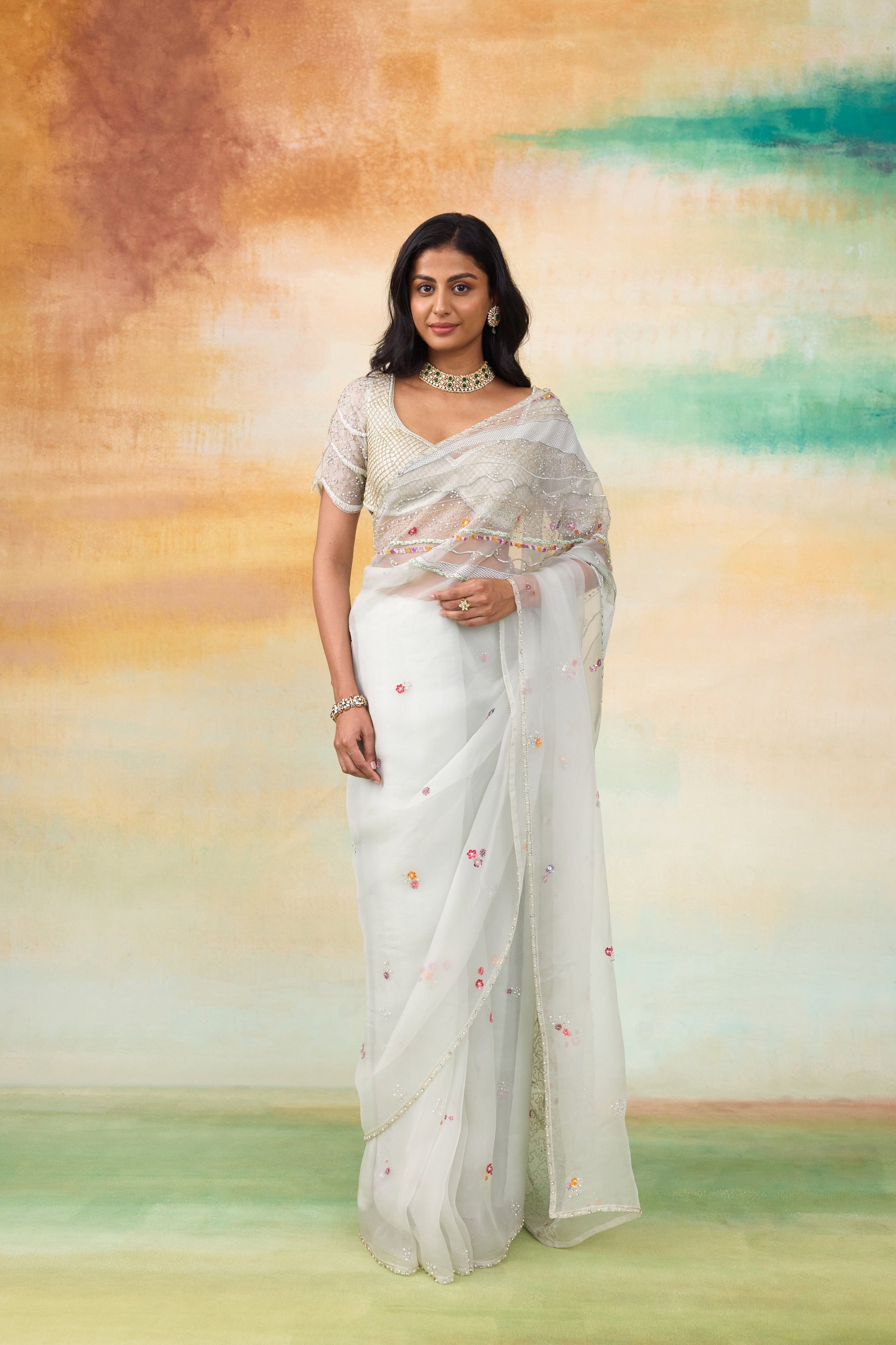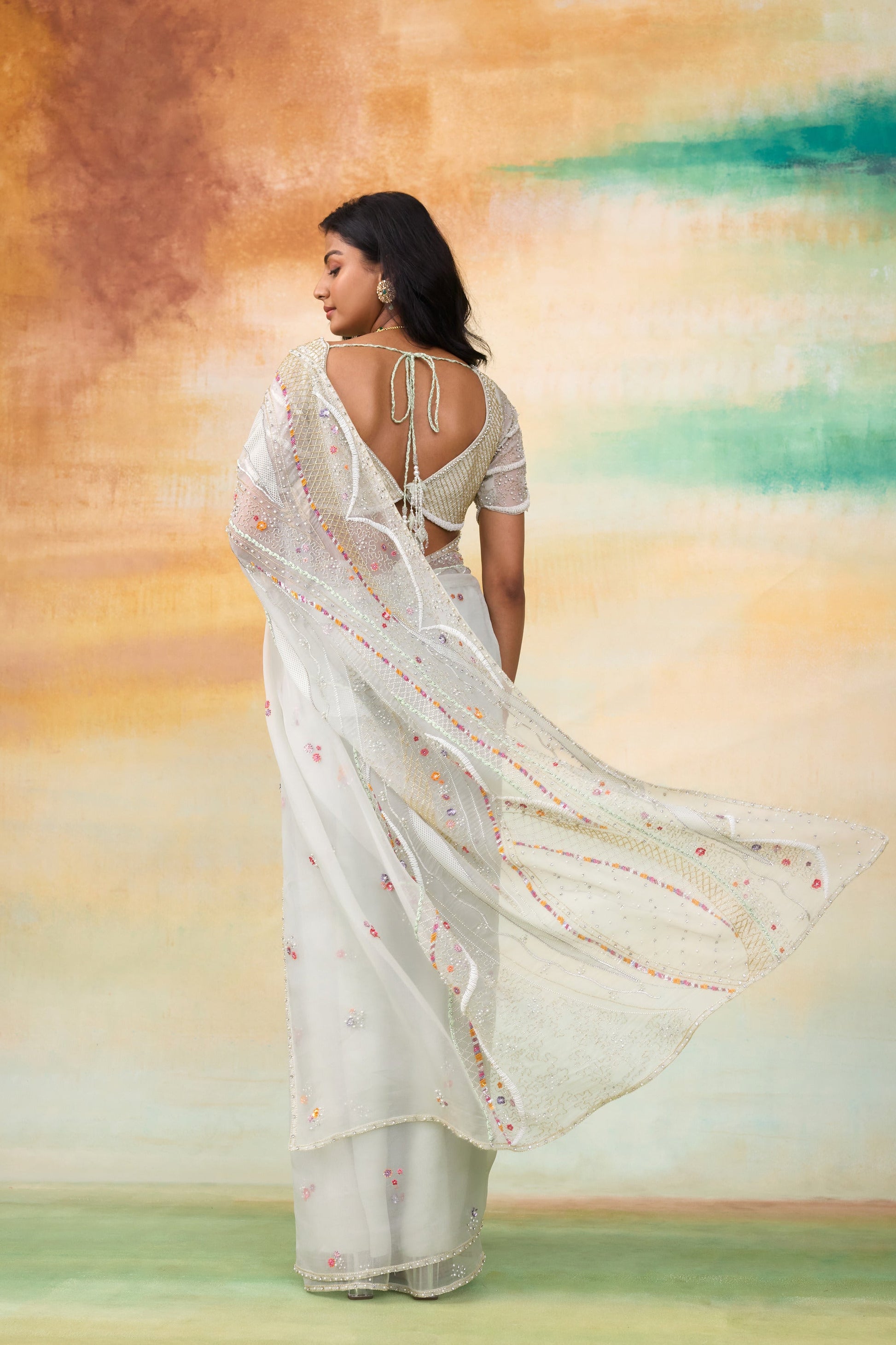 The elena serene mint silk organza saree is a breathtaking blend of a artistry and elegance. This exquisite saree features amorphous shaped multicolor