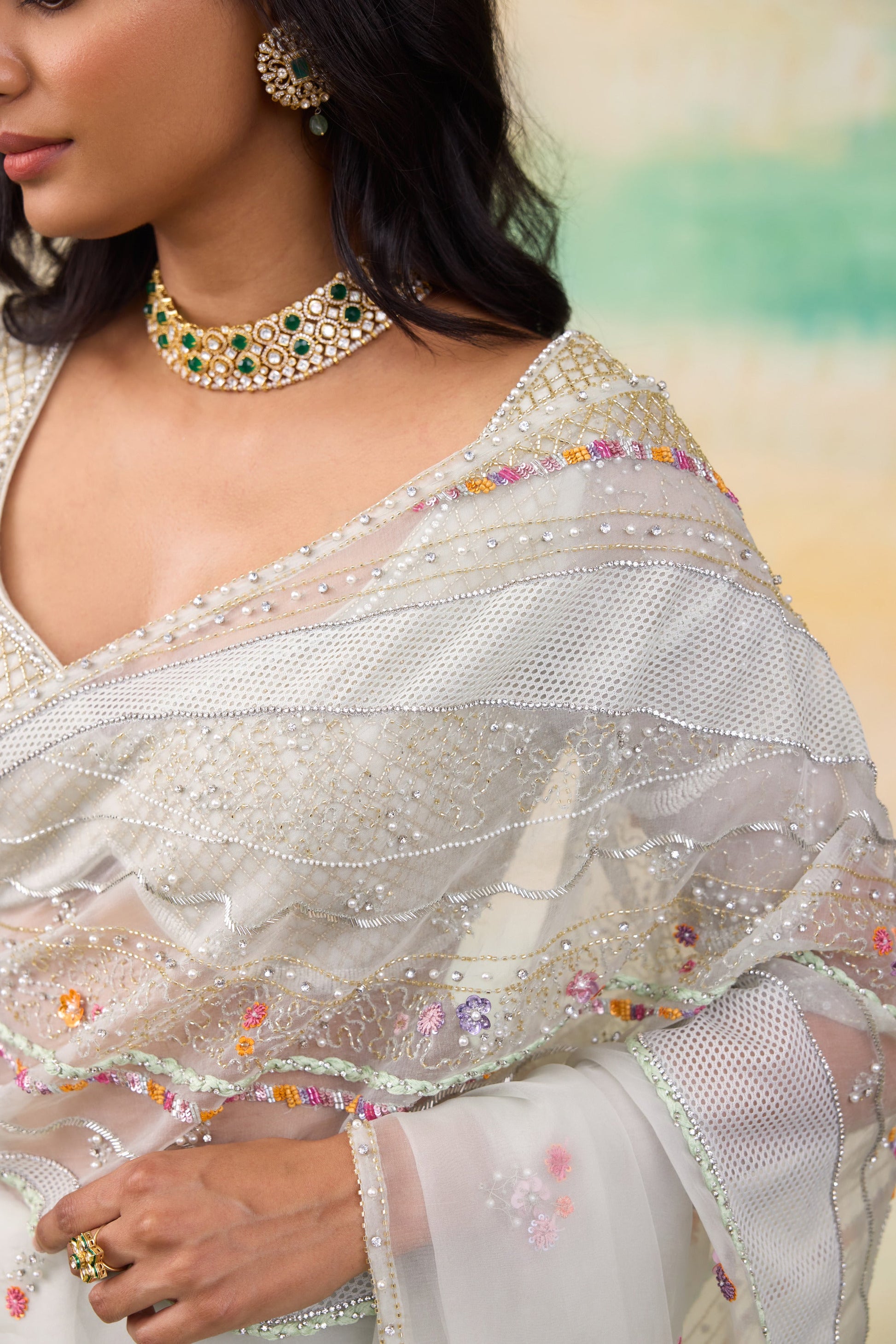 Embroidery patterns in graceful swirl designs, enhanced with textured fabric patching for added dimension. Hand embroidered pearls, crystal stones, and a mix of silver and gold embellishments adorn the fabric, while delicate small and intricate floral motifs add a touch of finesse. Paired with a highly embellished blouse showcasing a golden check pattern, this ensemble radiates sophistication and is perfect for making a stunning impression.