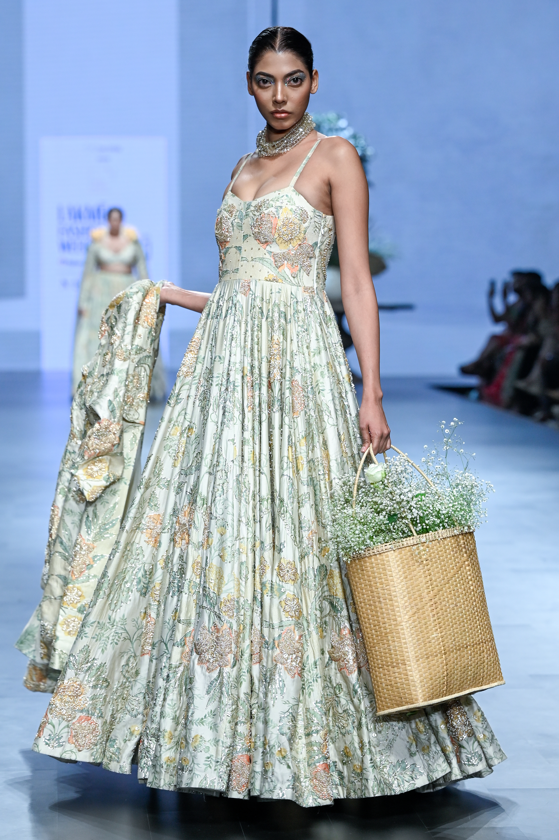 An embroidered corset anarkali set in our signature yellow and orange floral print, paired with a hand–embroidered printed matching long jacket.
