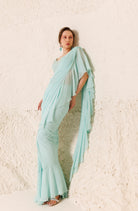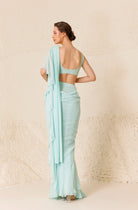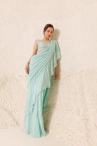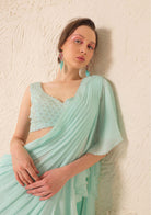An aqua draped saree, featuring pearl embellishments along the edging and paired with a rhinestone embellished blouse, creating a harmonious blend of textures and sparkle.