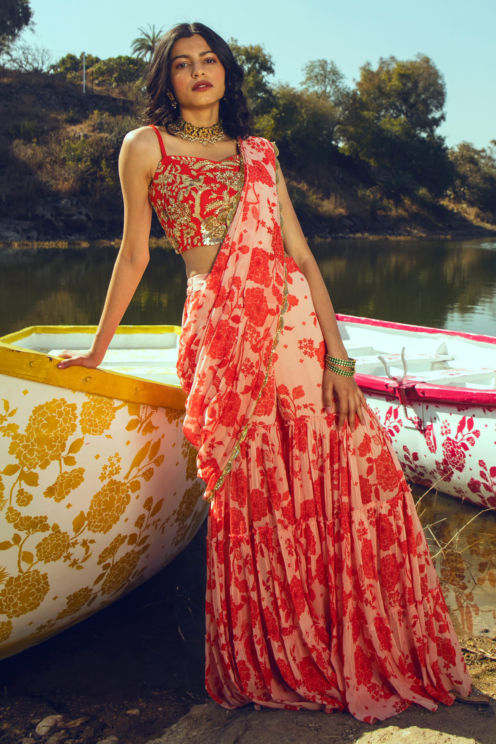 An onion pink and red bird print sharara saree with hand embroidered gold lace, paired with a red strappy blouse heavily embroidered in our stunning bird print with cutdana, moti and sequins. Elegant and easy to wear, perfect to dance the evening away in.