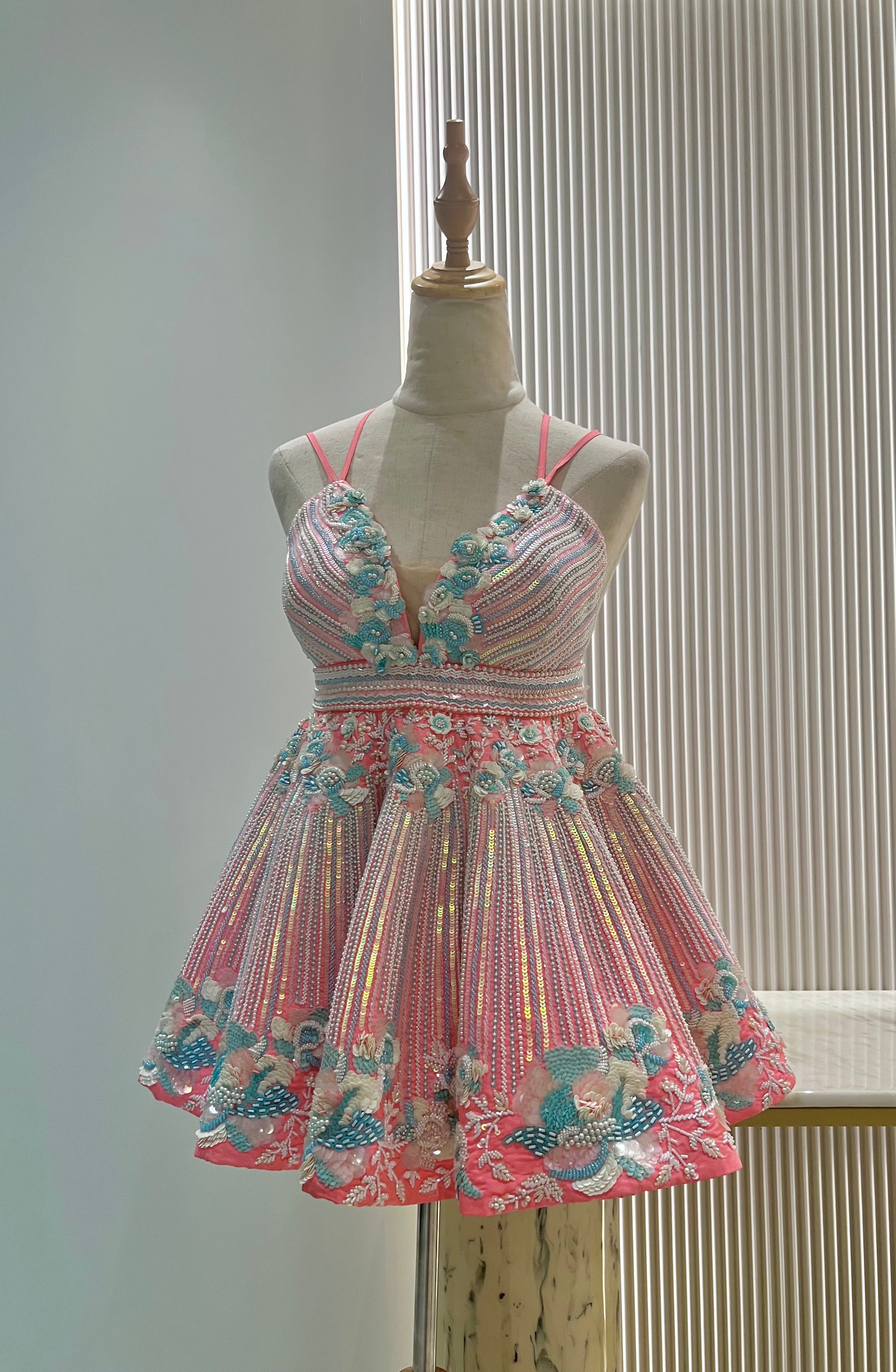 The Coral Pink Elsa Dress which is intricately hand embroidered silk taffeta with our signature pearls, sequins and glass beads.
