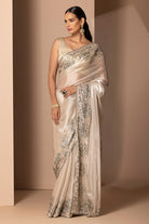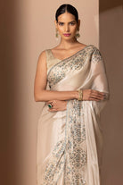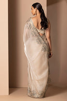 A Soft Silk Organza saree embellished with rhinestones, paired with a rhinestones adorned Art Satin blouse, creating an elegant look.