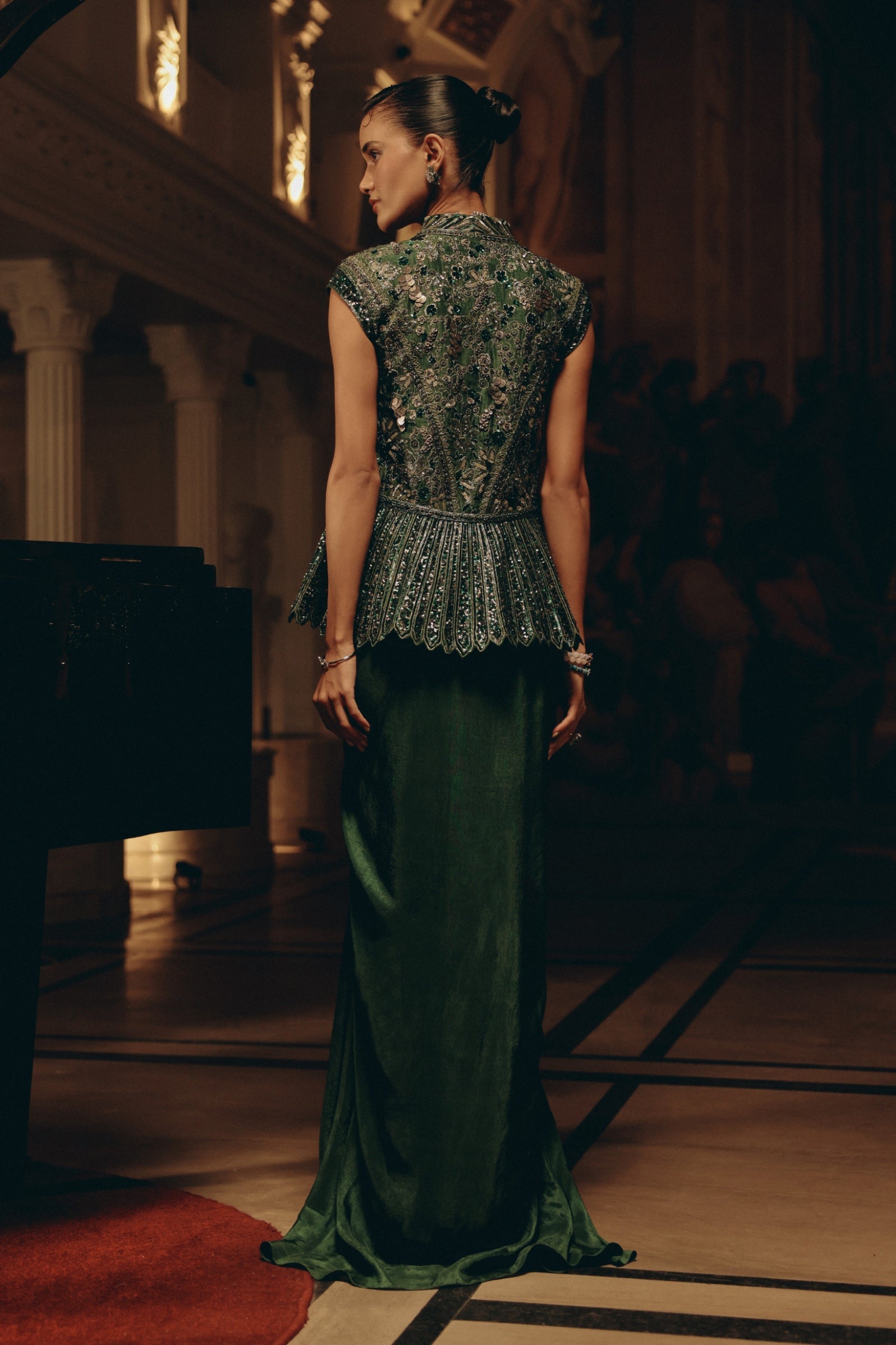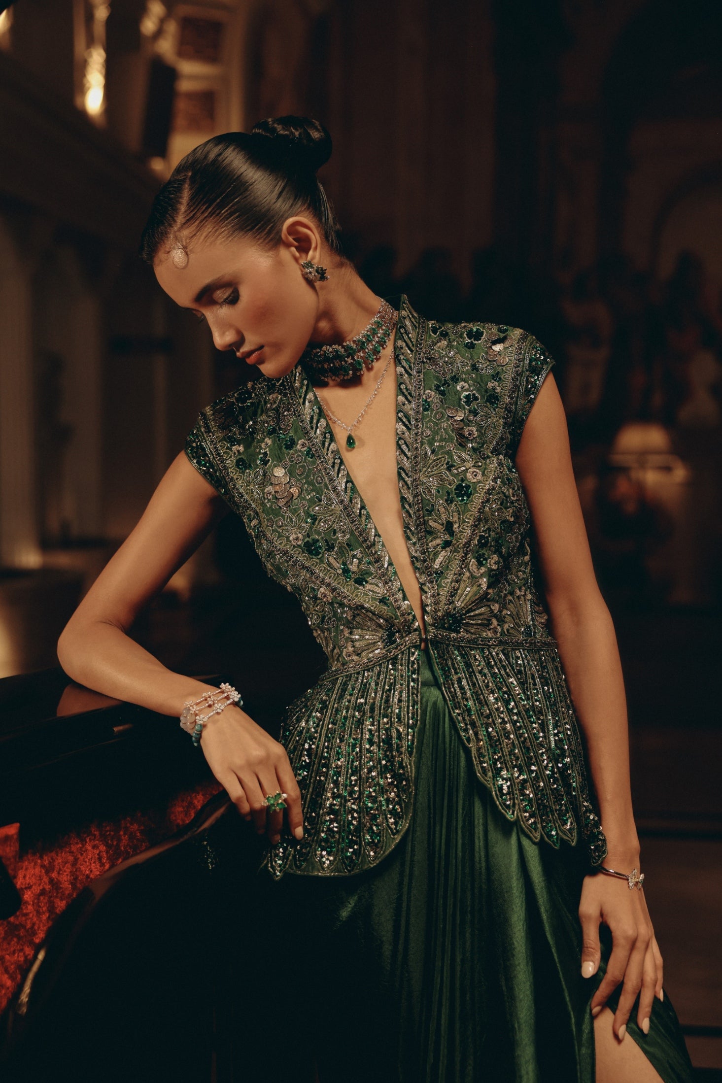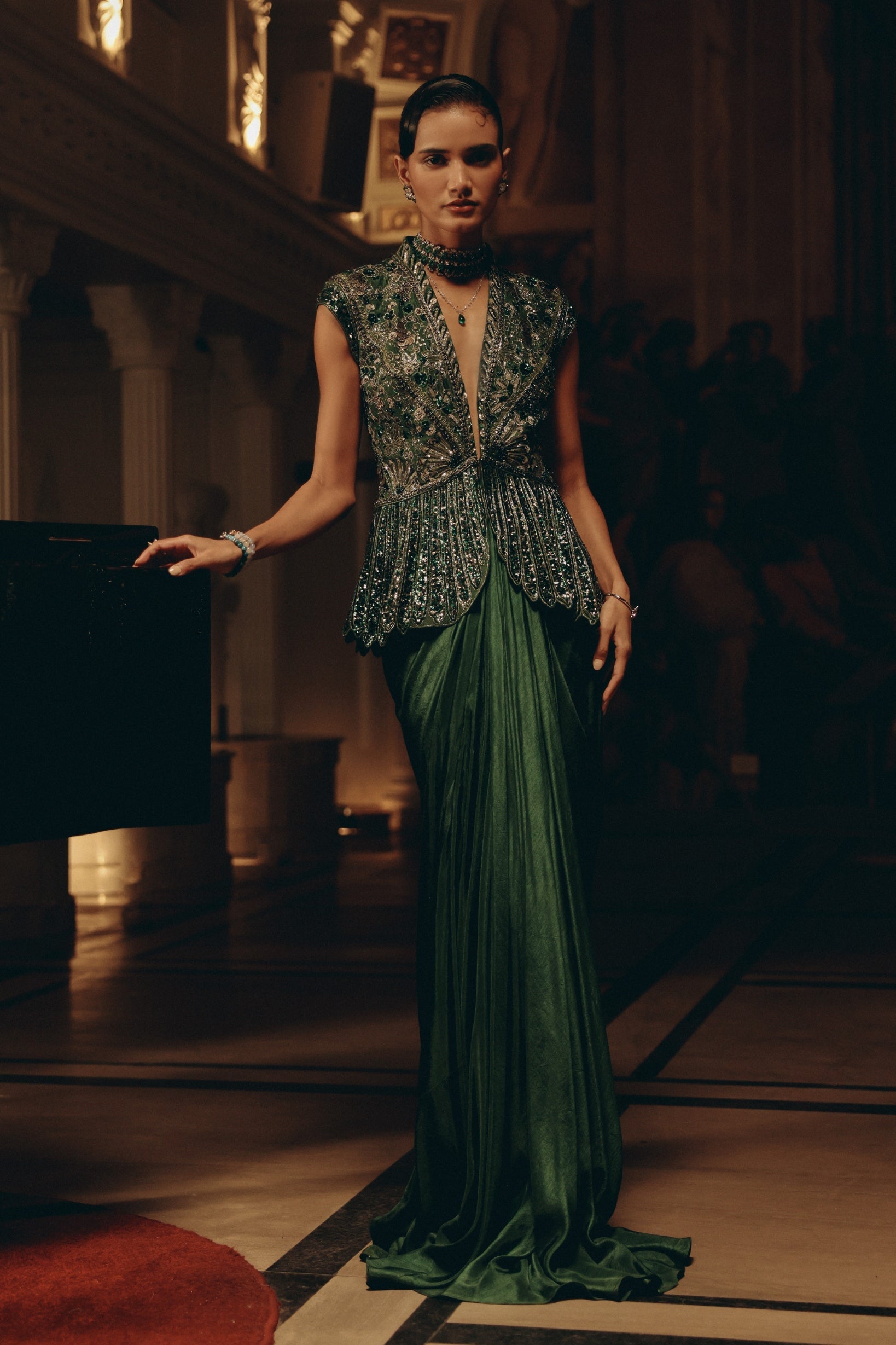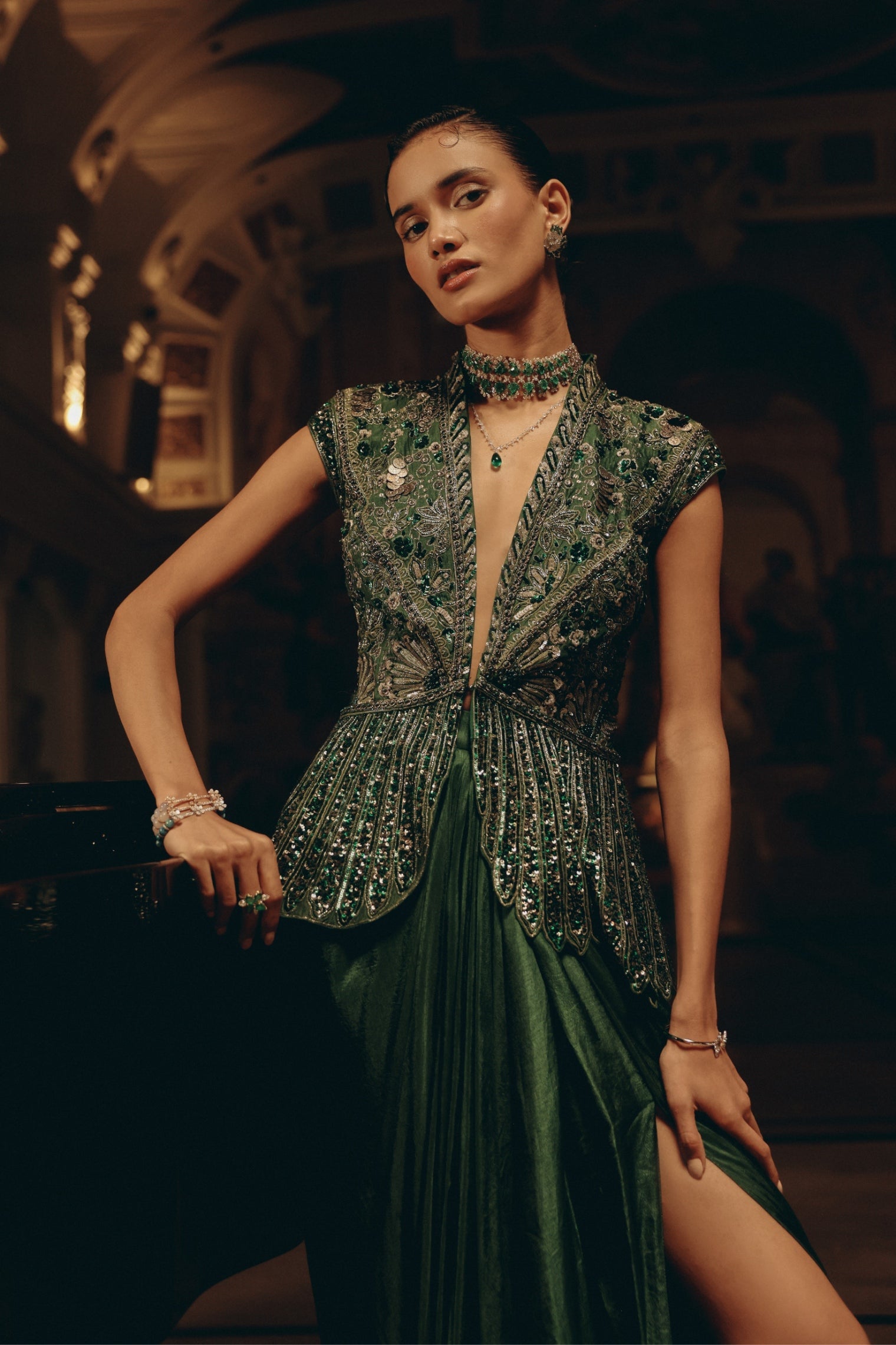 Deep V-neck jacket-style bodice in a rich spectrum of forest green and bronze tones. Adorned with a dazzling array of sequins, delicate beads, and intricate thread work. The bodice creates a striking silhouette with its structured shoulders and cinched waist, flaring out gently before cascading into a dramatic, high-slit pleated satin skirt