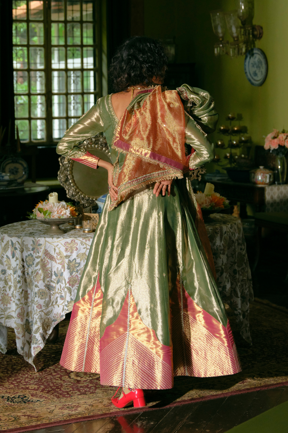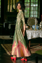 This Kalidar Anarkali set in emerald green silk zari tissue and Jacquard silk Banarasi features Jharokha-inspired panels with elongated paisley embroidery in zari and zardozi. The ensemble is completed with an emerald green tissue dupatta, adorned with Jharokha-inspired panels and pearl detailing.