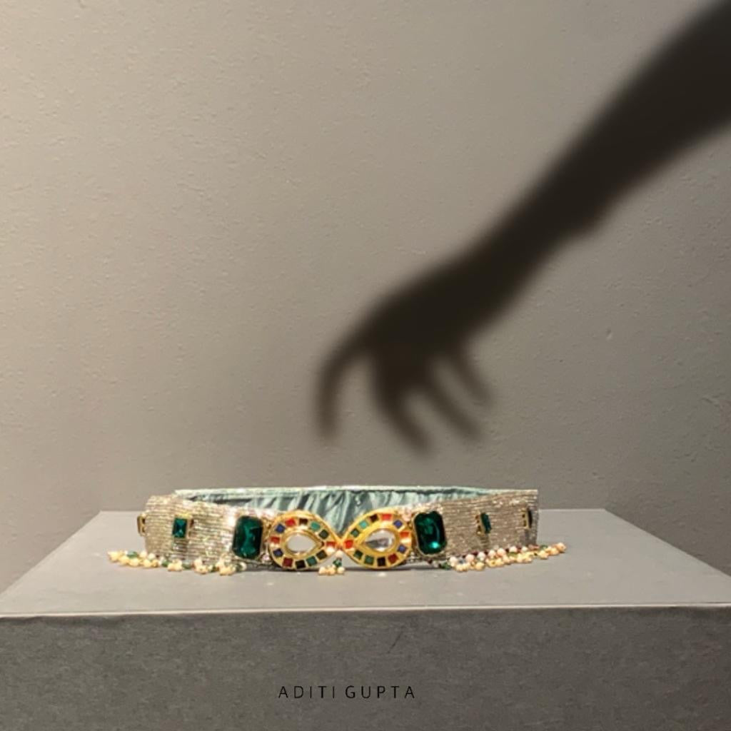 Emerald Teardrop shaped meenakari kundan handcrafted semi-precious jewelled waist belt with nakshi embroidery and moti work .