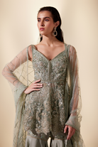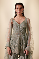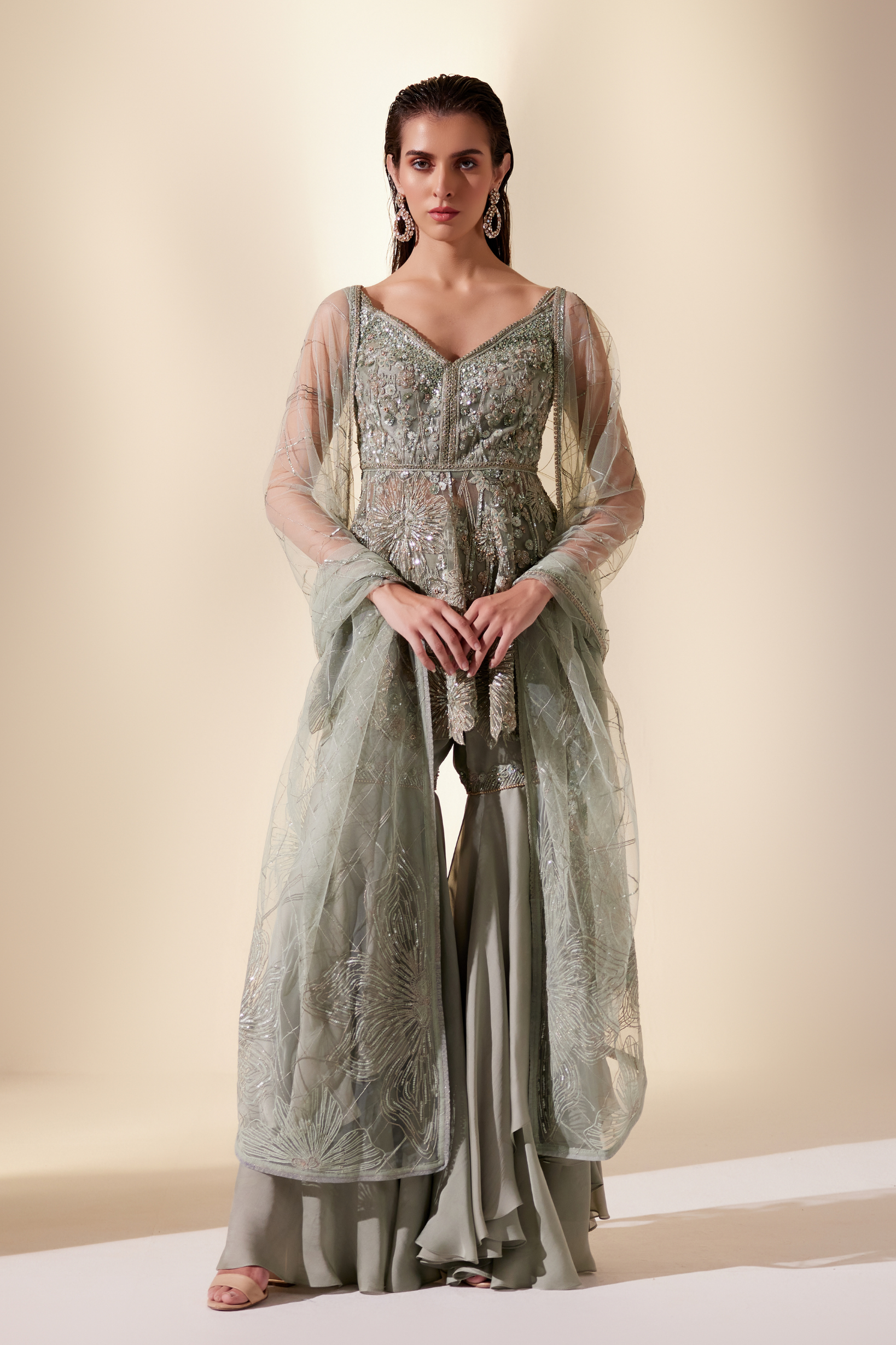 Crafted in a soft pastel green hue embroidered kurta paired with swirl pattern sharara.