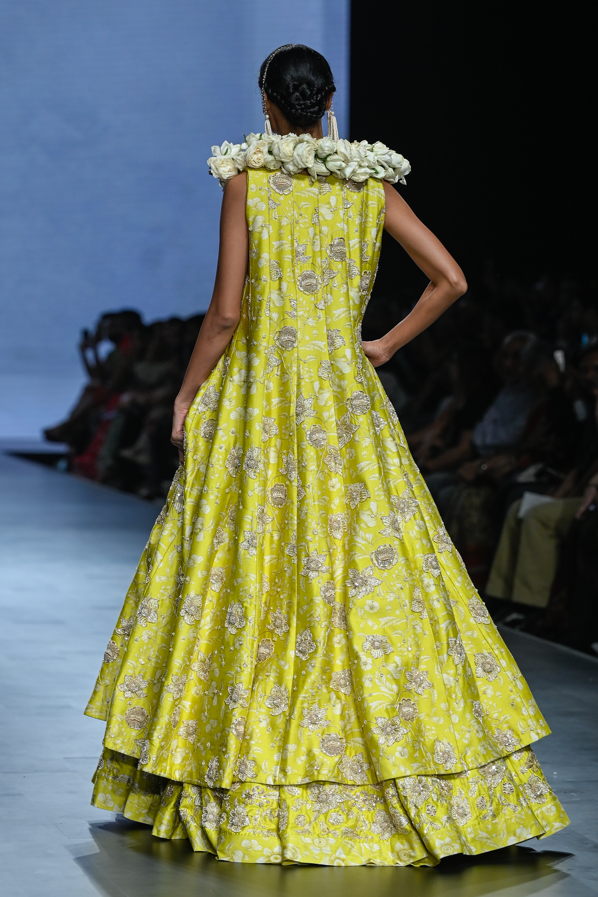 A lime yellow vintage floral printed lehenga set, this set is hand–embroidered using zardosi technique. It is paired with embroidered scallop detailed blouse and long kali jacket.