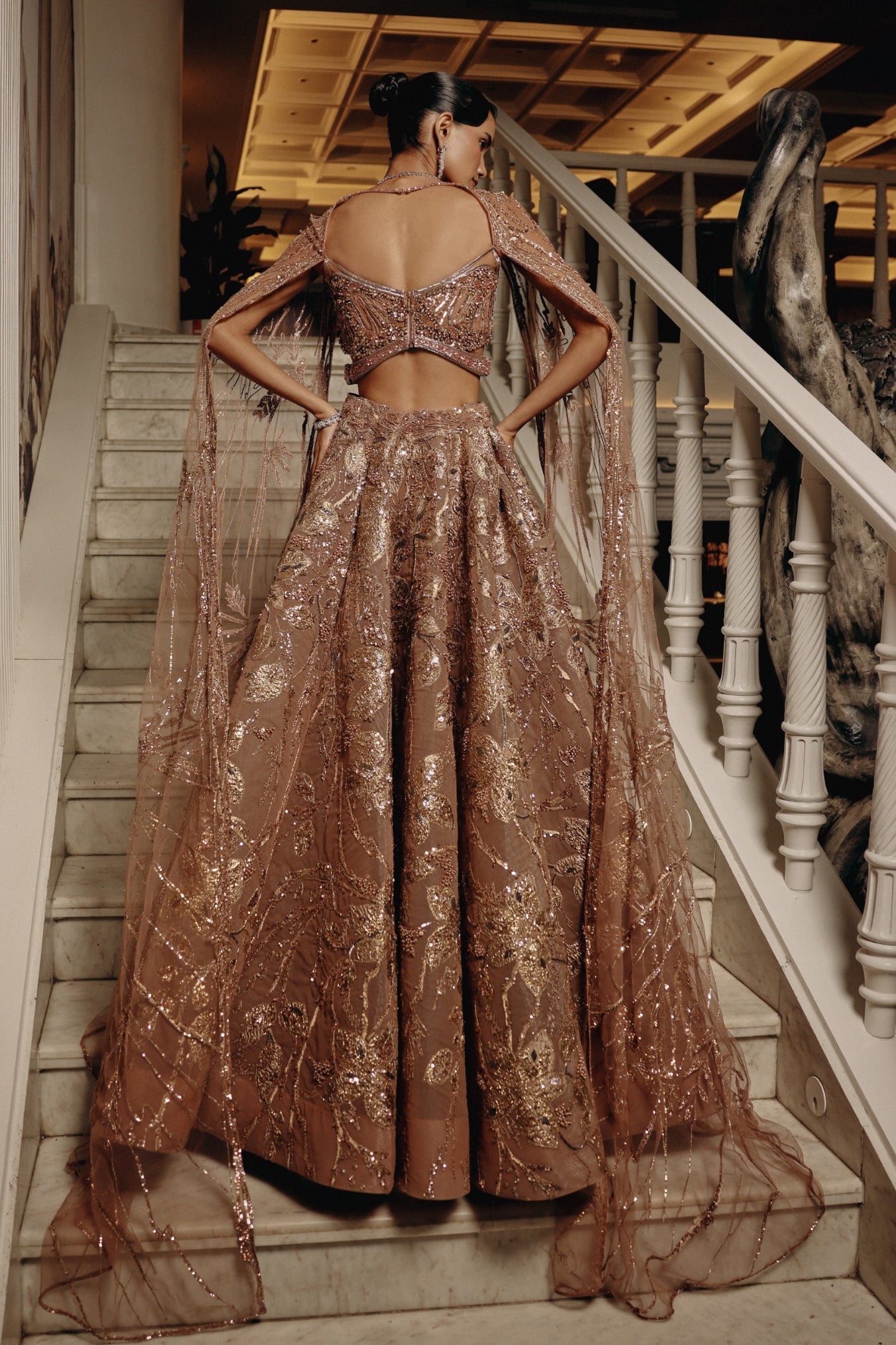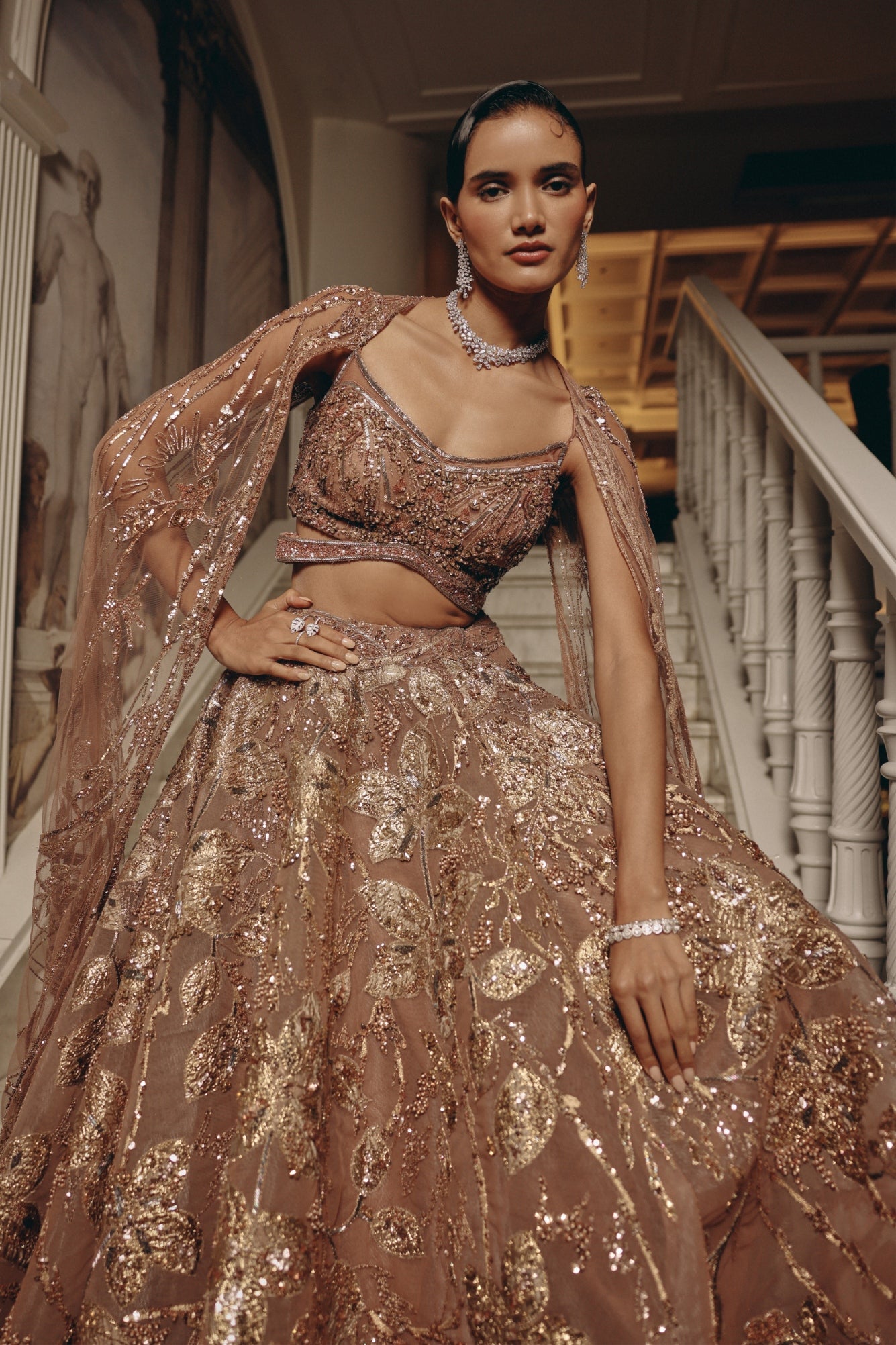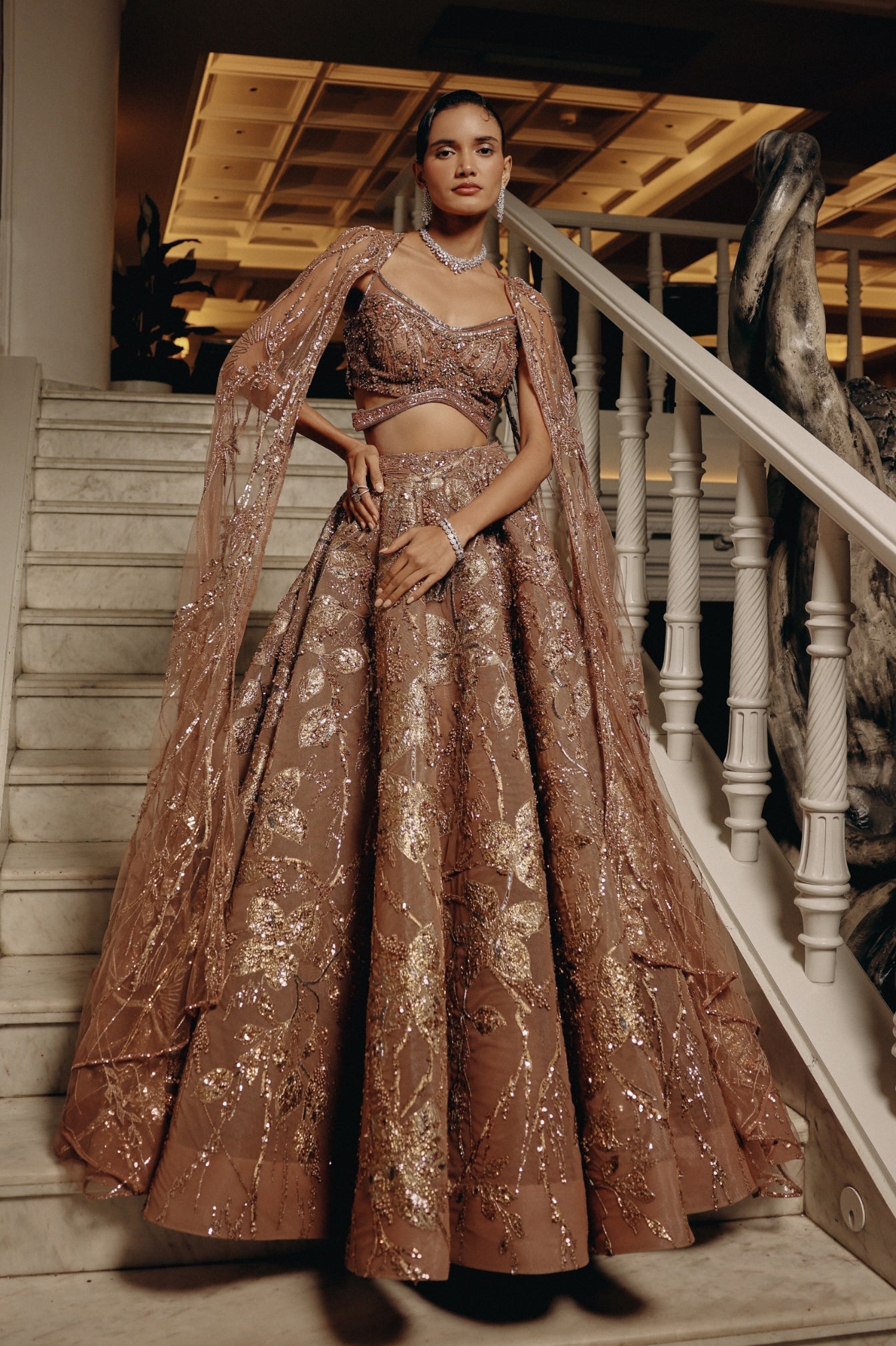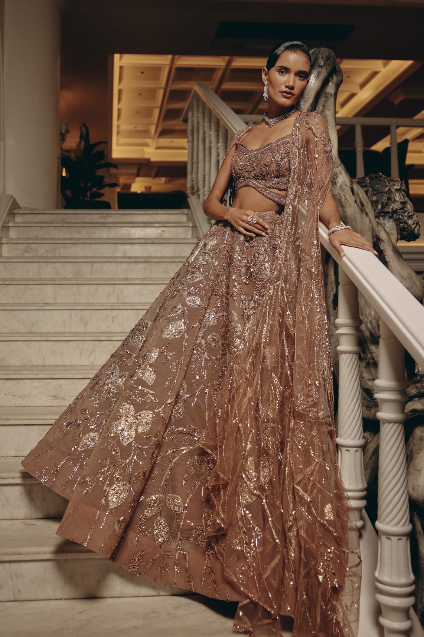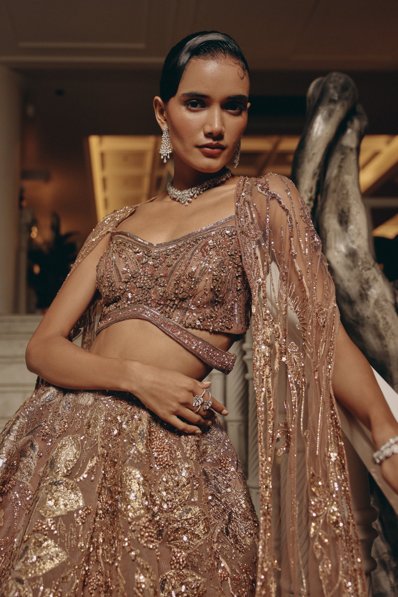 Radiating soft grandeur, this rose-gold lehenga is a celebration of light and artistry. The intricately embroidered blouse, paired with a voluminous skirt, shimmers with sequins, beads, and crystal embellishments that capture every glimmer. A sheer embellished dupatta, draped with effortless elegance, completes the look — blending tradition with a contemporary aura of luxury.