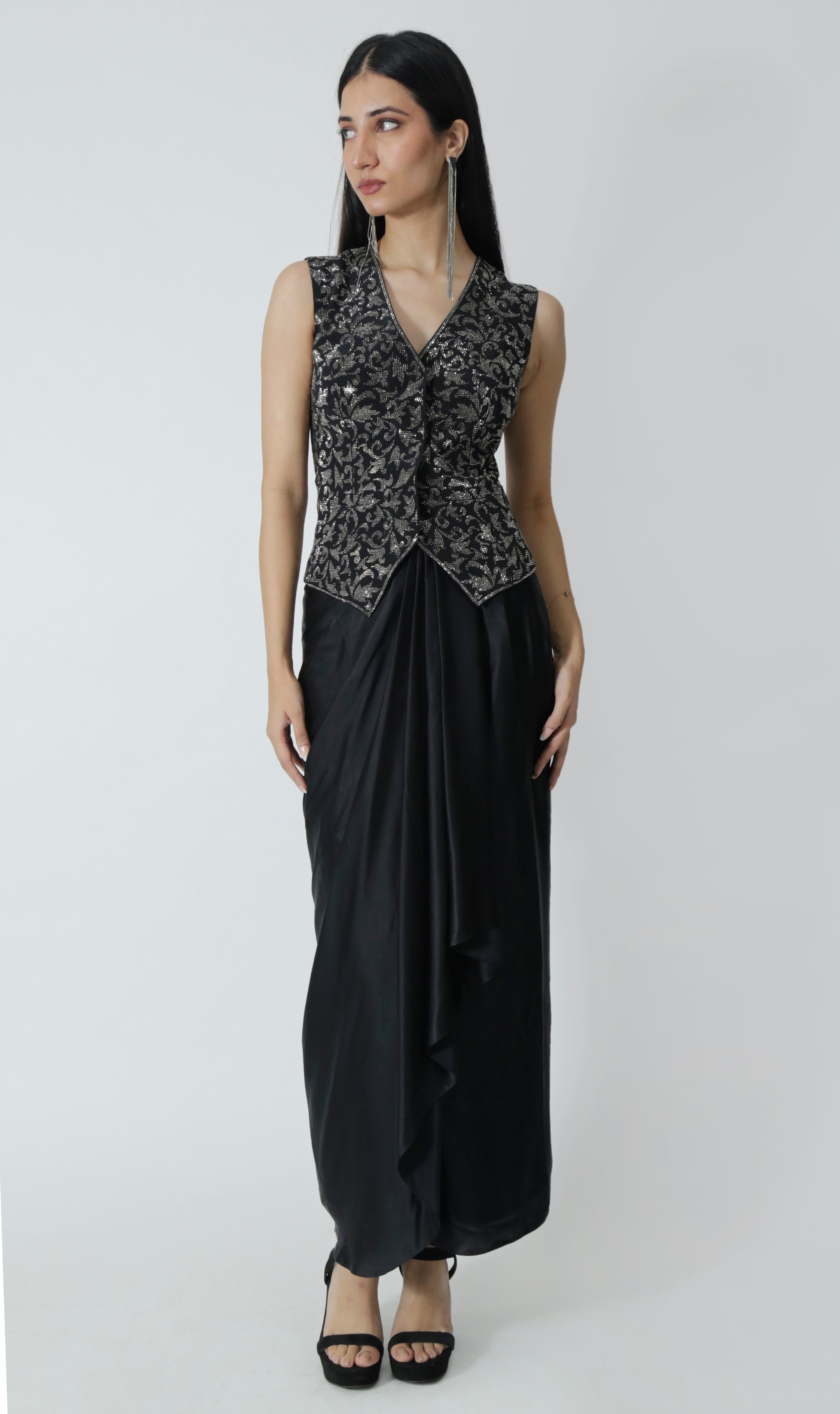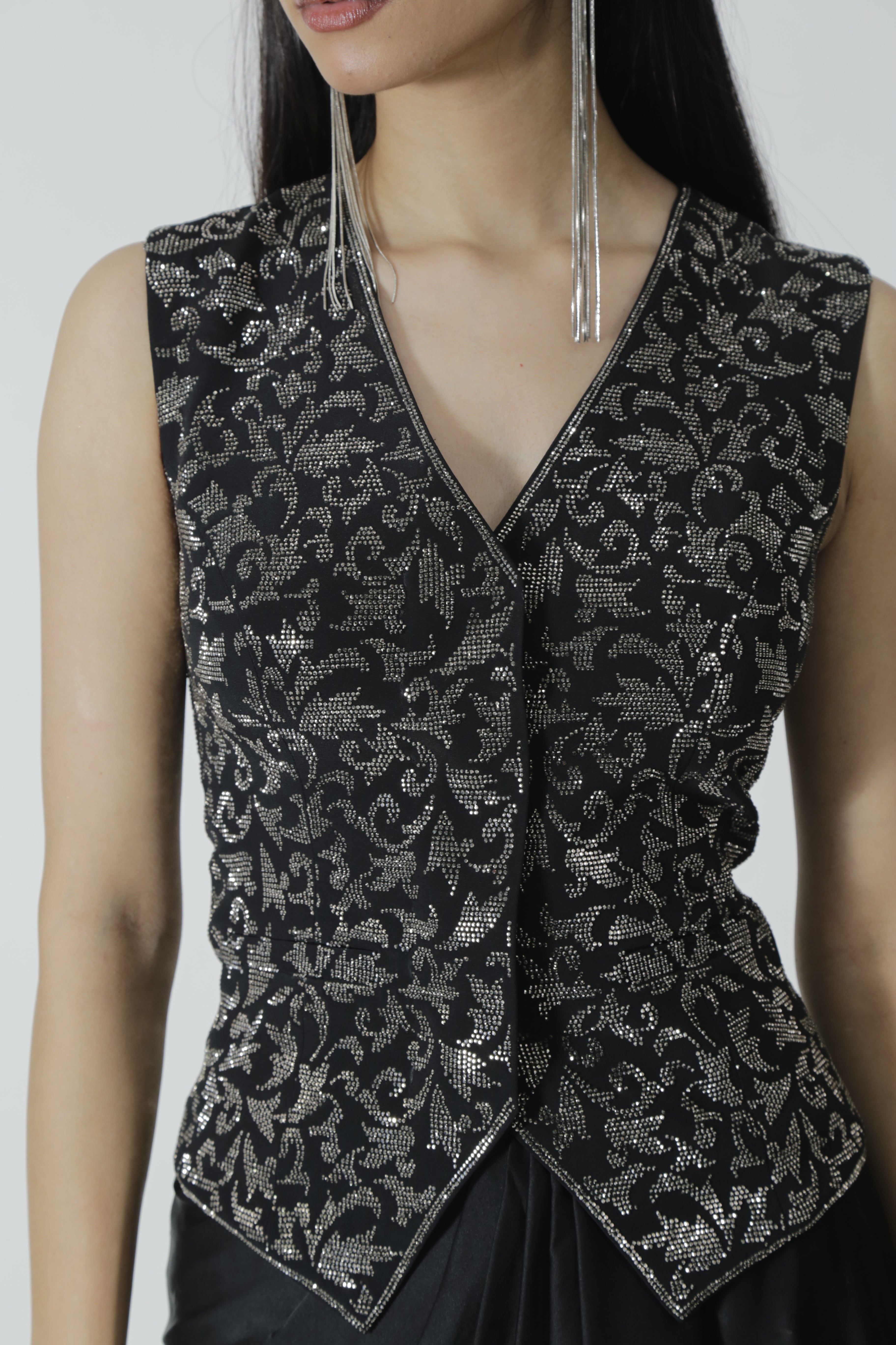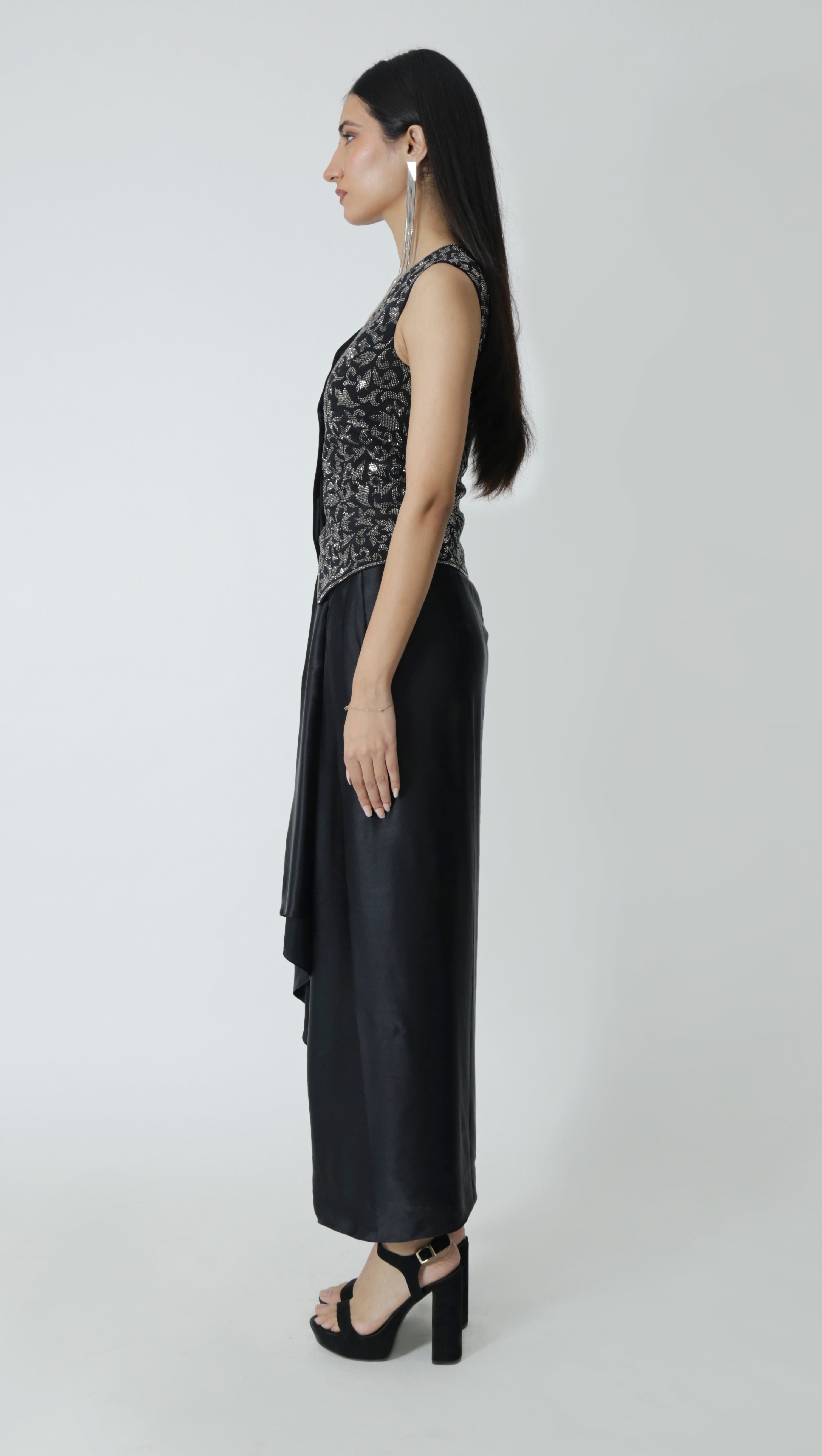 A Black heavy silk crepe waistcoat and silk satin skirt, adorned with shimmering rhinestones.