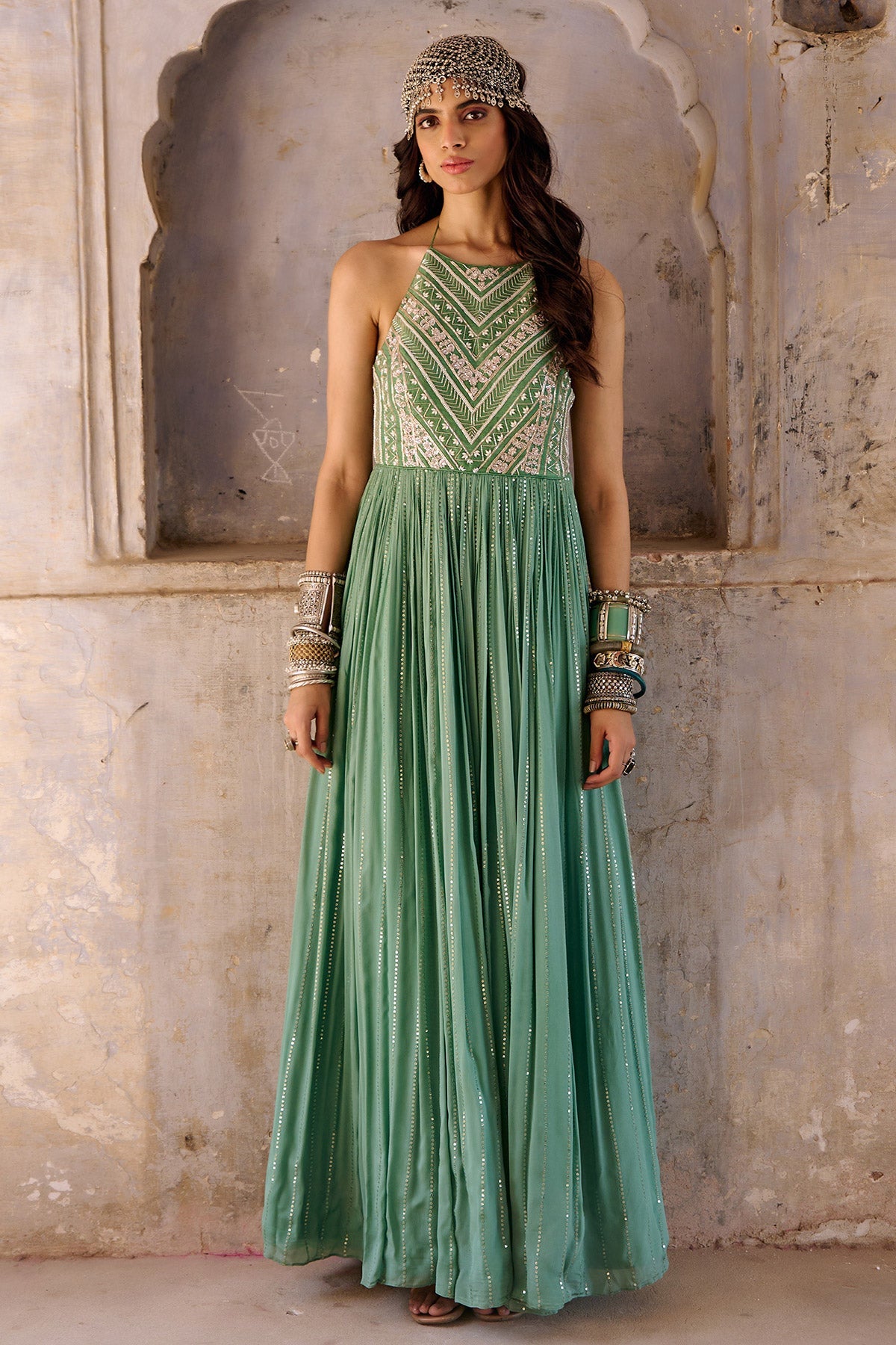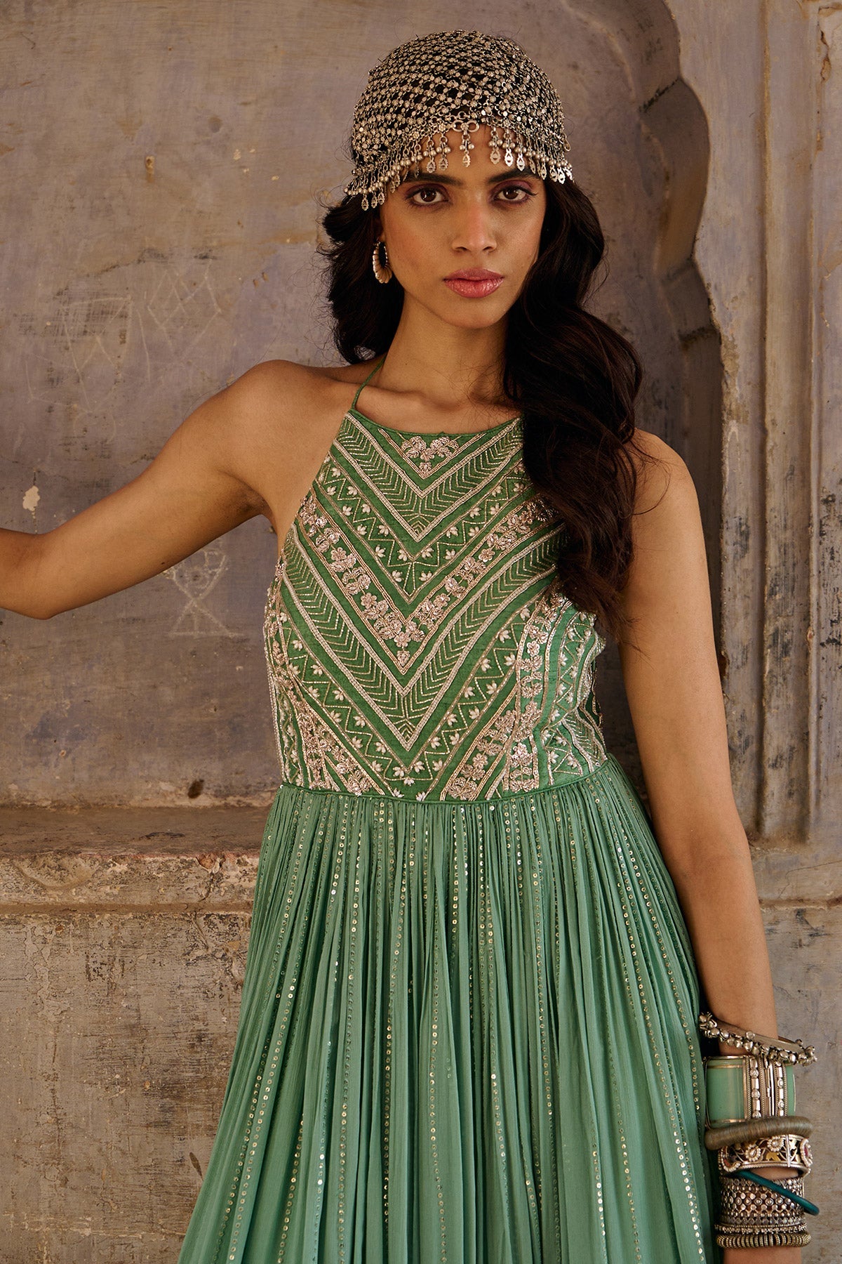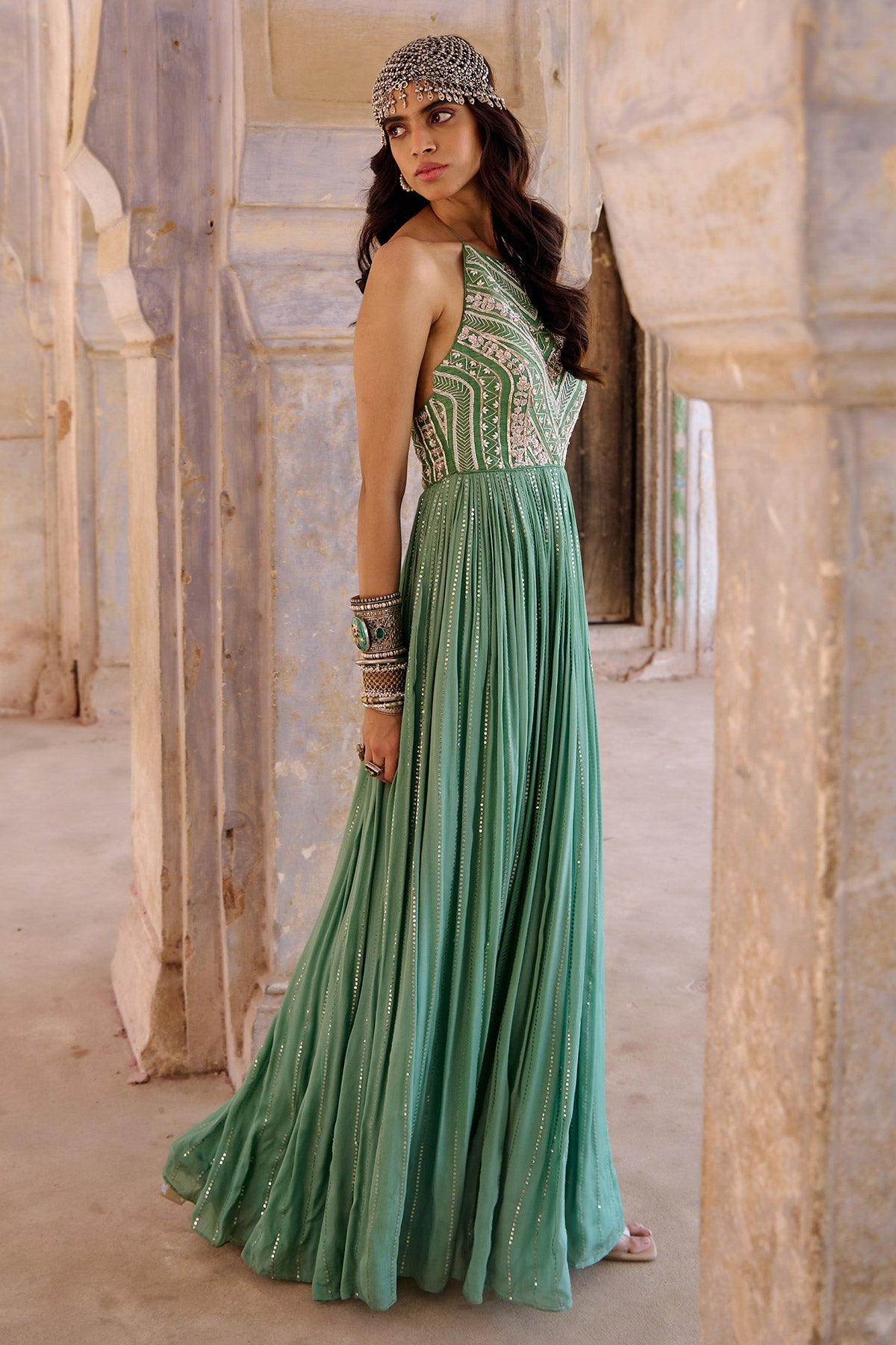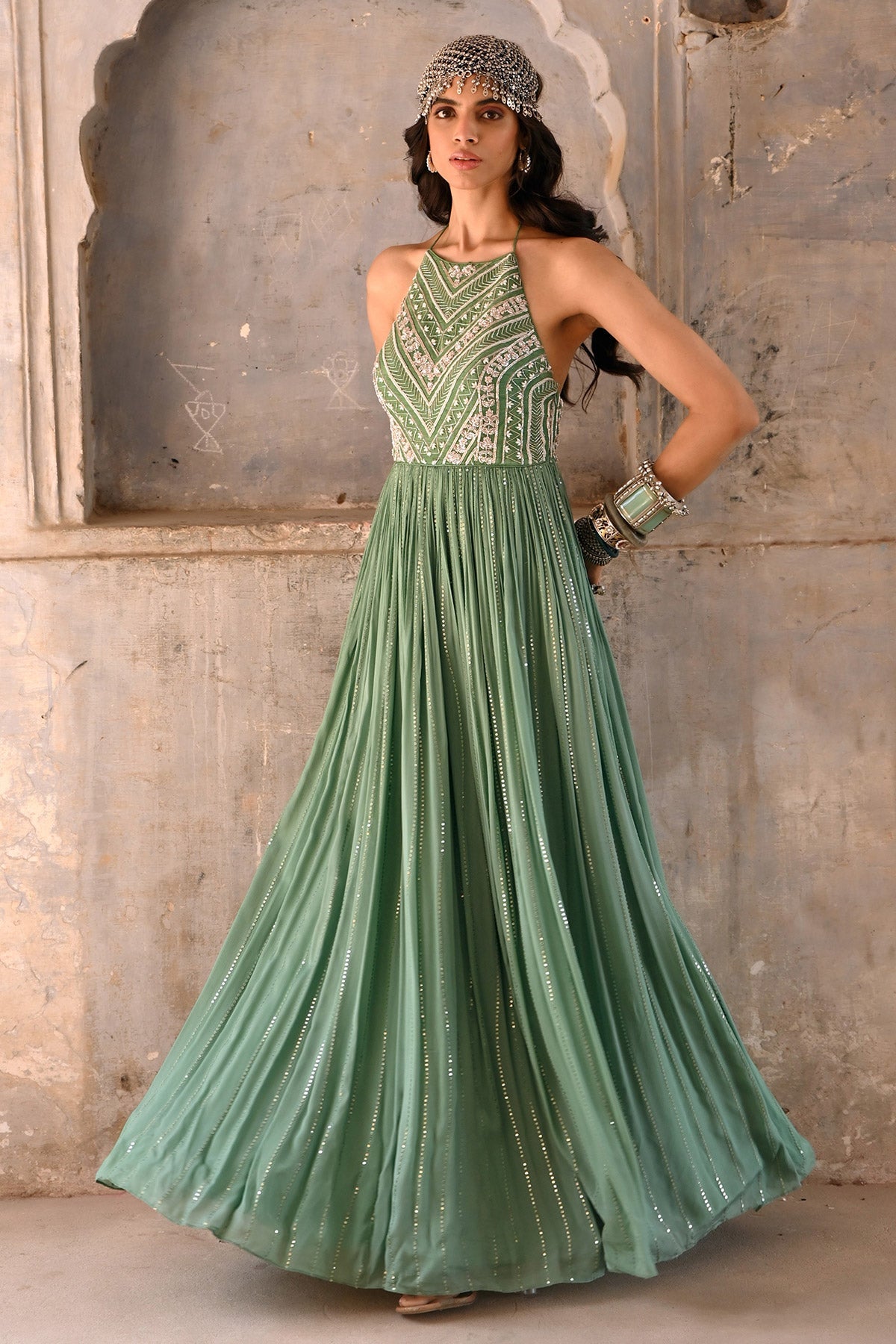 Zardosi and glass beads embroidered bodice with georgette flare.