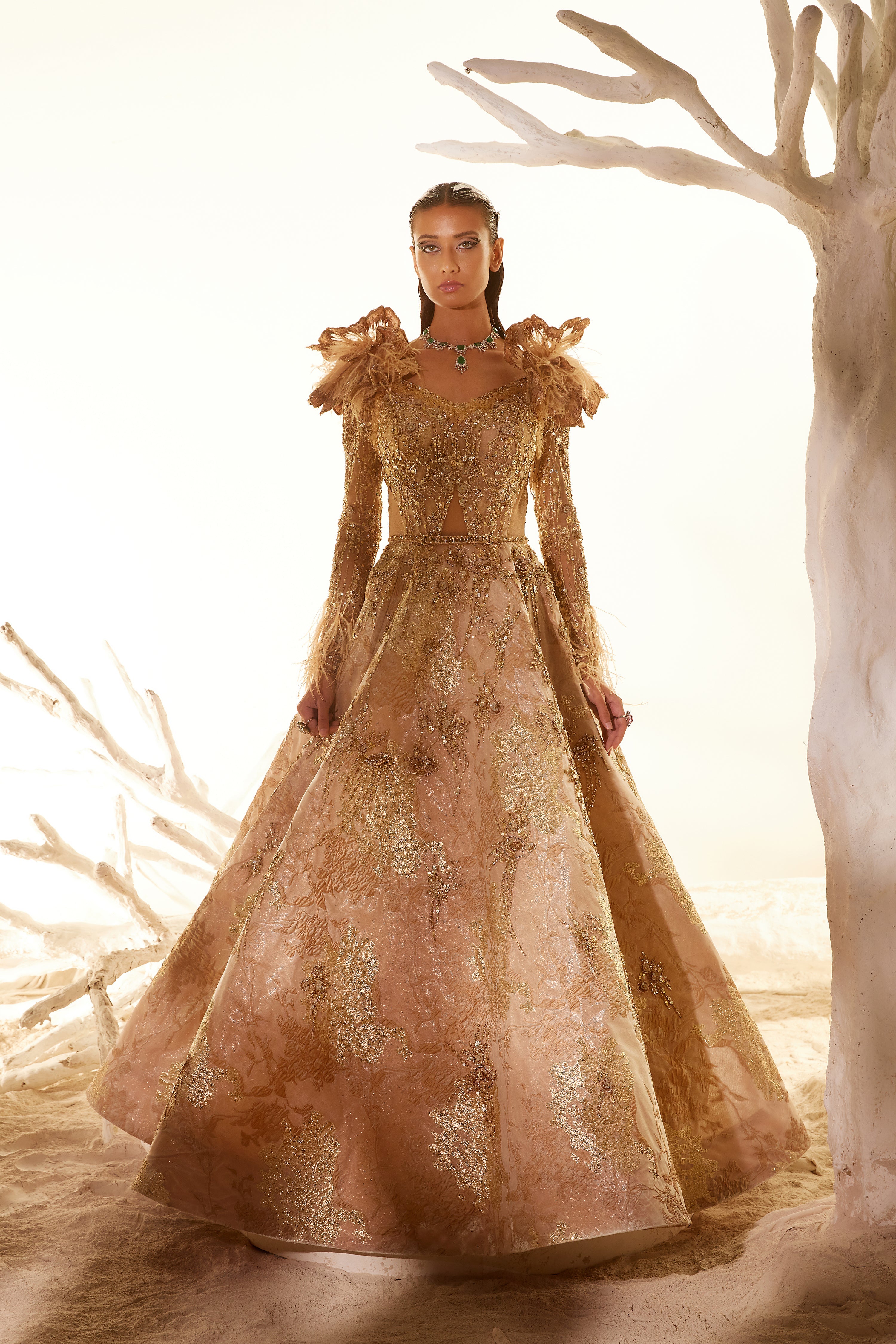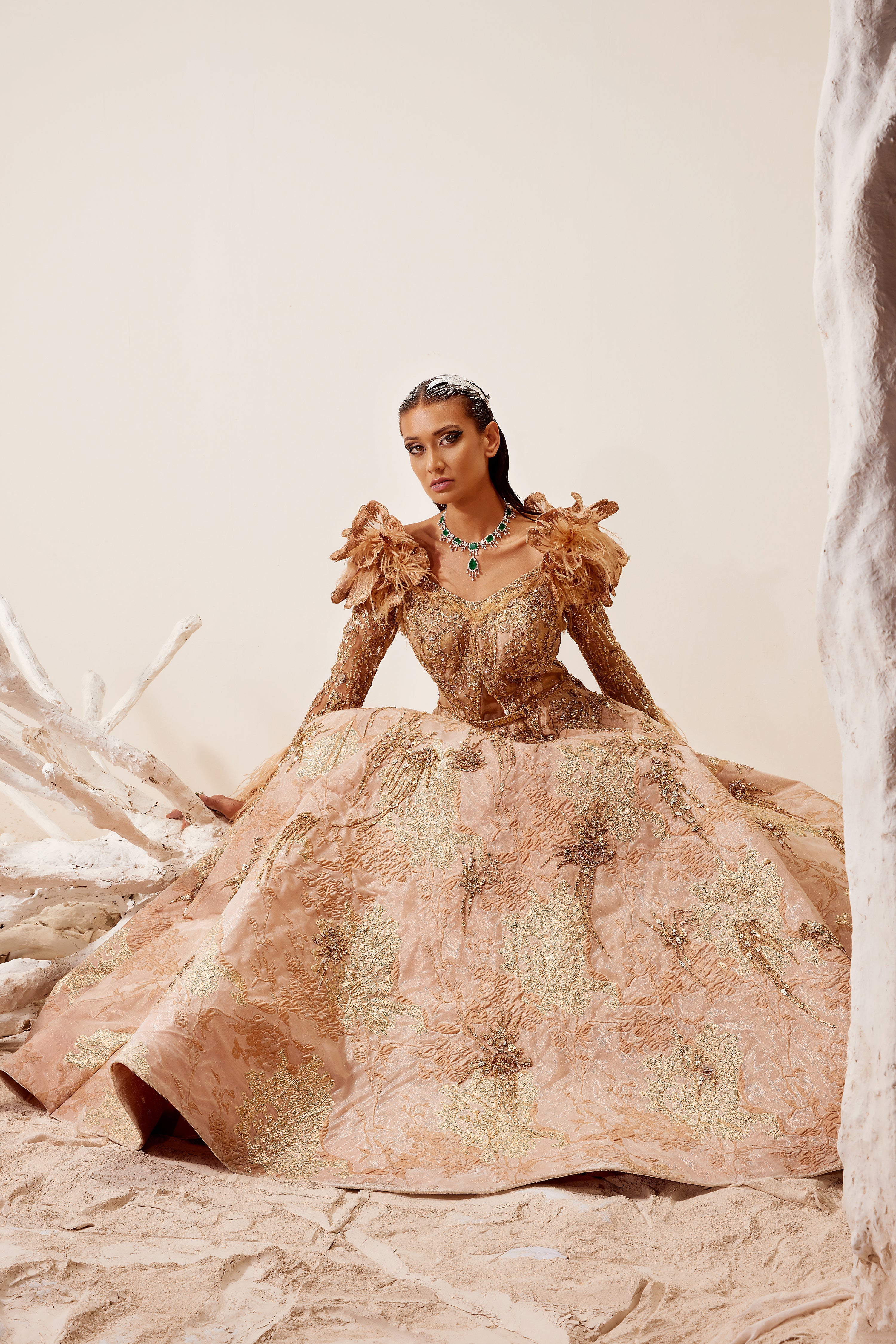 Fairy Dream Gown with enlarged lush petal details on shoulder.