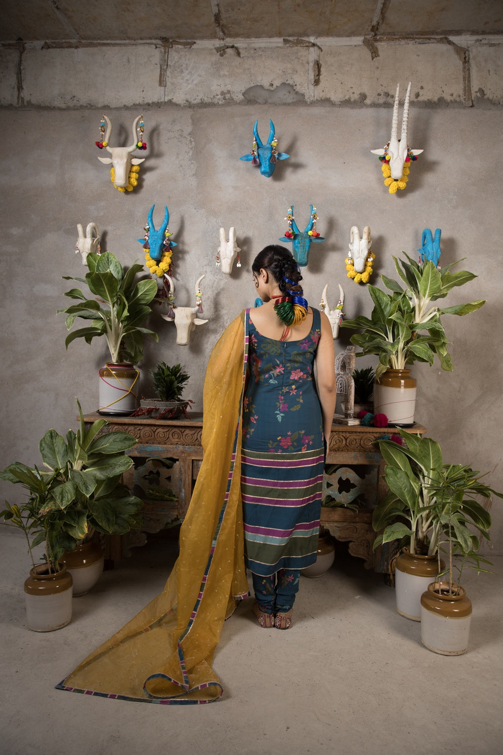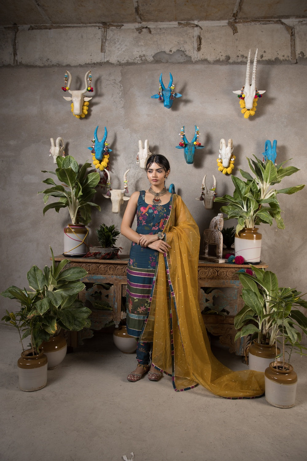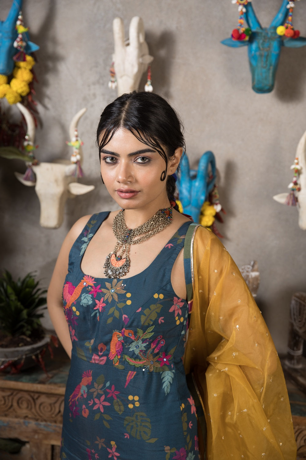 Crown jewel blue kurti set paired with organza dupatta, a regal vestment, unfolds as a magnificiient melange of respledent fabrics and intricate needle work. This arrite is a veritable masterpiece of craftsmanship, perfect for special gatherings and festive occasions.