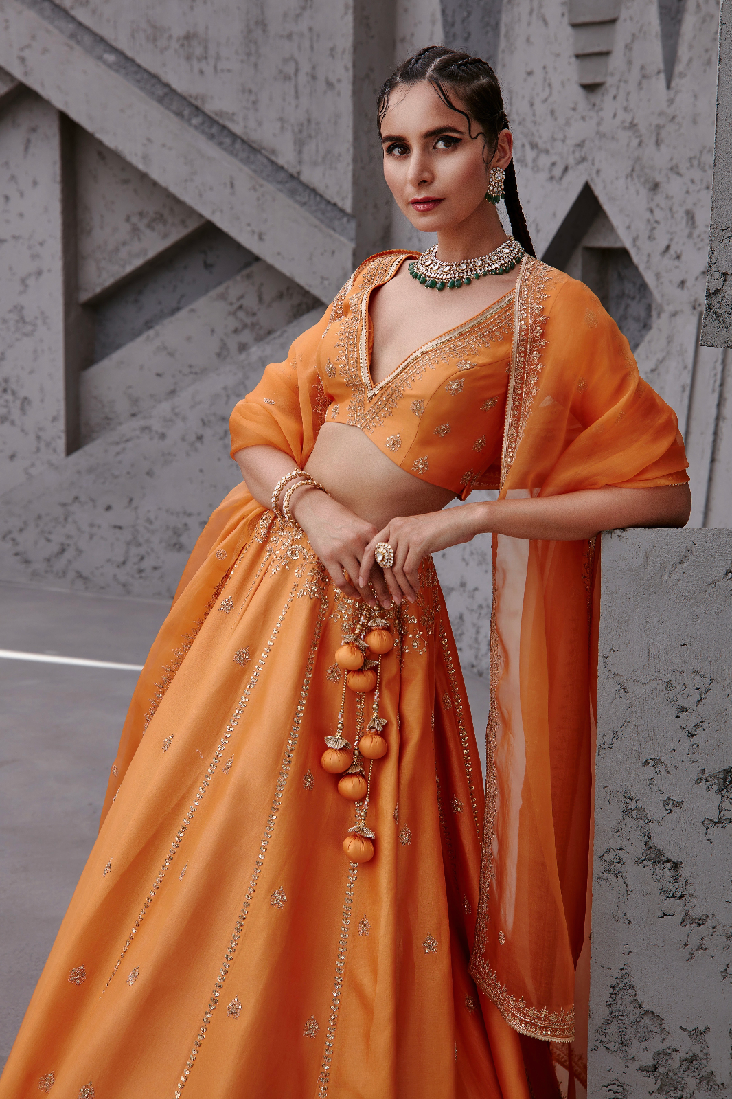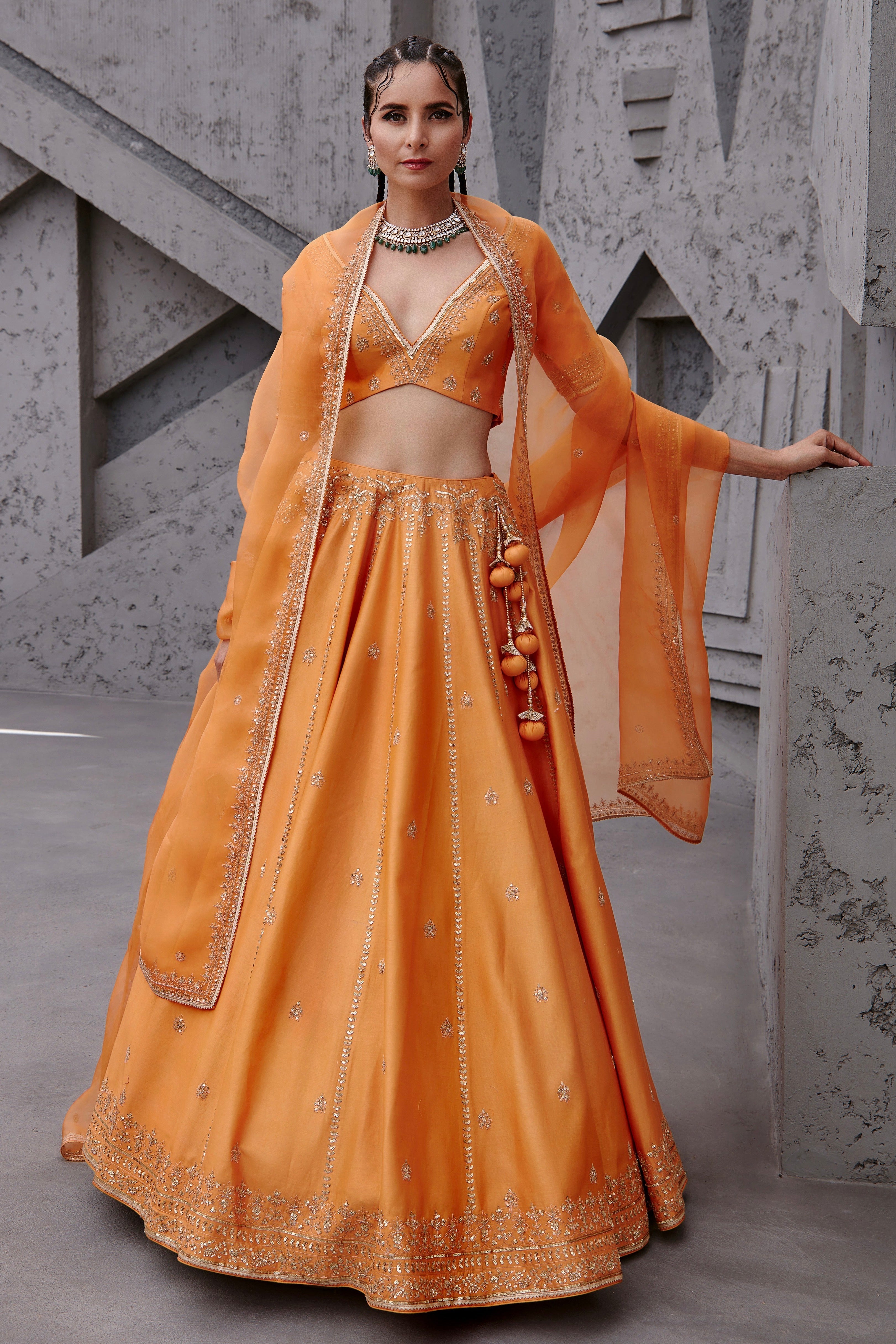 Featuring an orange Chanderi lehenga set paired with an organza base dupatta with light gold dori and aari embroidery