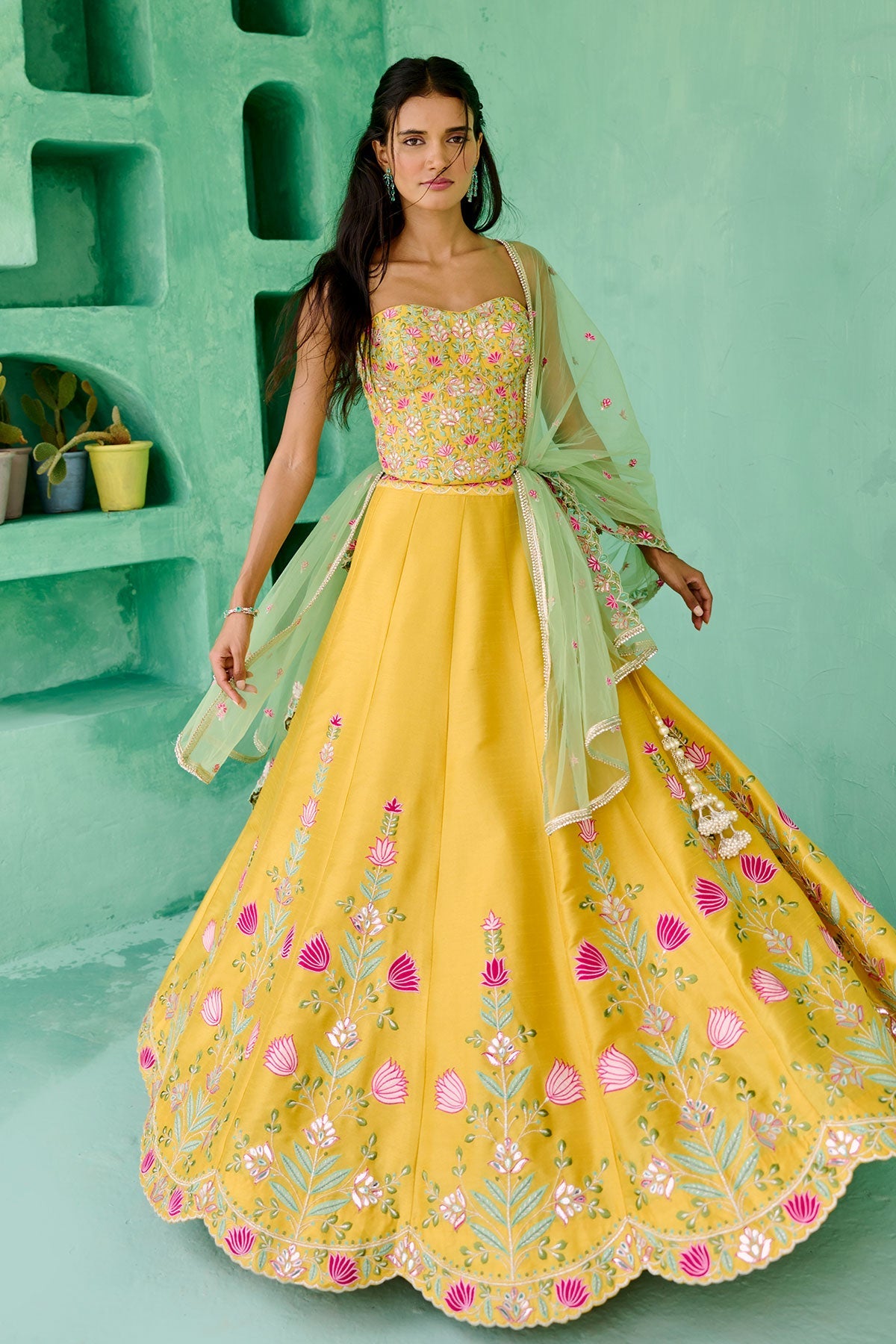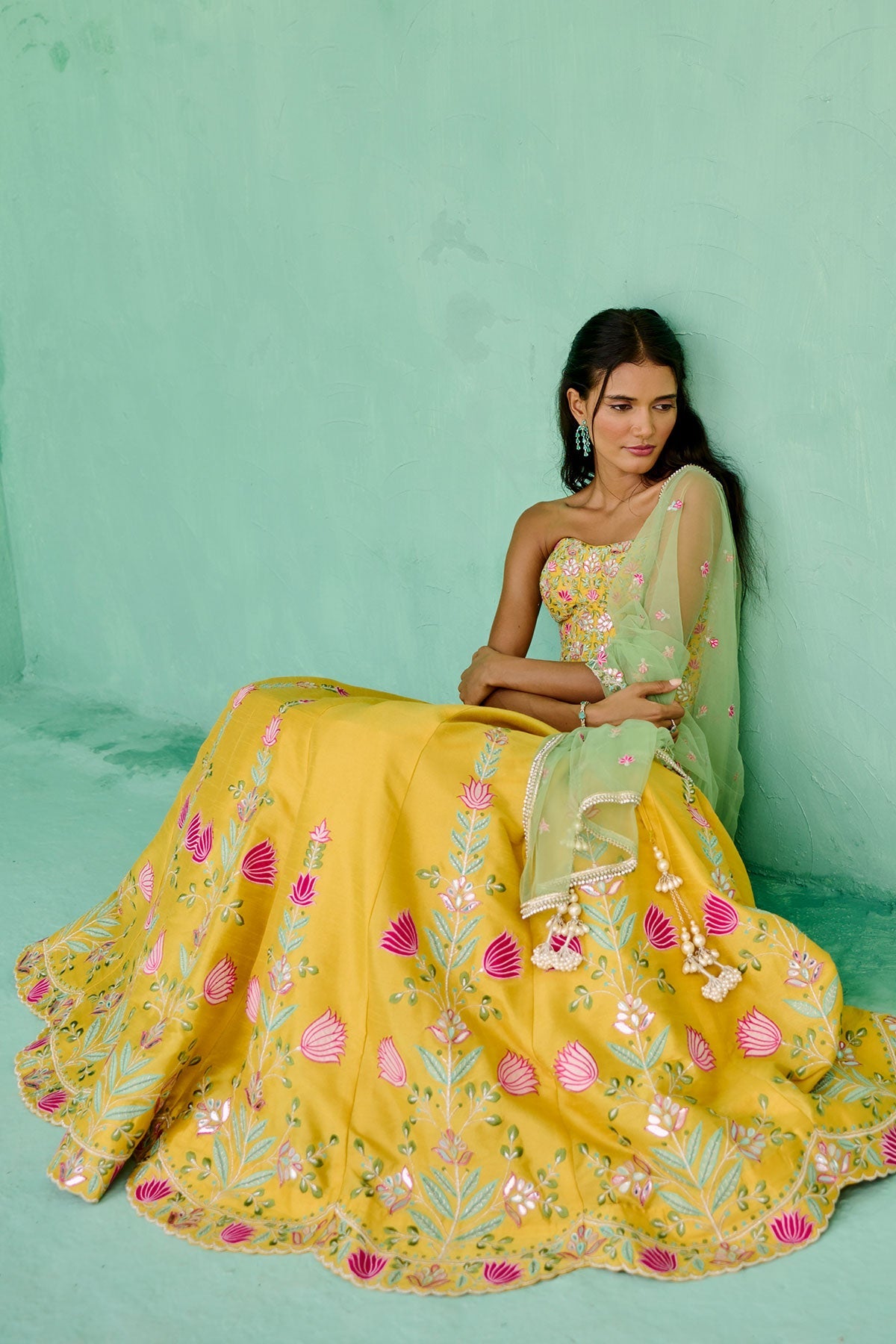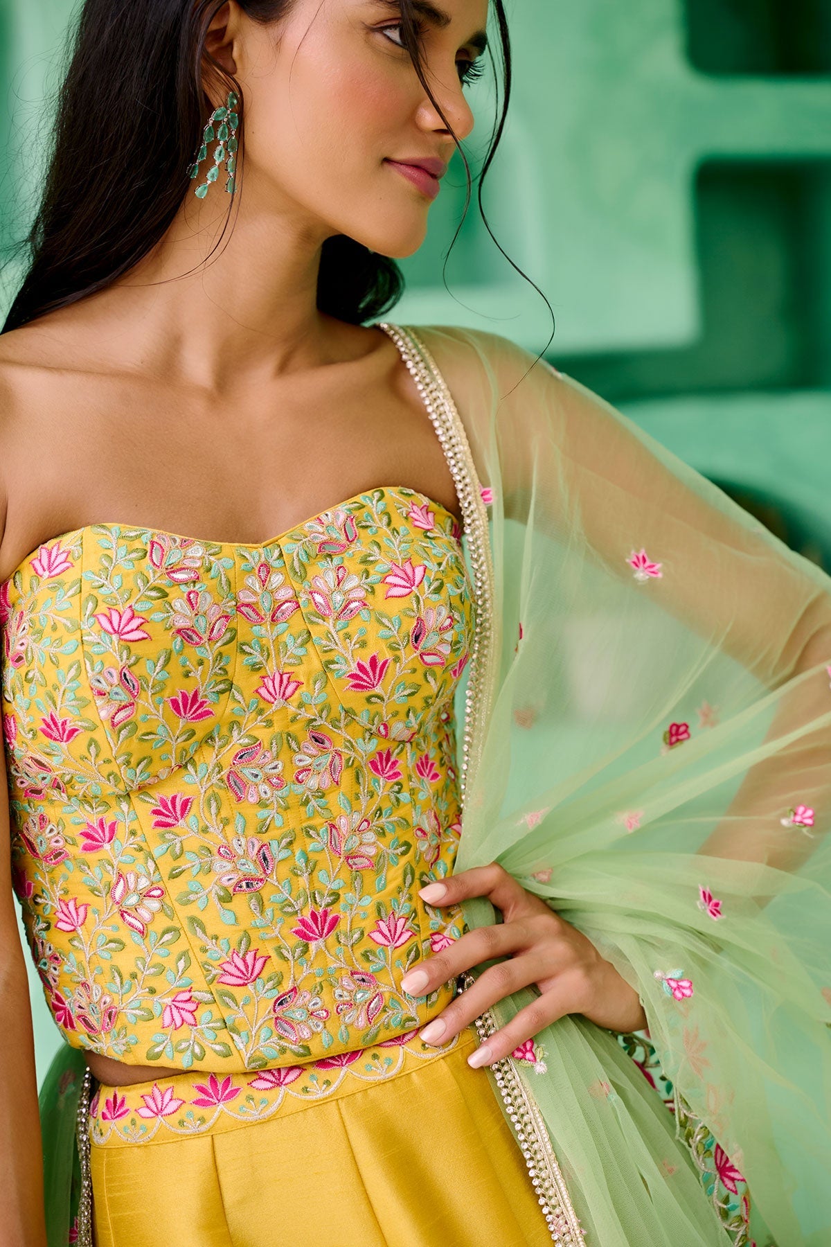 Tulip lehenga and corset blouse with colorful resham and faux metallic leather embroidery paired with contrast green embellished tulle dupatta.