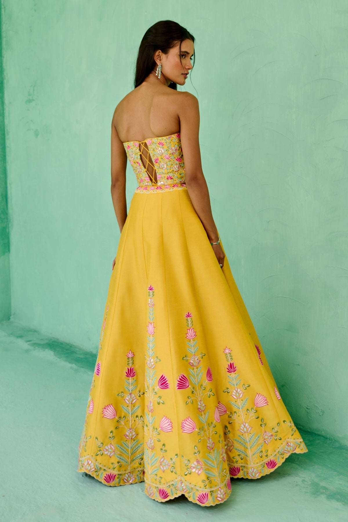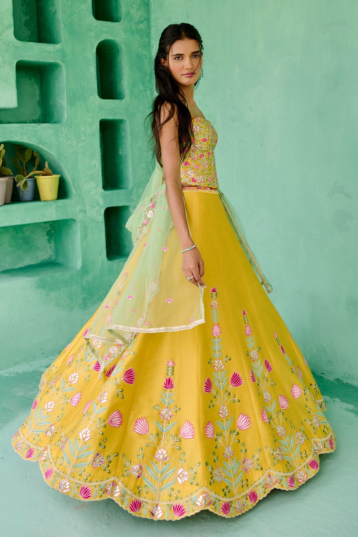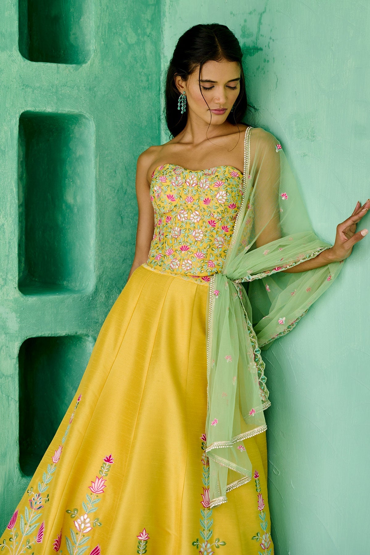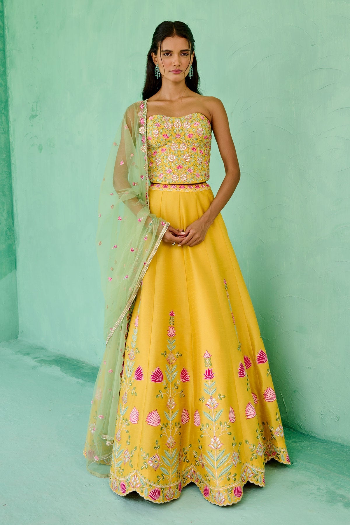 Tulip lehenga and corset blouse with colorful resham and faux metallic leather embroidery paired with contrast green embellished tulle dupatta.